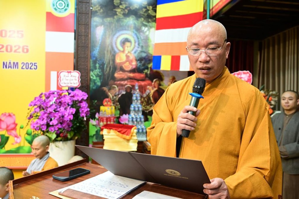 Tiếp đó, Thượng tọa Thích Tục Minh, Ủy viên Dự khuyết HĐTS GHPGVN, Chánh Thư ký Ban Trị sự GHPGVN thành phố Hải Phòng, đã trình bày báo cáo tóm tắt tổng kết công tác Phật sự năm 2025 và phương hướng hoạt động Phật sự năm 2026.