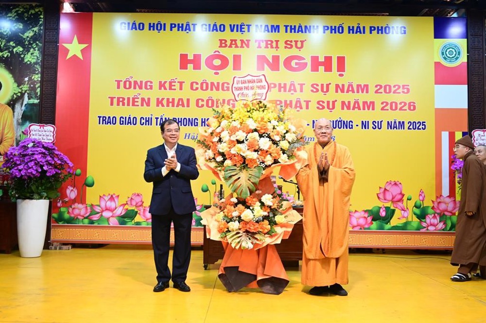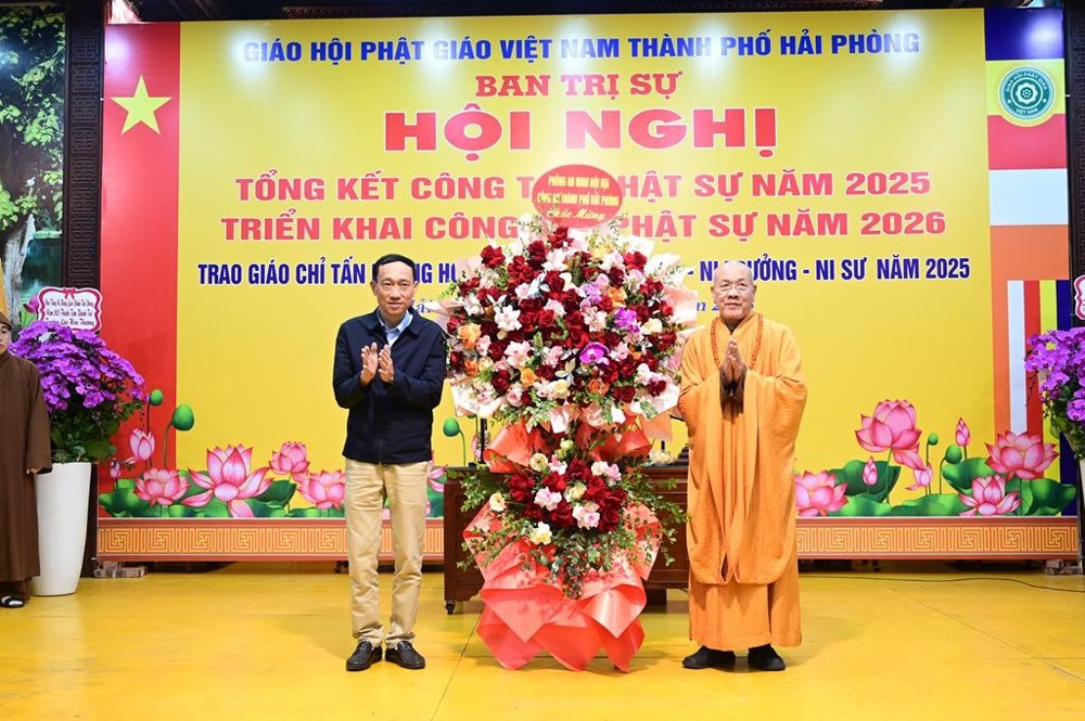 Phát biểu tại Hội nghị, ông Nguyễn Minh Hùng, Thành ủy viên, Phó Chủ tịch UBND thành phố Hải Phòng, đánh giá cao những thành tựu mà Ban Trị sự GHPGVN thành phố Hải Phòng đã nỗ lực đạt được trong năm qua; đặc biệt sau khi sáp nhập đơn vị hành chính hai cấp, Ban Trị sự GHPGVN thành phố Hải Phòng và Ban Trị sự GHPGVN tỉnh Hải Dương đã nhanh chóng kiện toàn nhân sự, hoạt động ổn định theo đúng chỉ đạo của Trung ương Giáo hội, hoàn thành tốt các Phật sự năm 2025, trong đó công tác từ thiện – an sinh xã hội đạt hơn 72 tỷ đồng.
