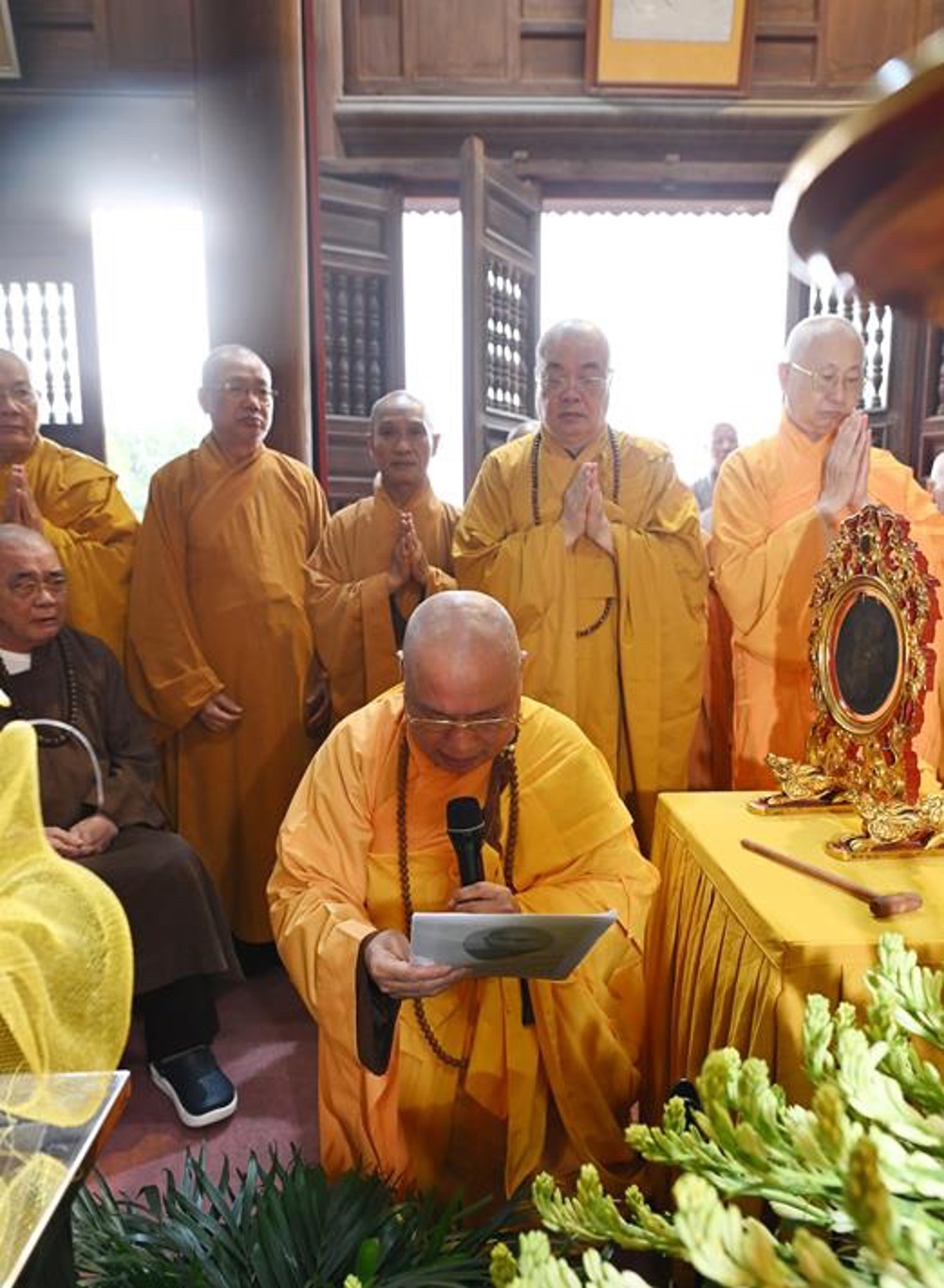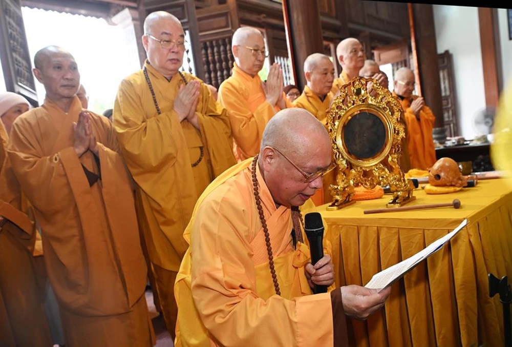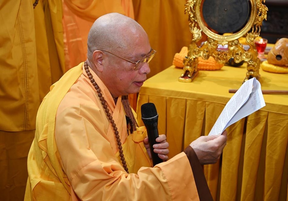 Hoà thượng Thích Thanh Giác Trụ trì chùa Long Hoa tuyên đọc tiểu sử cố Trưởng lão Hoà thượng Thích Tâm An