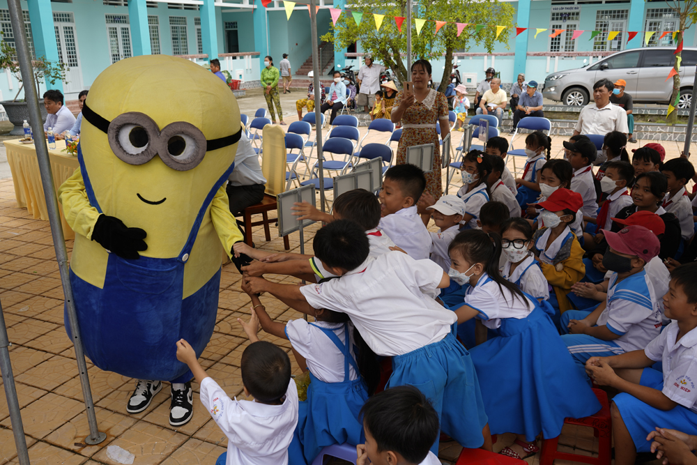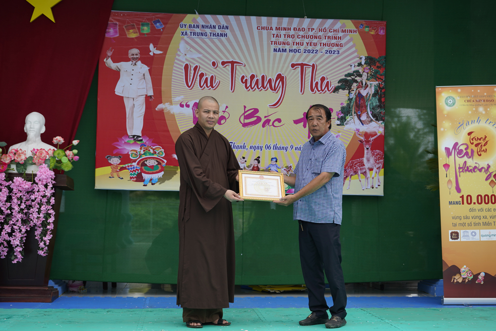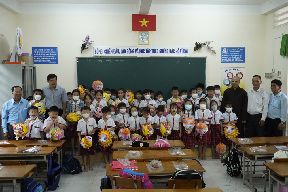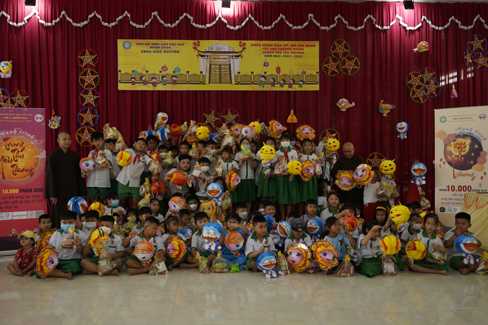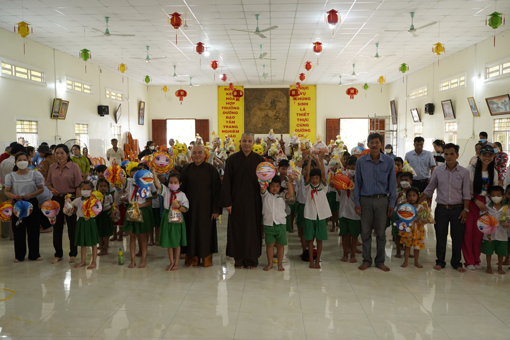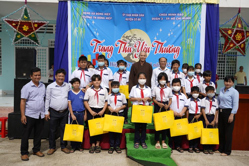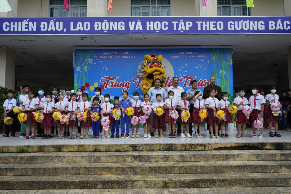 Phần quà gồm bánh trung thu, lồng đèn, cùng đồng phục và các suất học bỗng cho các em có hoàn cảnh khó khăn… tại Trường Tiểu học Trung An (2.000 phần), chùa Giác Nguyên (1.000 phần) và Trường THCS Trung Thạnh (1.500 phần).