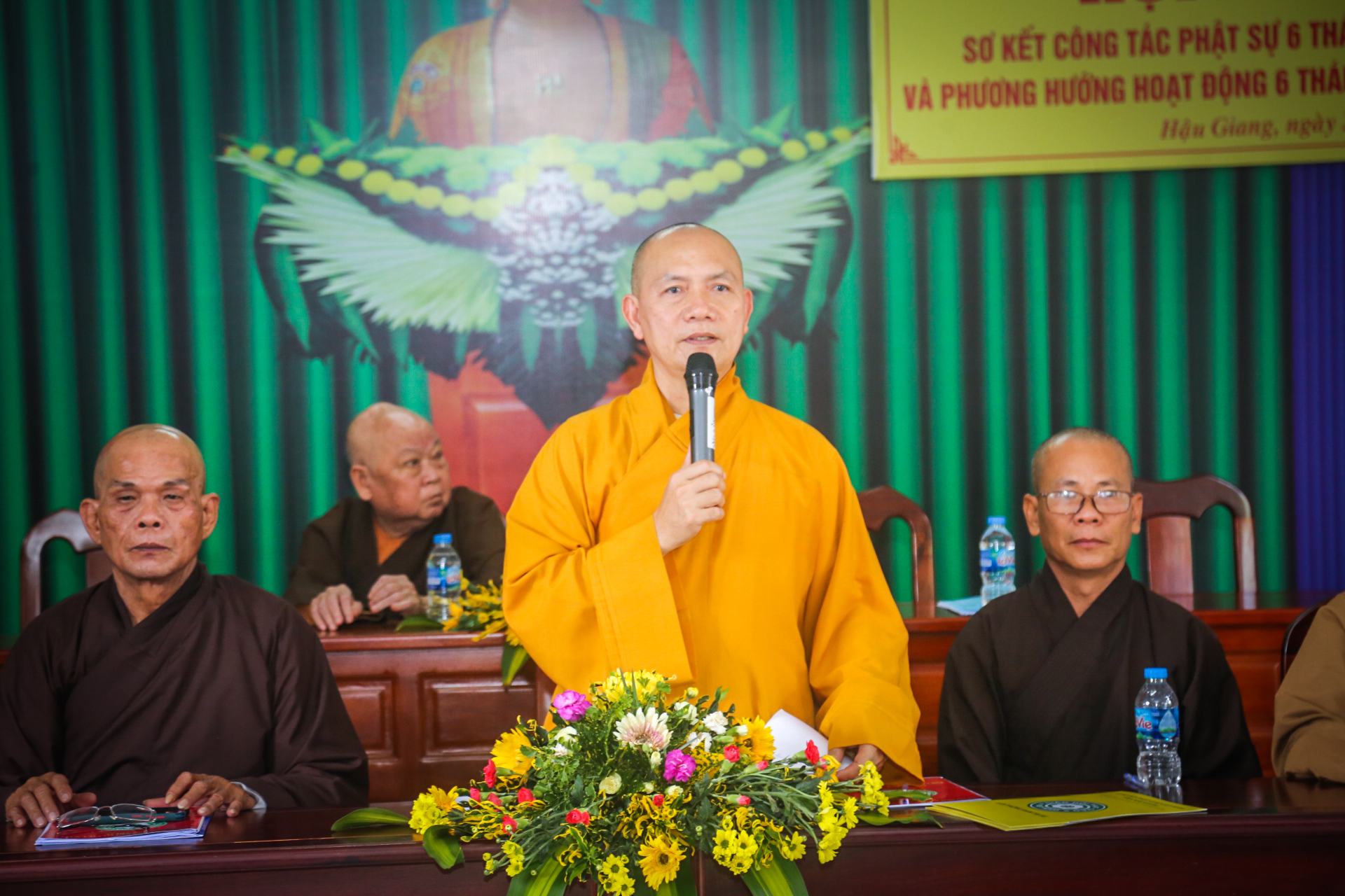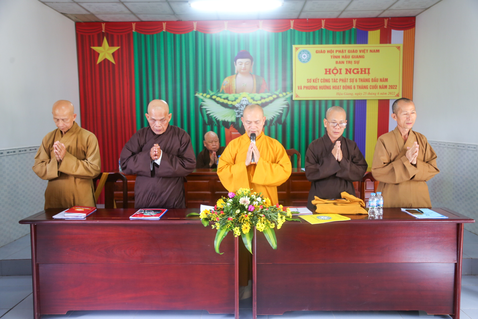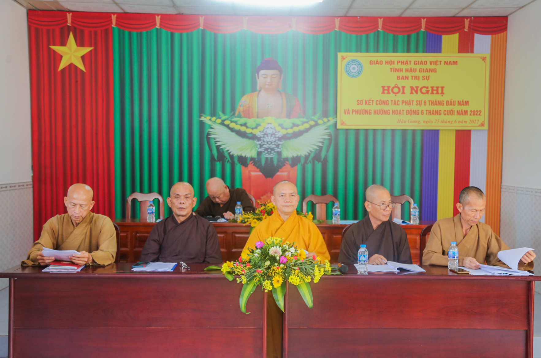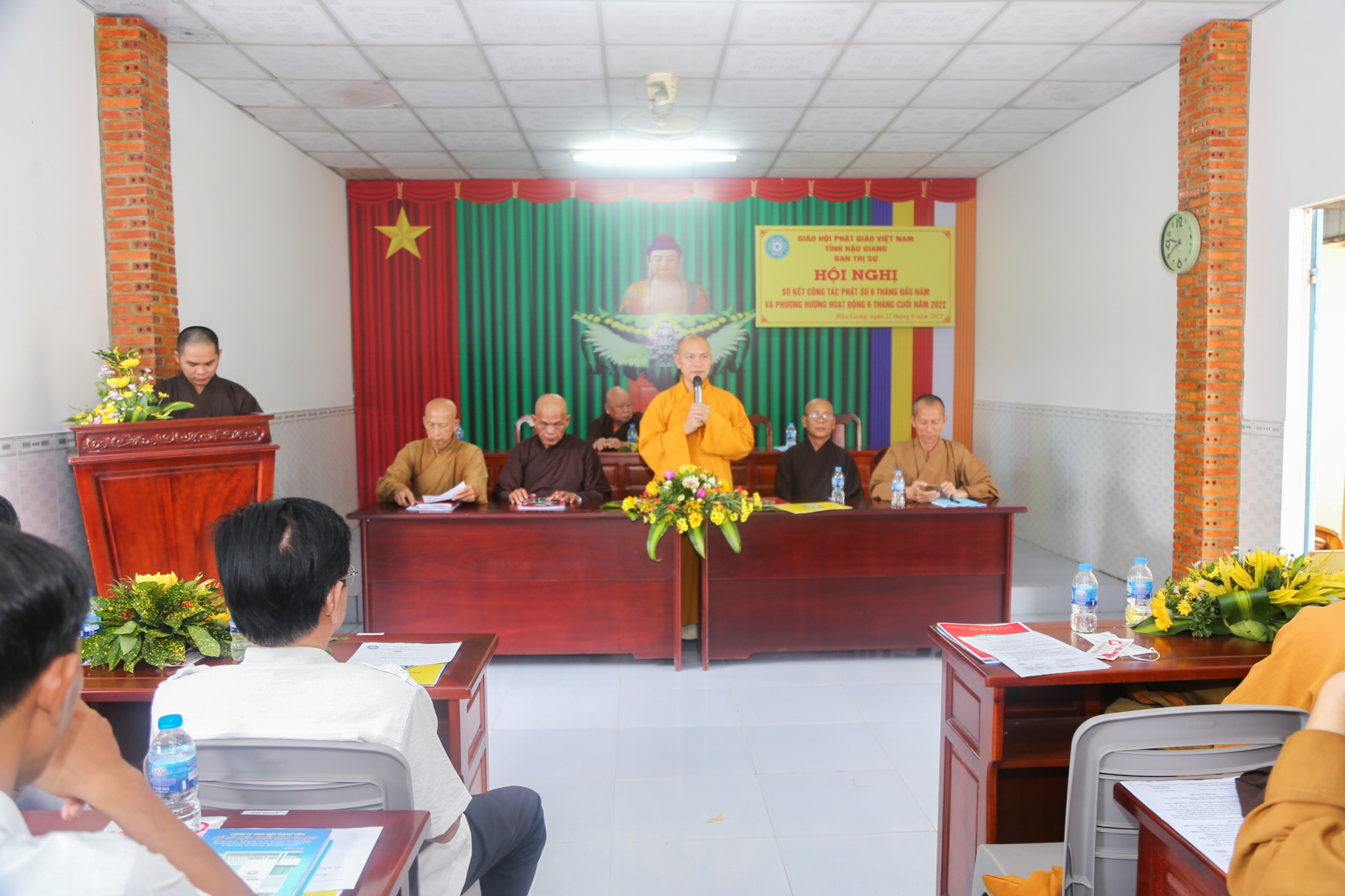 Thay mặt Ban Thư ký, ĐĐ. Thích Quảng Nguyên – Phó thư ký, Trưởng ban Hưởng dẫn Phật tử trình báo cáo công tác Phật sự trong 6 tháng đầu năm. Hiện tại Phật giáo tỉnh có 82 ngôi Tự viện với 297 Tăng Ni. Được sự chỉ đạo của Hội đồng Trị sự GHPGVN và sự quan tâm, giúp đỡ của chính quyền Ban trị sự Phật giáo tỉnh đã tổ chức thành công Đại hội Đại biểu Phật giáo tỉnh Hậu Giang lần thứ X, nhiệm kỳ 2022 – 2027. Theo thông bạch của TW Giáo hội, Ban Trị sự tỉnh hướng dẫn Ban Trị sự các huyện, thị, thành, các cơ sở Tự viện, Tăng Ni, Phật tử trong tỉnh tổ chức Đại lễ Phật đản PL.2566 trang nghiêm theo đúng truyền thống của Phật giáo. Trong thời gian qua Ban Trị sự tỉnh cùng Ban Tăng sự tỉnh Hậu Giang đã khai giảng khóa An cư Kiết hạ PL2566 – DL 2022. Trường hạ Tăng tại chùa Vĩnh Hiệp (TP. Ngã Bảy), Trường hạ Ni tại chùa Quốc Thanh (TP. Vị Thanh), Phật giáo Nam Tông An cư tại 15 chùa Nam tông Khmer. Do TT. Thích Phước Thành làm Thiền chủ, TT. Thích Thông Hạnh, ĐĐ. Danh Tuấn đồng Phó Thiền chủ. Đồng thời, nhầm tăng sự đoàn kết hòa họp và bồi dưỡng nghiệp vụ cho chứ Tôn đức Ban Trị sự tỉnh đã tổ chức “Tuần Lễ An cư” danh cho cho chư Tôn đức trụ trì. Thể hiện tinh thần từ bi, cứu khổ ban vui của Phật giáo Ban Trị sự tỉnh cùng Tăng Ni, Phật tử và các nhà hảo tâm đã tổ chức nhiều hoạt động Từ thiện Xã hội với tổng kinh phí gần 2 tỷ đồng.