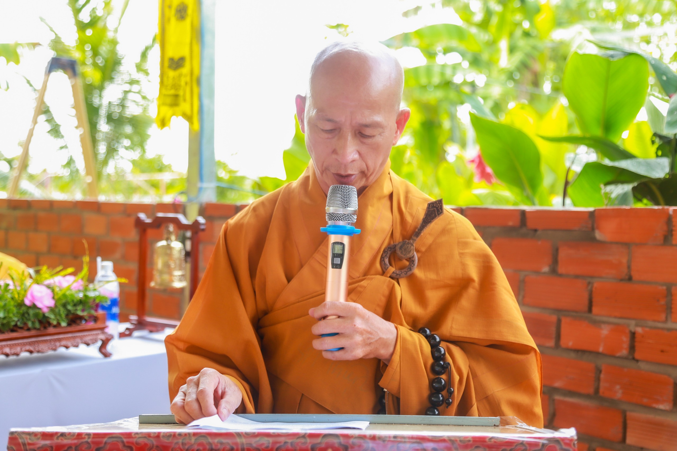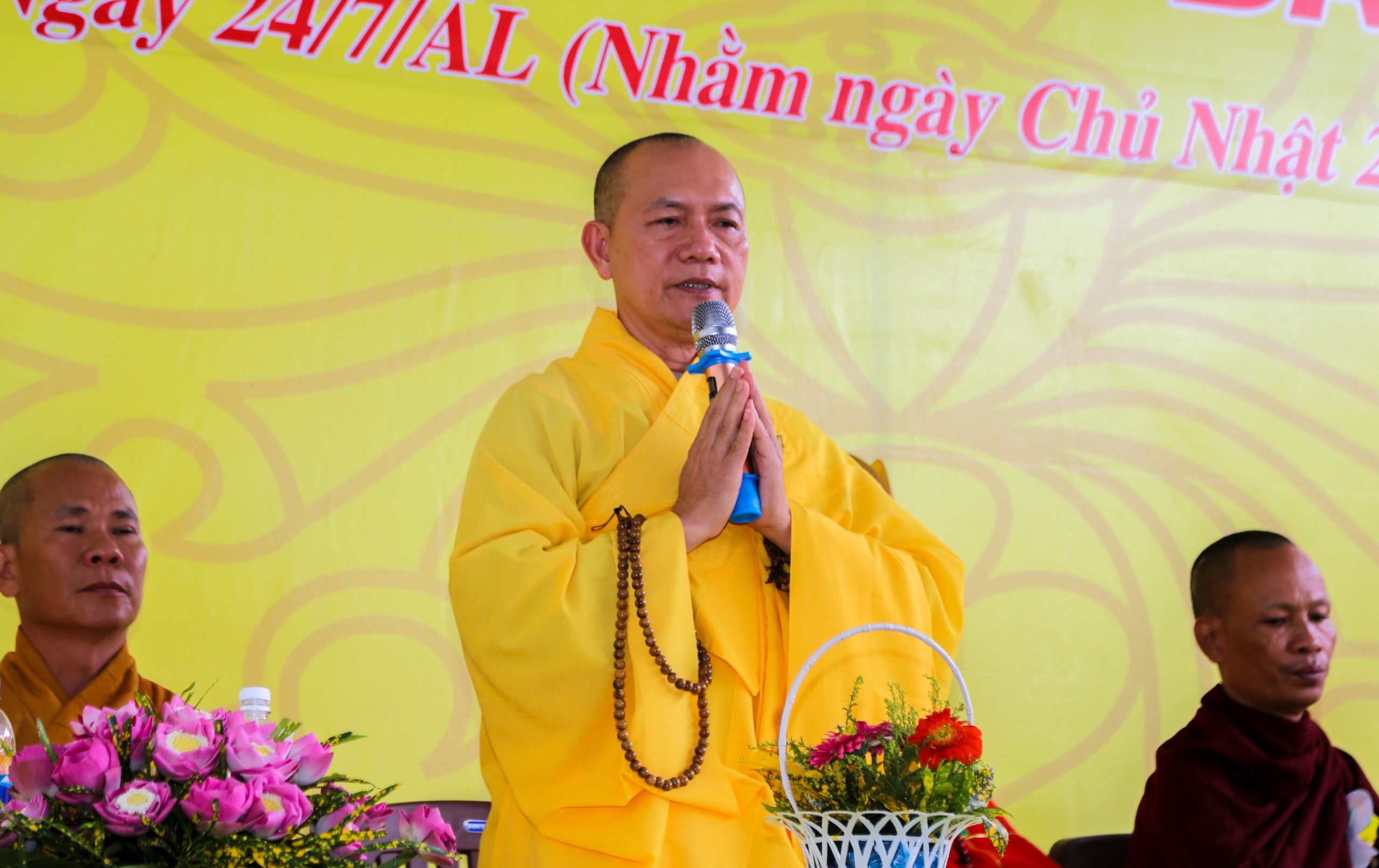 Thay mặc Thường trực Ban Trị sự tỉnh, TT. Thích Phước Thành phát biểu tri ân những đóng góp to lớn của cố Trưởng lão Hòa thượng dành cho đạo pháp và dân tộc. Với công đức đó, Thượng tọa mong rằng môn đồ pháp quyến của cố Hòa thượng sẽ tiếp tục kế thừa và phát triển cùng Phật giáo tỉnh nhà xây dựng ngôi nhà chung giáo hội. Đồng thời, Thượng Tọa tán dương tinh thần hộ trì Phật pháp của Quý Phật tử, đã nhín ăn bớt mặc để dâng lên cúng dường pháp y ca sa lên Chư Tăng Ni nhân mùa Vu lan Báo hiếu. Hôm nay chư Tăng, Ni thọ nhận Pháp y này và nguyện cầu mười phương chư Phật gia hộ cho quý vị cùng gia đình luôn được thân tâm thường lạc, vạn sự kiết tường như ý.