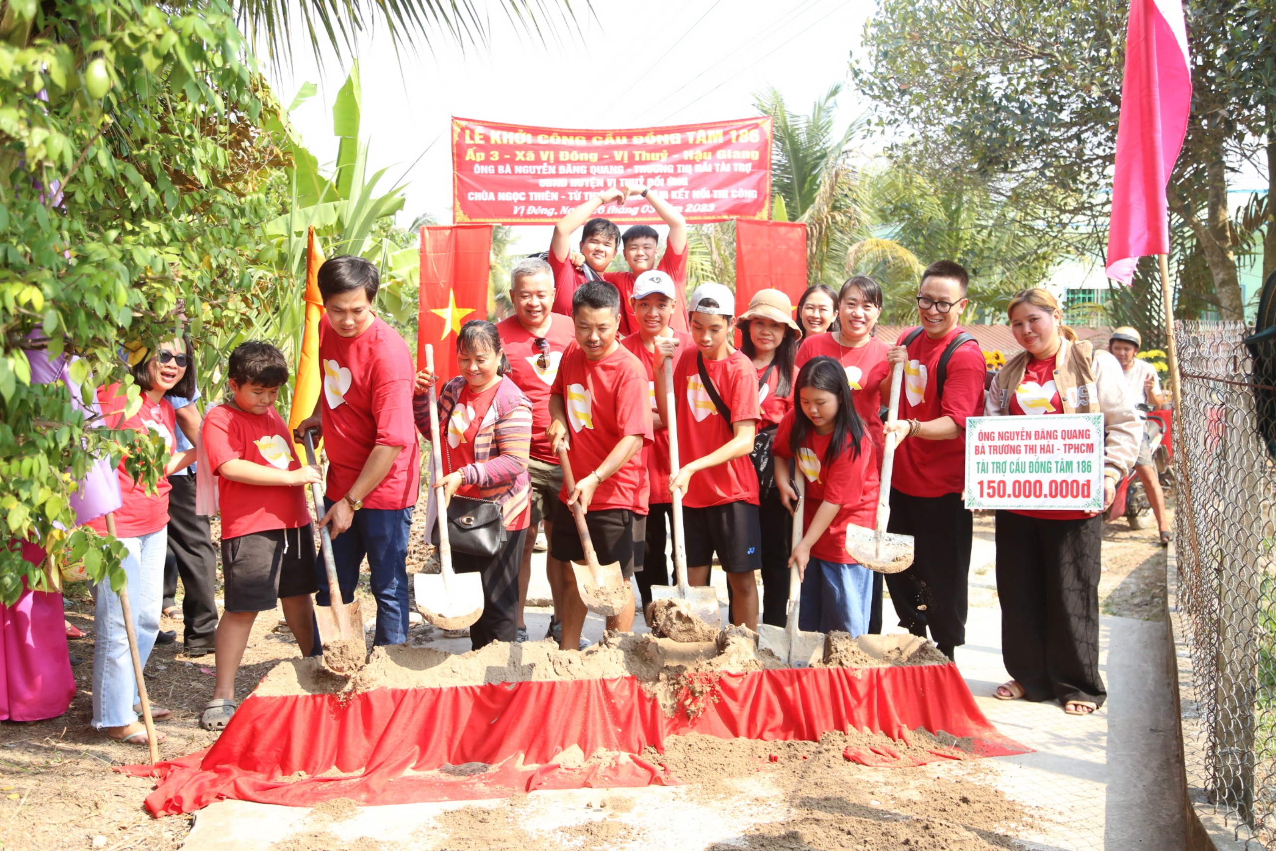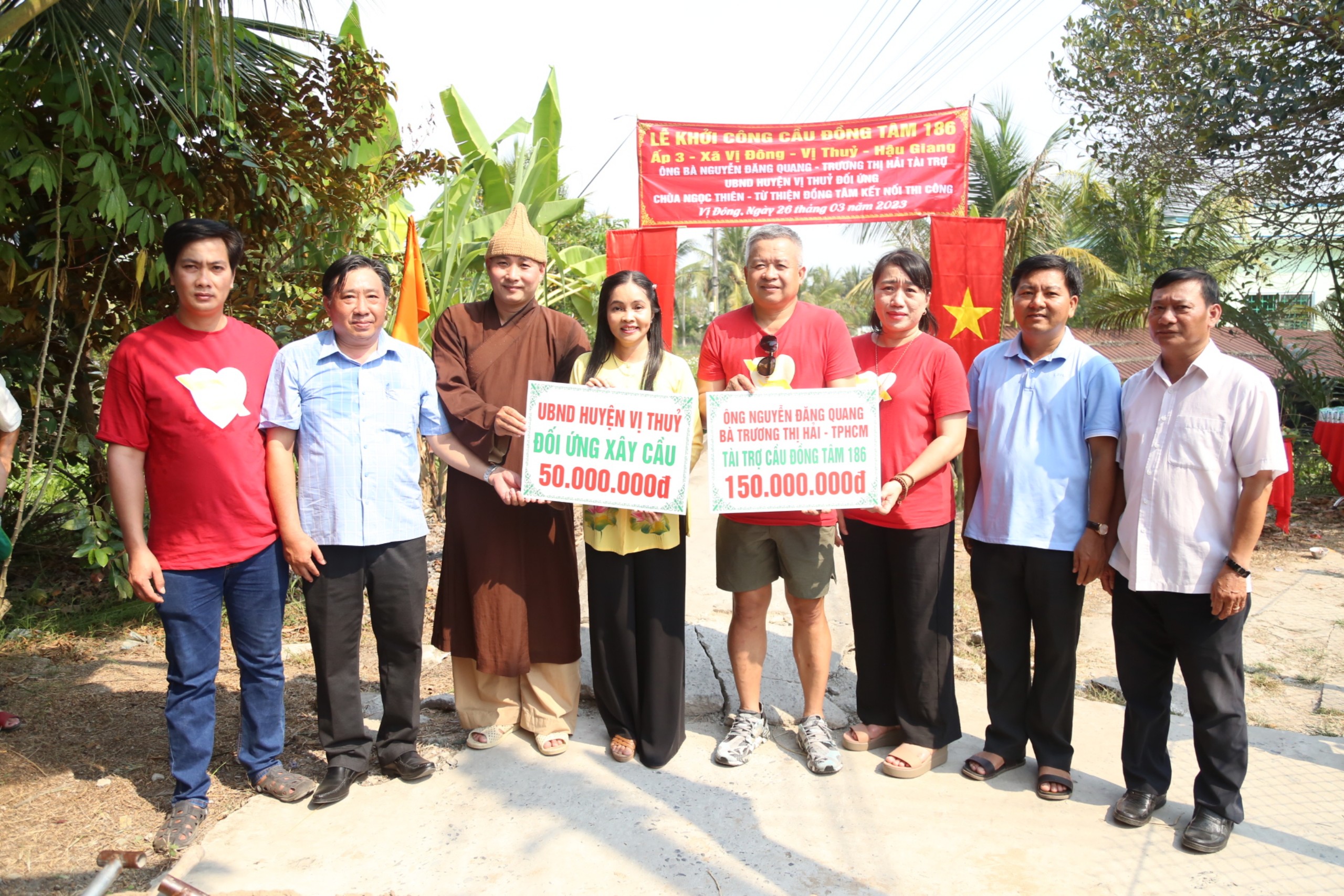 PSO - Chiều ngày 26/03/2023 (nhằm ngày 5/2 Quý Mão) tại ấp 3, xã Vị Đông, huyện Vị Thủy, tỉnh Hậu Giang, Ban TT-XH GHPGVN huyện Châu Thành, Hội từ thiện Đồng Tâm (TP. HCM) cùng mạnh thường quân và chính quyền địa phương tổ chức lễ khởi công cầu giao thông nông thôn Đồng Tâm số 186. Tham dự lễ khởi công có ĐĐ. Thích Phước Thuận – Ủy viên BTS tỉnh Hậu Giang, Trưởng ban Từ thiện xã hội Phật giáo huyện Châu Thành; bà Nguyễn Ngọc Mai – Chủ nhiệm Hội từ thiện Đồng Tâm và gia đình ông Nguyễn Đăng Quang – Nhà tại trợ chính. Đại diện chính quyền có ông Nguyễn Thanh Phong – Ủy viên Ban chấp hành Đảng bộ tỉnh Hậu Giang, Bí thư huyện Vị Thủy cùng đại diện các ban, ngành, đoàn thể huyện Vị Thủy và xã Vị Đông đồng tham dự. Cầu Đồng Tâm 186 sẽ thay thế cầu cũ bắc qua kênh Ngang. Cầu hiện hữu đã xuống cấp, phần lớn trụ cầu bị nứt, gãy; nhịp cầu bị sụt, lún gây mất an toàn cho người dân và phương tiện lưu thông tại địa phương. Dự kiến cầu Đồng Tâm 186 có chiều dài 23m, ngang 2,5m, tải trọng 5 tấn, kinh phí xây dựng hơn 200 triệu đồng do gia đình ông Nguyễn Đăng Quang tài trợ. Phát biểu tại buổi lễ, ĐĐ. Thích Phước Thuận - Ủy viên BTS tỉnh Hậu Giang, Trưởng ban Từ thiện xã hội Phật giáo huyện Châu Thành gửi lời tri ân đến gia đình ông Nguyễn Đăng Quang cùng các cấp chính quyền đã quan tâm, đóng góp kinh phí xây dựng. Mong rằng, công trình sẽ được hoàn thành thuận lợi, đúng tiến độ để sớm đưa vào phục vụ bà con.