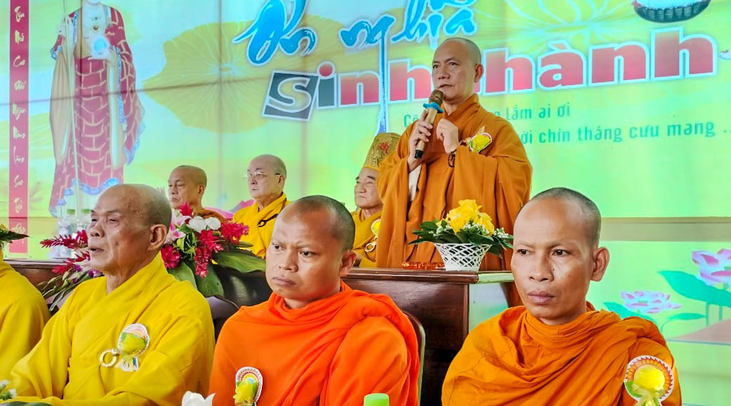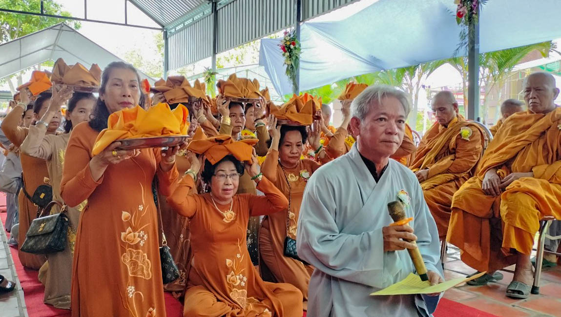 Tiếp theo, Phật tử Trí Lực thay mặt đạo tràng chùa Vĩnh Hiệp thành kính dâng lời tác bạch; với tâm nguyện cúng dường Pháp y, làm mọi thiện pháp để báo hiếu mẹ cha vì công ơn cha mẹ ví tợ non cao, sâu như biển cả, phận làm con phải thương kính, làm tất cả những gì có thể để cha mẹ được vui lòng.