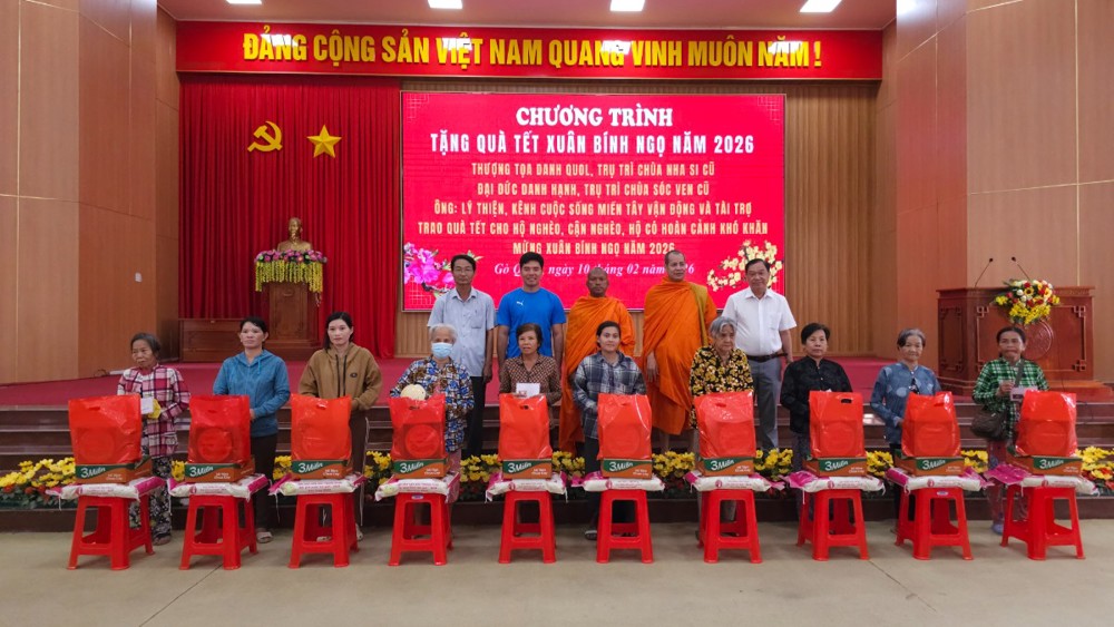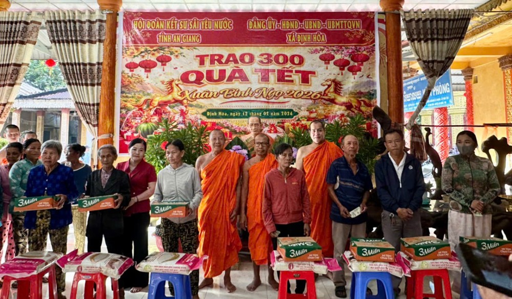 Nhân dịp Xuân Bính Ngọ năm 2026, với tinh thần từ bi cứu khổ của đạo Phật và truyền thống “lá lành đùm lá rách” của dân tộc, Hội Đoàn kết sư sãi yêu nước tỉnh An Giang đã phối hợp cùng Sở Dân tộc và Tôn giáo tỉnh; Đảng ủy, HĐND, UBND, Ủy ban MTTQ Việt Nam các xã Định Hòa, Gò Quao, Long Thạnh, Mỹ Thuận và Chợ Vàm tổ chức chương trình trao quà Tết cho hộ nghèo, hộ cận nghèo và người có hoàn cảnh đặc biệt khó khăn trên địa bàn.