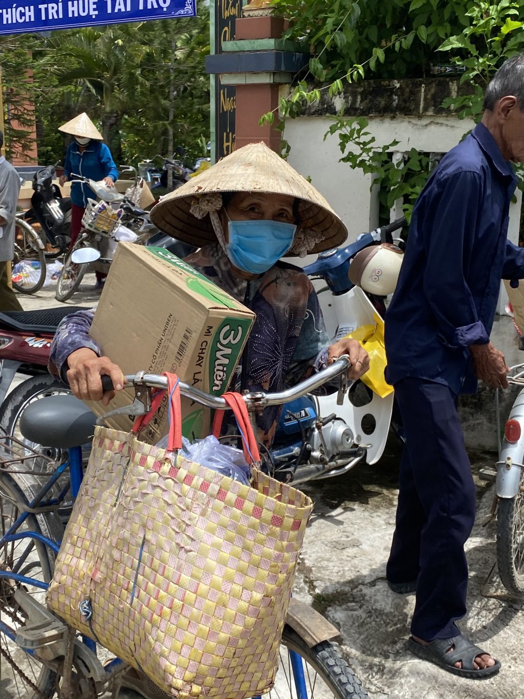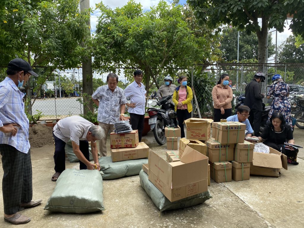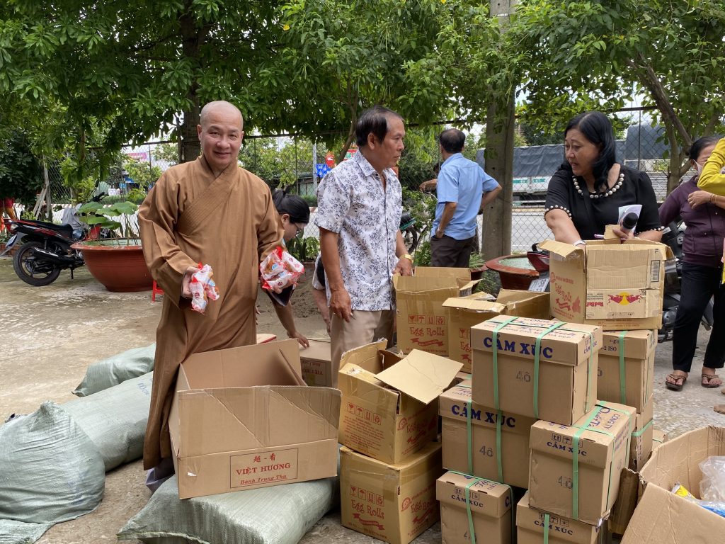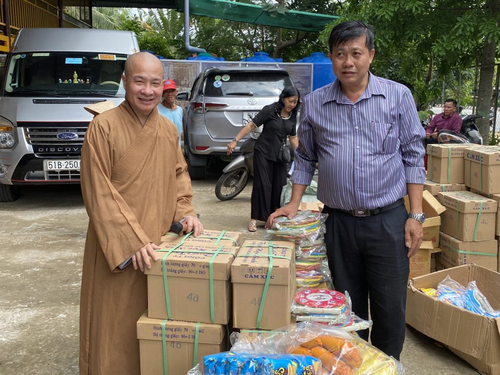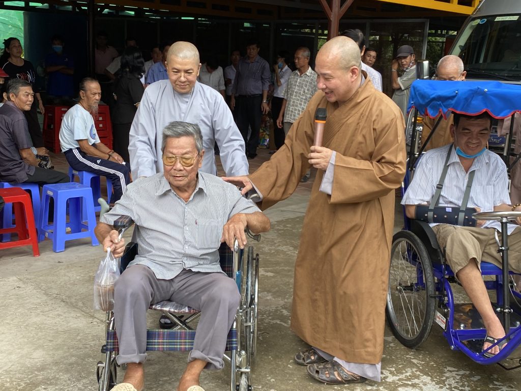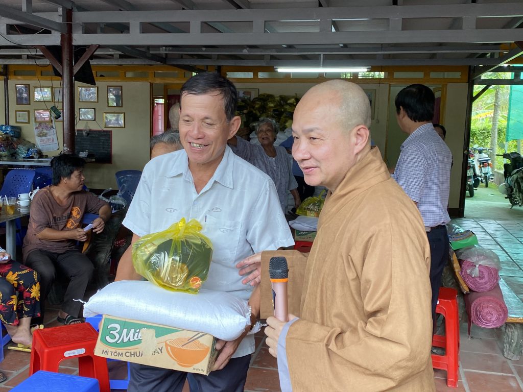 Rời bếp ăn Phước Viên, đoàn từ thiện và các ban ngành chính quyền địa phương cùng đến điểm trao quà thứ hai tại chùa Đức Thắng (xã An Khánh, huyện Châu Thành, tỉnh Bến Tre).