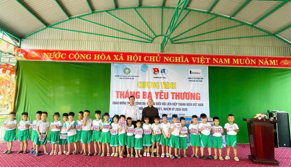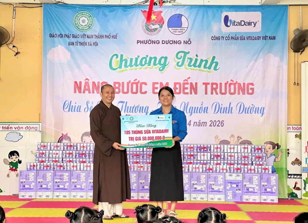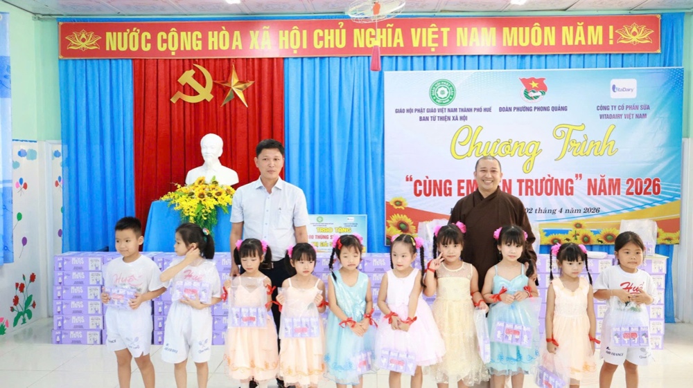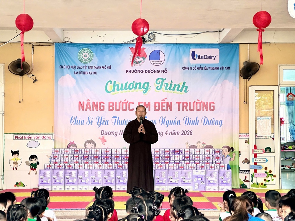 Trong tinh thần từ bi của đạo Phật, từ ngày 31/3 đến 02/4/2026, Ban Từ thiện Xã hội GHPGVN TP. Huế đã tổ chức chương trình trao tặng sữa, chăm sóc dinh dưỡng và gửi gắm tình thương đến các em học sinh tại nhiều trường mầm non và tiểu học trên địa bàn các xã, phường của thành phố.