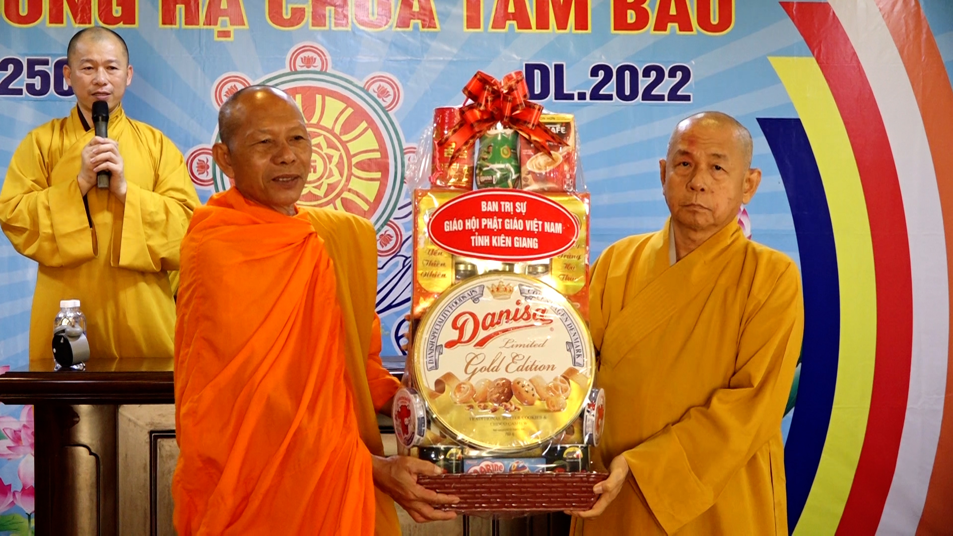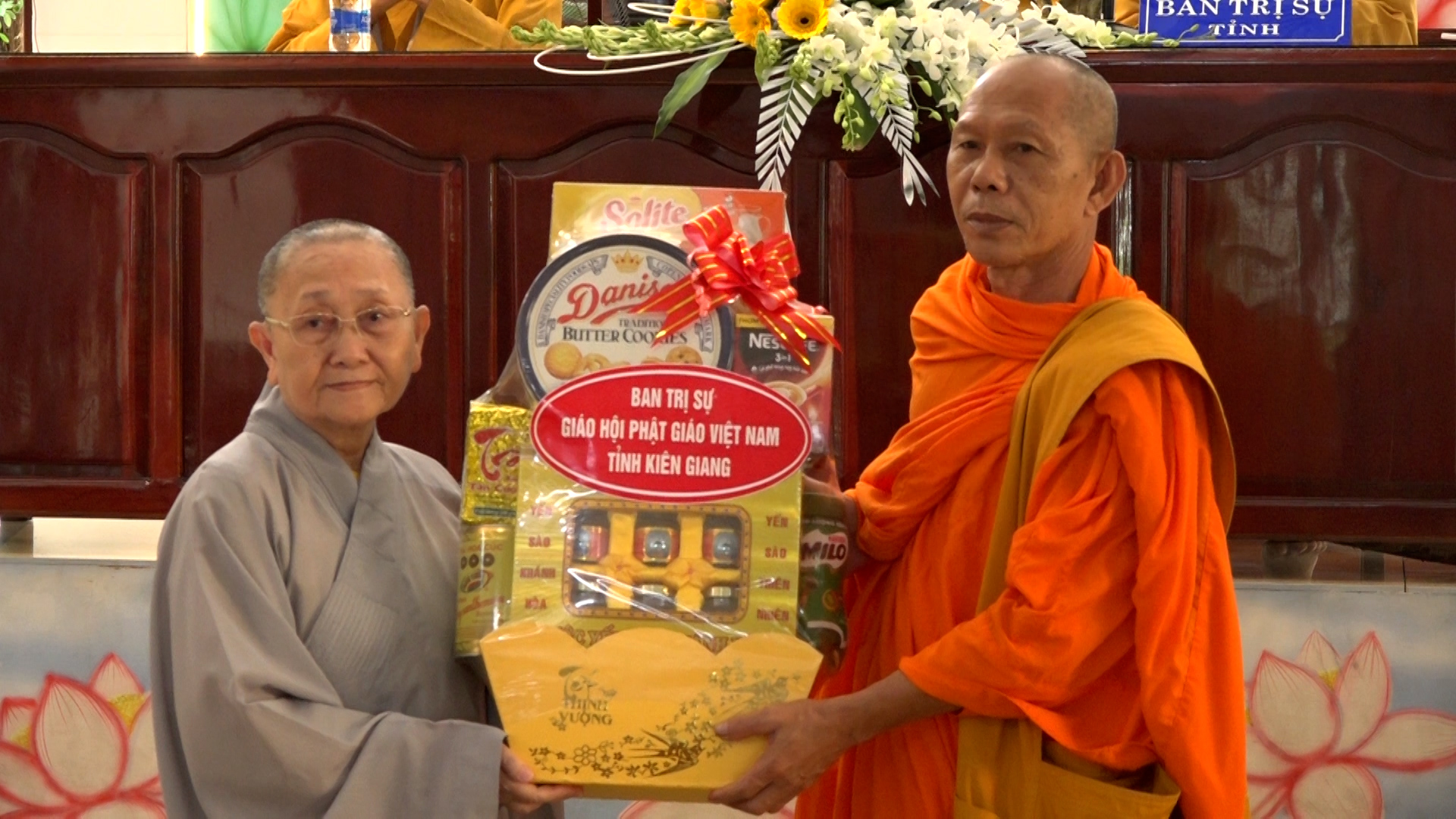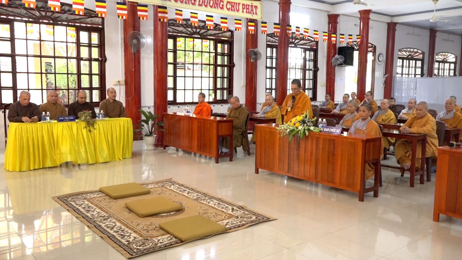 Dịp này, HT. Danh Đổng thay mặt Thường trực BTS GHPGVN tỉnh gửi tặng phần quà cho Ban chức sự và hành giả an cư của hai trường hạ.