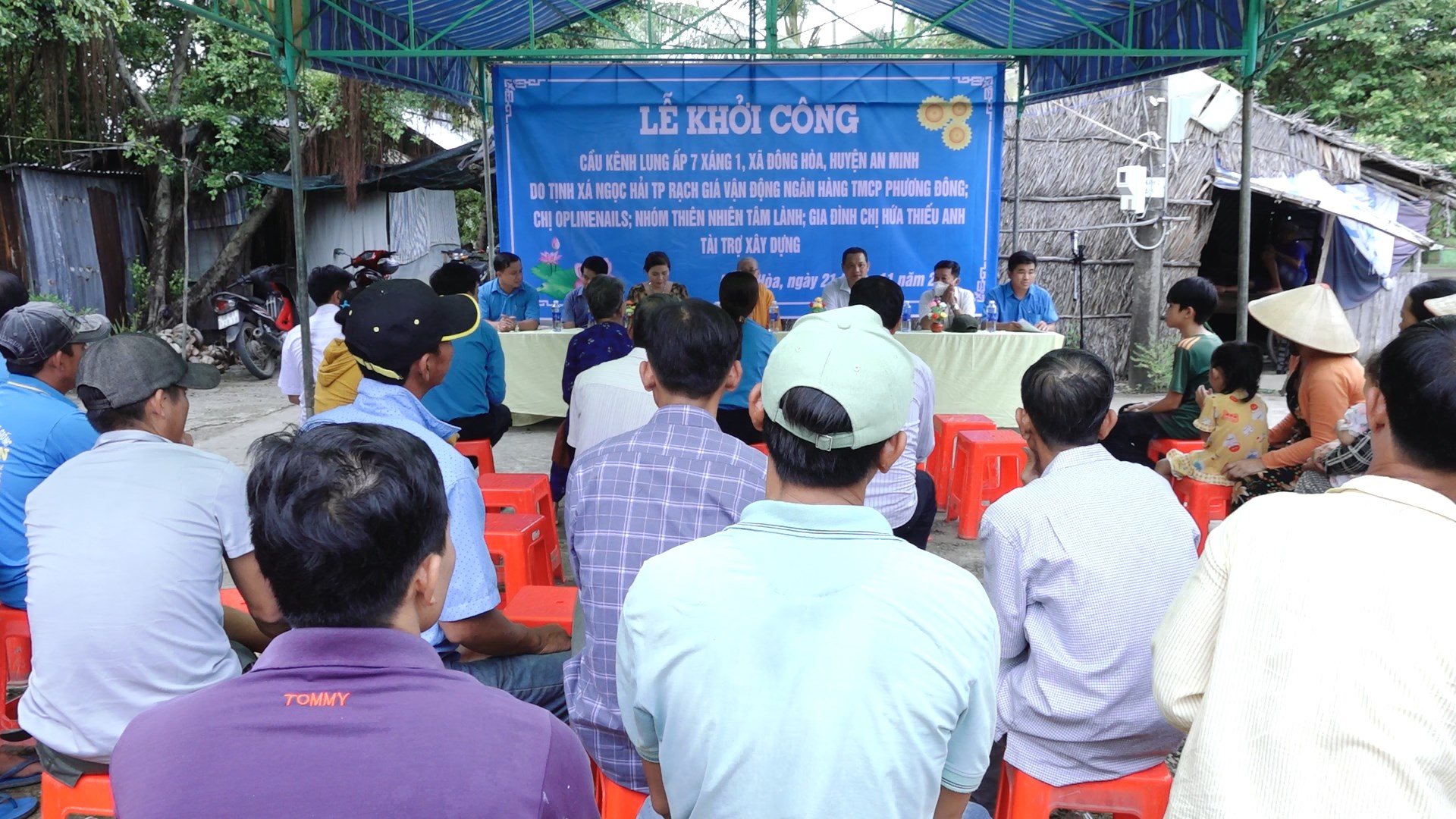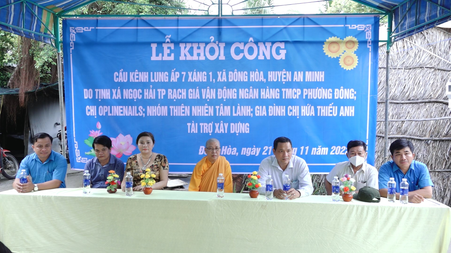 PSO - Nhằm chào mừng Đại hội Đại biểu Phật giáo toàn quốc, chiều ngày 21/11/2022, tại xã Đông Hòa (huyện An Minh, tỉnh Kiên Giang) đã diễn ra lễ khởi công xây cầu giao thông nông thôn mang tên cầu Kênh Lung. Tham dự buổi lễ có Sư cô Thích Nữ Thành Liên - Phó trụ trì tịnh xá Ngọc Hải (TP.Rạch Giá) cùng lãnh đạo chính quyền xã Đông Hoà, huyện An Minh. Về phía nhà tài trợ còn có ông Nguyễn Phong Phú - Đại diện ngân hàng Phương Đông (TP.Rạch Giá), gia đình ông Lê Hữu Ân, nhóm thiện nguyện Tâm Lành, cùng các Mạnh thường quân nước ngoài ủng hộ. Tại đây ông Nguyễn Phong Phú, đại diện ngân hàng Phương Đông - nhà tài trợ chính gửi lời cảm ơn đến Sư cô và chính quyền địa phương đã tạo điều kiện cho ngân hàng Phương Đông cùng Mạnh thường quân trong và ngoài nước có cơ hội mang lại cho bà con nhân dân nơi đây có một cây cầu vững chắc hơn. Đại diện chính quyền địa phương, ông Nguyễn Văn Lân - Phó chủ tịch UBND xã gửi lời tri ân đến Sư cô Thành Liên và các mạnh thường đã quan tâm đến bà con địa phương, xây dựng những nhịp cầu, tạo điều kiện thuận lợi cho người dân, đặc biệt là các em học sinh được đến trường an toàn hơn. Sau thời gian khảo sát, thấy được sự đi lại khó khăn của người dân khi lưu thông qua cây cầu cũ đã xuống cấp, gia đình ông Lê Hữu Ân đã kết nối cùng Sư cô Thích Nữ Thành Liên vận động ngân hàng thương mại cổ phần Phương Đông, quý mạnh thường quân gần xa cùng chung tay giúp cho bà con nơi đây có cây cầu mới, để lưu thông được dễ dàng, an toàn hơn.  Dự kiến cầu có chiều dài 19m chiều rộng 3m. Tổng kinh phí là 188 triệu đồng. Trong đó ngân hàng Phương Đông tài trợ 150 triệu đồng, chị Hứa Thiếu Anh 200 USD, chị Topline Nails 900USD, nhóm thiện nguyện Tâm Lành 12 triệu đồng. Kết thúc buổi lễ, các đại biểu và nhà tài trợ thực hiện nghi thức động thổ trong niềm hân hoan của chính quyền bà con nơi đây.