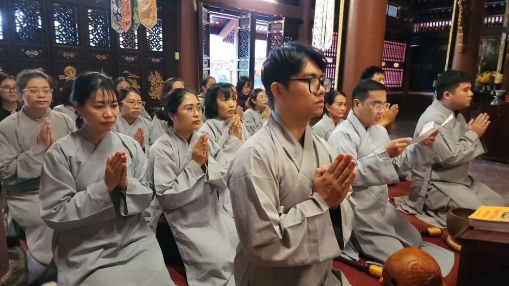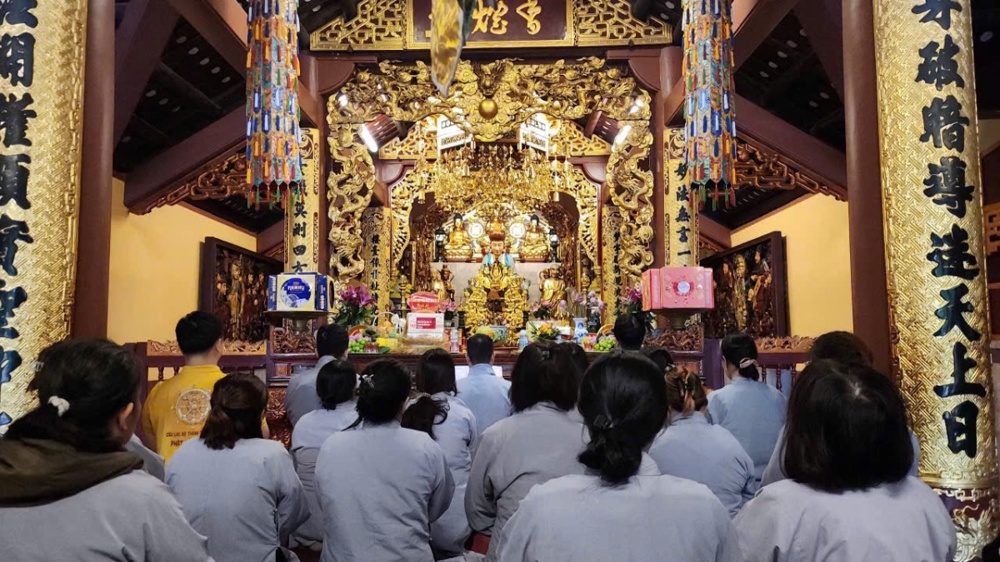 Trong không khí trang nghiêm và thanh tịnh, toàn thể đại chúng nhất tâm dâng cúng phẩm vật, cầu nguyện cho thế giới hòa bình, chúng sinh an lạc.
