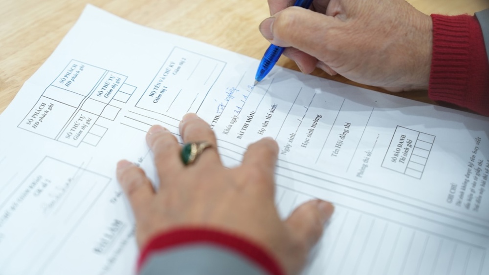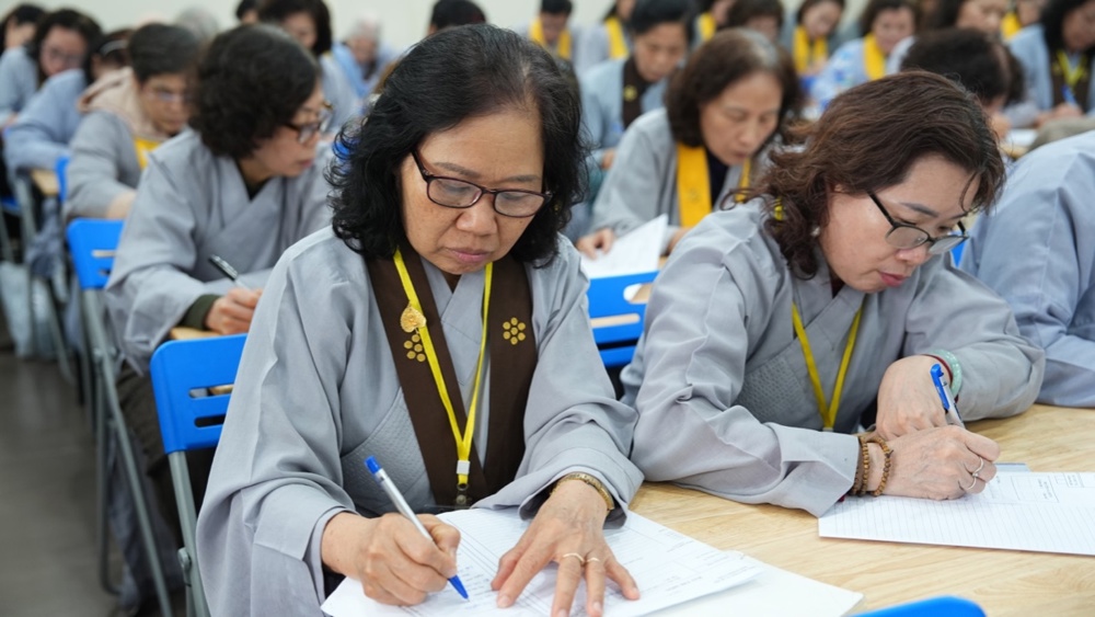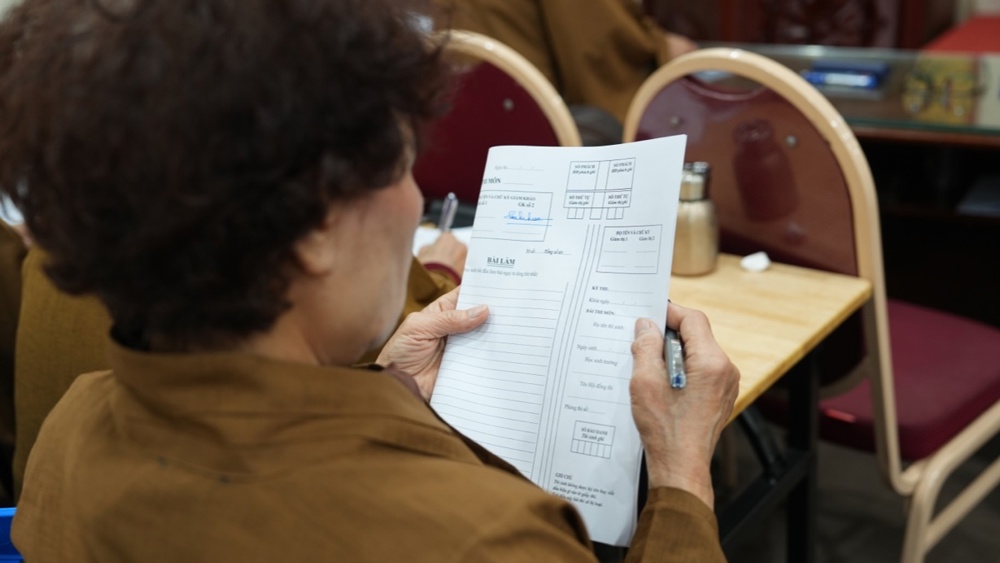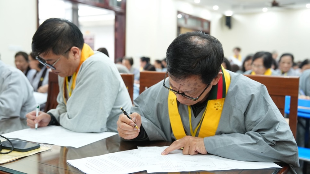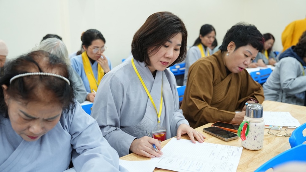 Sau lễ khai mạc, 163 học viên chính thức bước vào Kỳ thi tốt nghiệp lớp Hoằng pháp viên Cư sĩ Phật tử khóa II trong không khí trang nghiêm, với tinh thần nghiêm túc và ý thức trách nhiệm cao. Phần thi viết diễn ra suôn sẻ, thể hiện sự tập trung, chín chắn và quá trình học tập nghiêm túc của các học viên trong suốt thời gian qua.