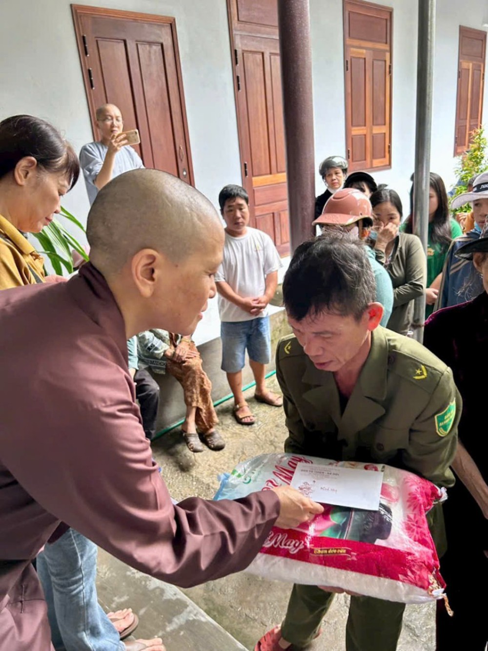 Đến chùa Viên Giác - phường Hội An, đoàn được Thượng tọa Thích Như Tịnh, trụ trì chùa, hướng dẫn trao 300 phần quà An Vui gồm gạo và tiền mặt gửi gắm tình yêu thương của người Lâm Đồng đến với bà con nơi đây thêm động lực vượt qua khó khăn sau mưa lũ.