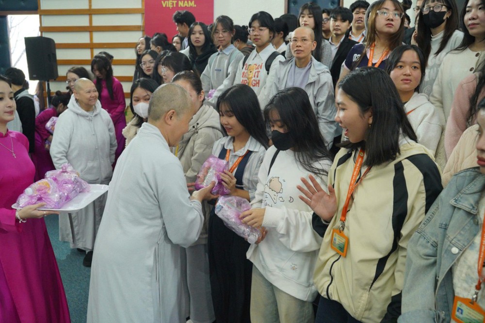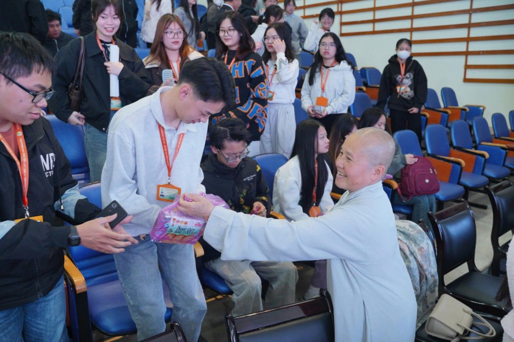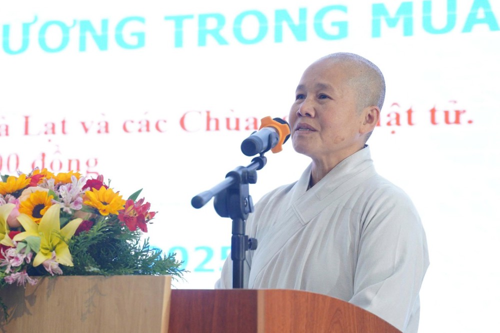 Tiếp nối chương trình, Ni sư Thích Nữ Hạnh Nhẫn đã gửi đến đại chúng những lời chia sẻ sâu lắng xoay quanh tinh thần đồng hành và nâng đỡ ước mơ của các em học sinh trong hoàn cảnh thiên tai. Ni sư bày tỏ rằng mỗi khát vọng tuổi trẻ, dù mộc mạc hay cao xa, đều là nguồn sáng cần được bảo bọc và nuôi dưỡng. Giữa những ngày mưa lũ chồng chất khó khăn, sự quan tâm và chung tay của cộng đồng chính là điểm tựa tinh thần quý báu, giúp các em thêm vững tin, kiên cường vượt qua thử thách, tiếp tục nuôi dưỡng niềm tin vào con đường học tập phía trước. Qua đó, Ni sư cũng ân cần nhắn nhủ các em hãy xem tri thức và đạo đức là hành trang quan trọng, không ngừng trau dồi bản thân, sống biết ơn và lan tỏa yêu thương đến những người xung quanh.