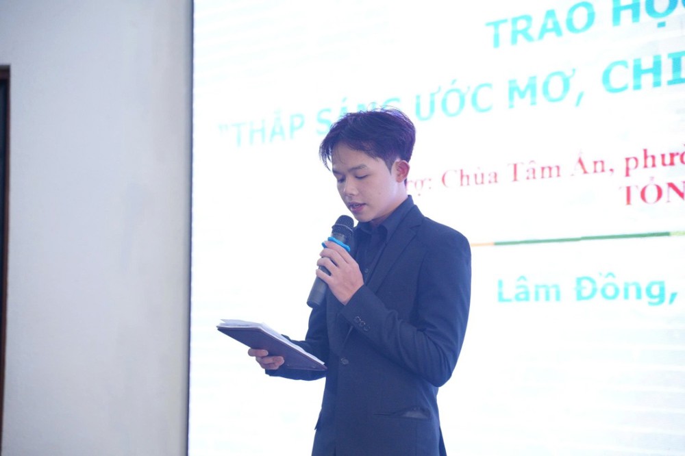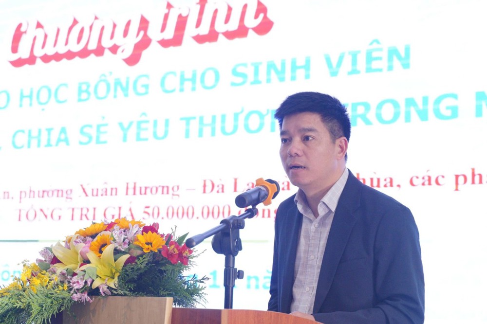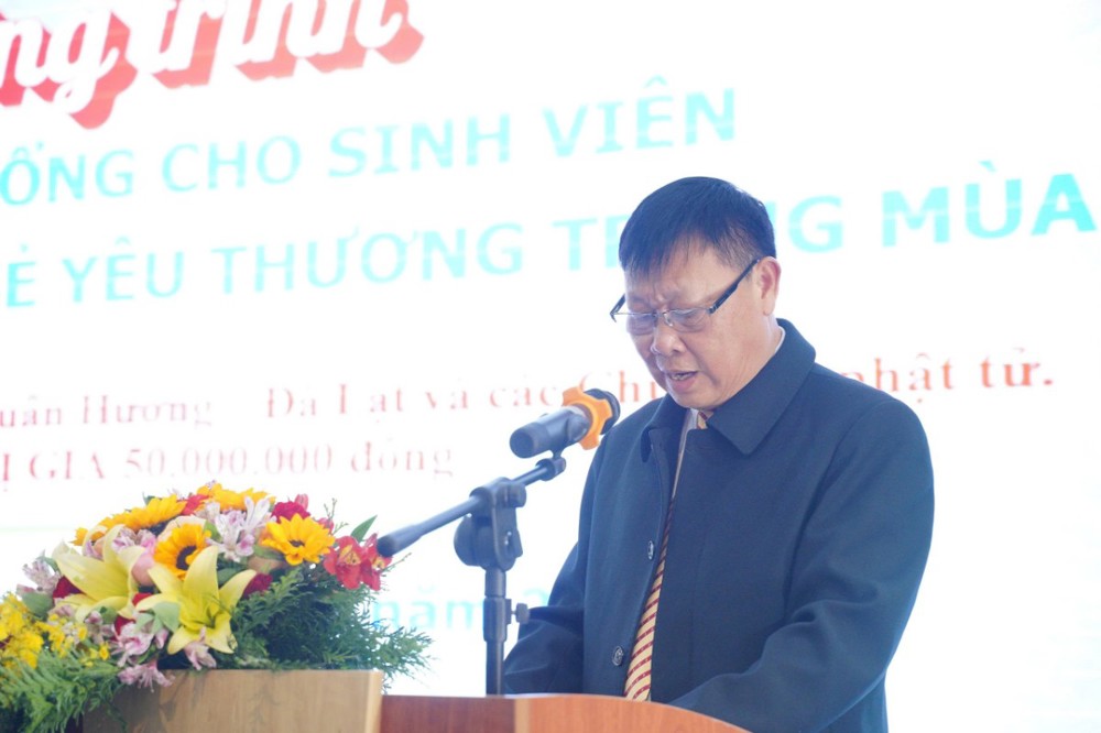 Phát biểu tại buổi lễ, ông Nguyễn Văn Học đã bày tỏ niềm xúc động và trân trọng trước sự quan tâm sâu sắc của chư Tôn đức, các đơn vị đồng hành và quý nhà hảo tâm dành cho sinh viên trong hoàn cảnh khó khăn. Ông nhấn mạnh rằng chương trình trao học bổng lần này không chỉ mang ý nghĩa hỗ trợ vật chất kịp thời trong bối cảnh bà con và các em đang chịu nhiều ảnh hưởng nặng nề bởi thiên tai, bão lũ, mà còn là thông điệp nhân văn sâu sắc về tinh thần “thắp sáng ước mơ - sẻ chia yêu thương”.