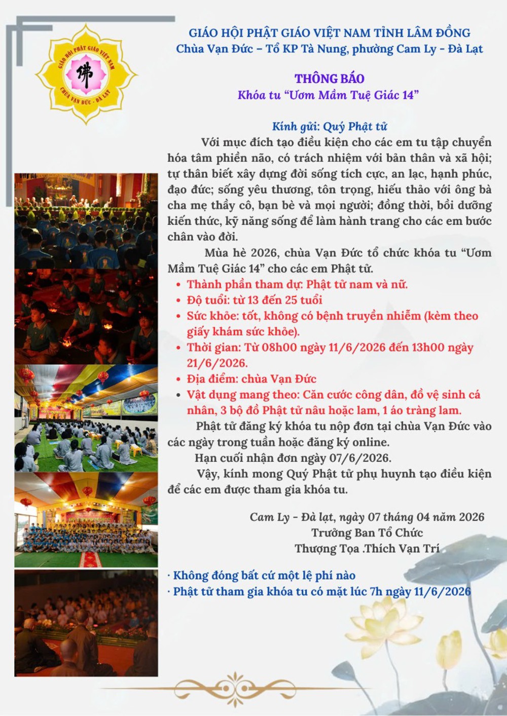 PSO- Mùa hè năm 2026 này, các bạn trẻ từ 13 đến 25 tuổi có cơ hội tham gia chương trình tu học “Ươm Mầm Tuệ Giác 14” tại chùa Vạn Đức (tổ KP Tà Nung, phường Cam Ly-Đà Lạt) – một hành trình mùa hè vừa vui, vừa bổ ích, giúp rèn luyện tâm trí, nuôi dưỡng nhân cách và khám phá giá trị sống tích cực.