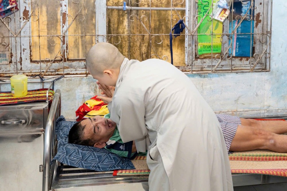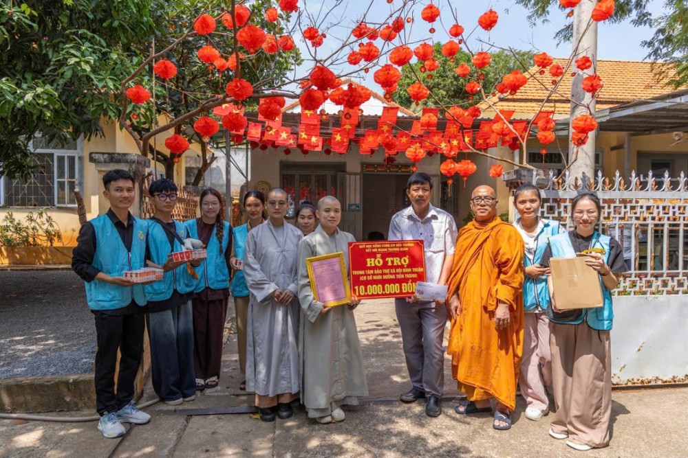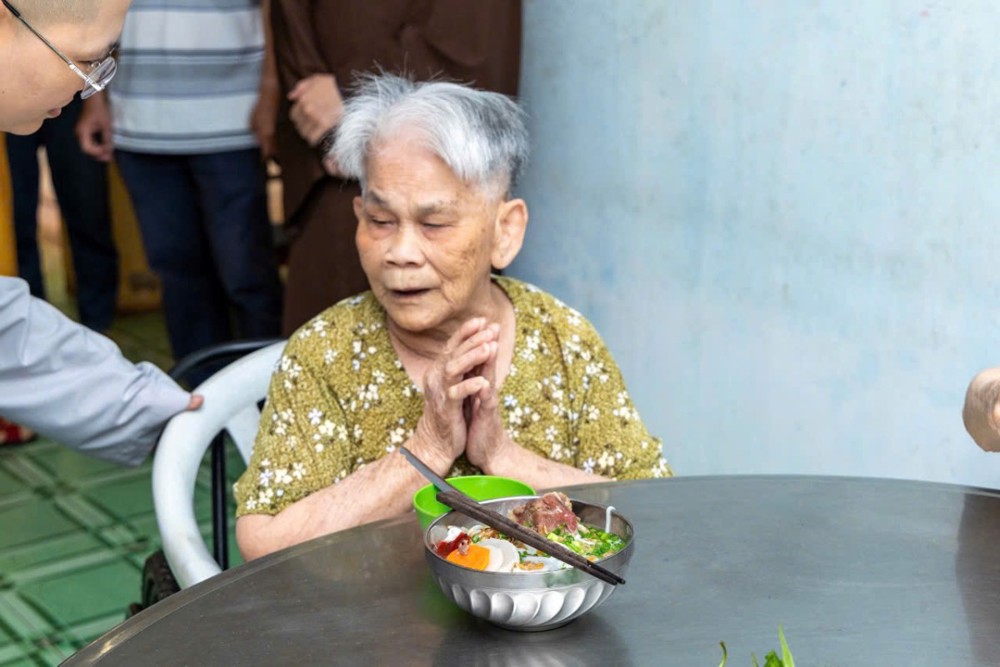 Rời mái trường, đoàn tiếp tục đến thăm Trung tâm Bảo trợ Xã hội tỉnh Lâm Đồng – nơi chăm sóc người già neo đơn và trẻ em mồ côi. Tại đây, chư Tôn đức và các thành viên đã chuẩn bị bữa ăn trưa ấm áp, trực tiếp trao từng phần ăn đến các cụ và các em, đồng thời tặng các nhu yếu phẩm thiết yếu và hỗ trợ kinh phí 10 triệu đồng nhằm góp phần chăm lo đời sống cho những hoàn cảnh kém may mắn.
