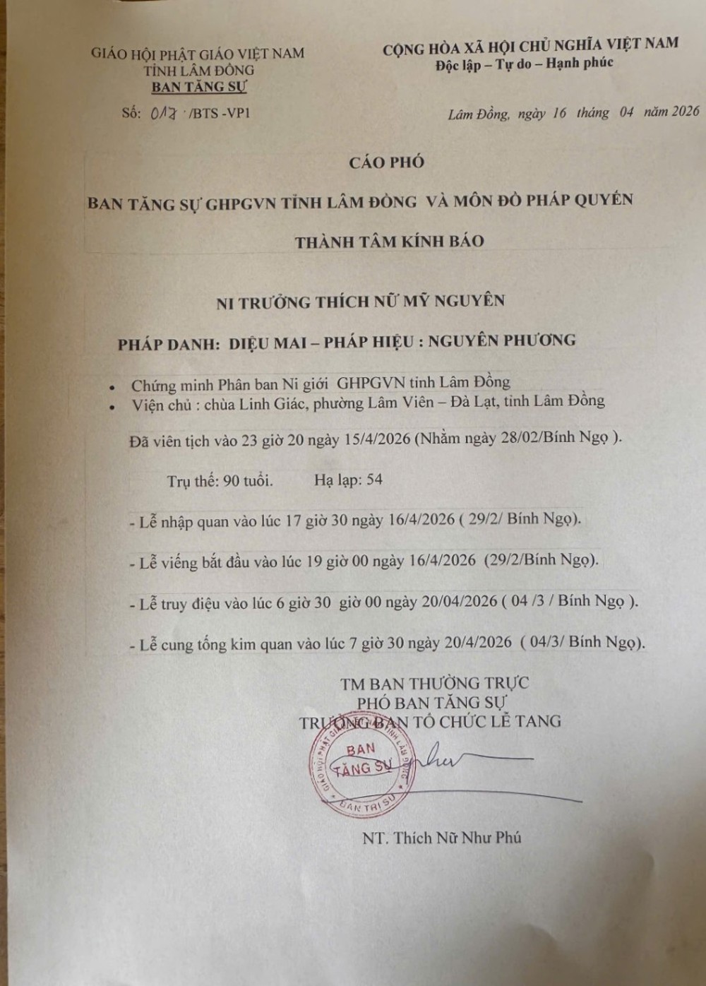 Lễ tưởng niệm, cung tống kim quan Ni trưởng trà tỳ tại đài hỏa táng Du Sinh: 7 giờ 30 ngày 20/4/2026. Sau đó, nhập tháp tại chùa Linh Giác.