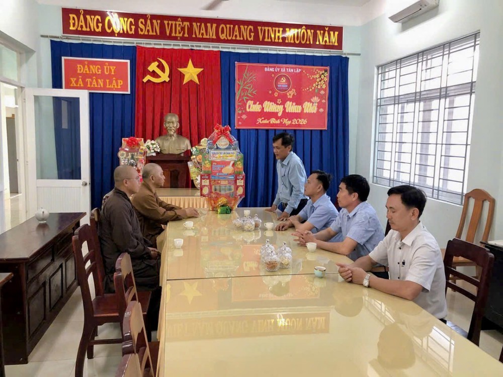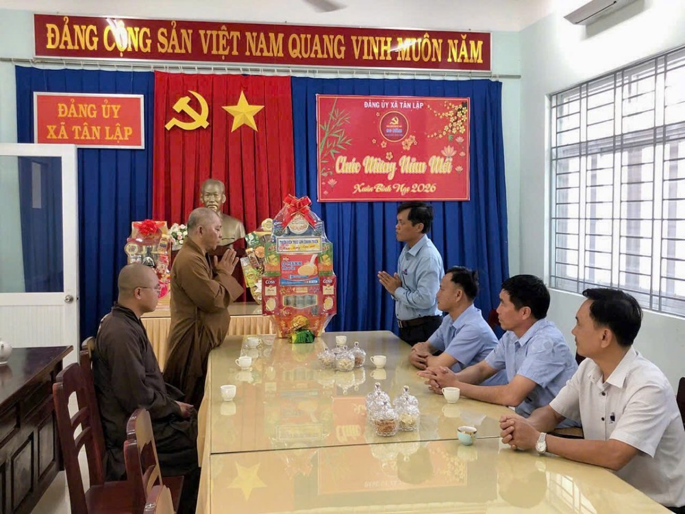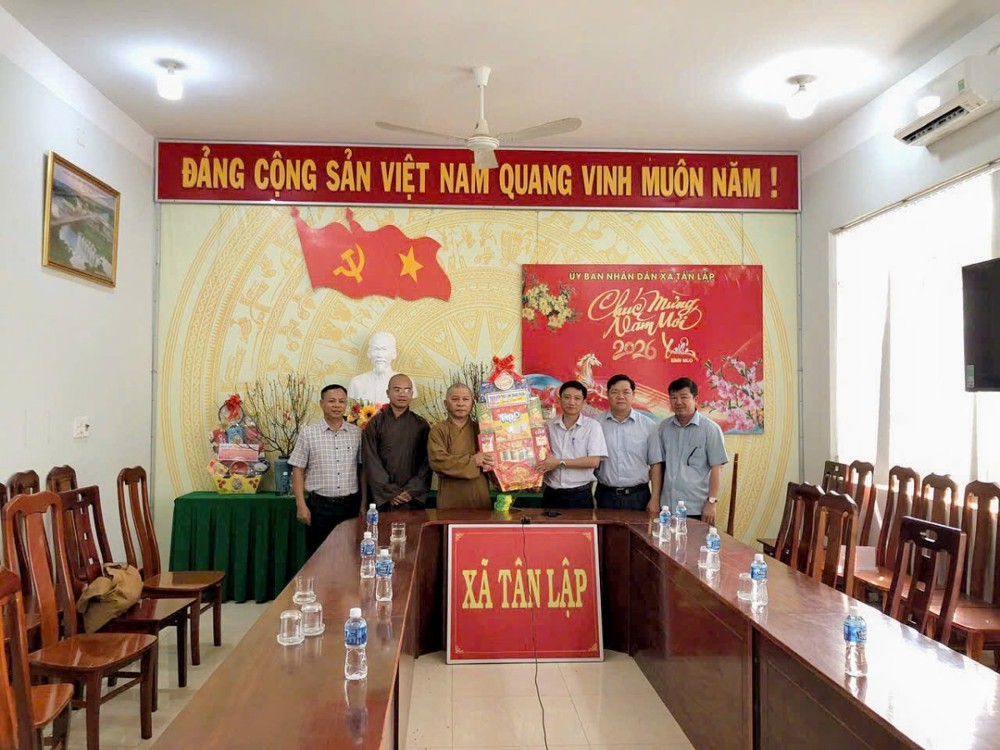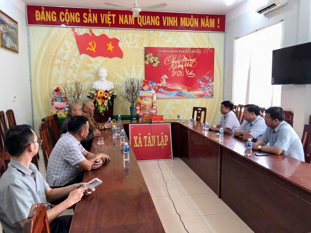 PSO - Trong không khí ấm áp, thân tình, trước thềm xuân Bính Ngọ 2026, sáng ngày 13/2/2026, đại diện Thiền viện Trúc Lâm Chánh Thiện (xã Tân Lập) do Thượng tọa Thích Đạt Ma Khế Định, Phó trưởng BTS GHPGVN tỉnh Lâm Đồng, Trụ trì thiền viện hướng dẫn đoàn đã đến thăm, chúc Tết lãnh đạo Đảng ủy, Hội đồng Nhân dân, Ủy ban Nhân dân, Ủy ban Mặt trận Tổ quốc Việt Nam, Ban Chỉ huy quân sự và Công an xã Tân Lập.