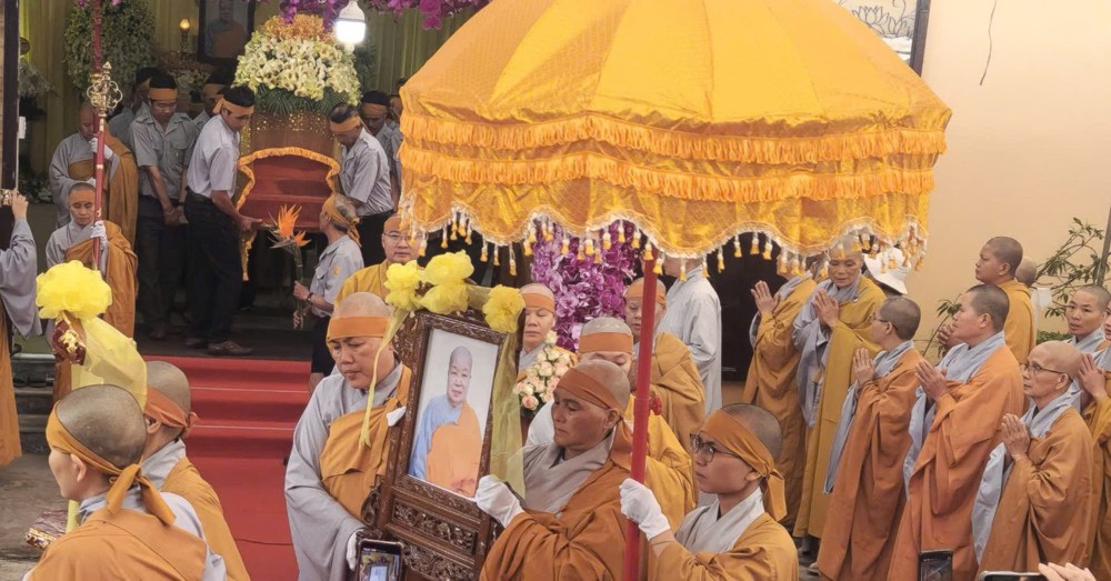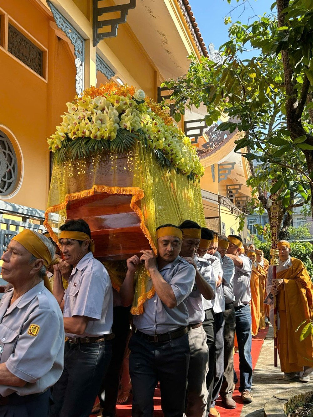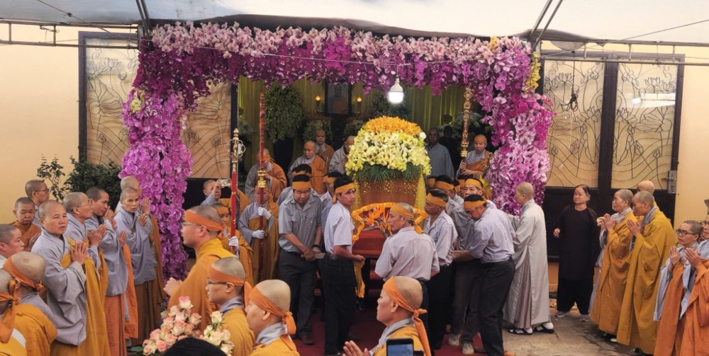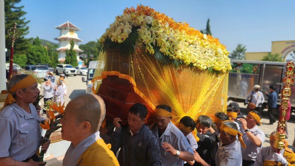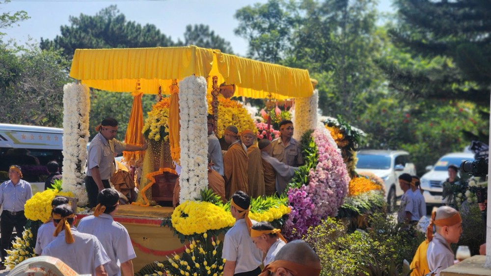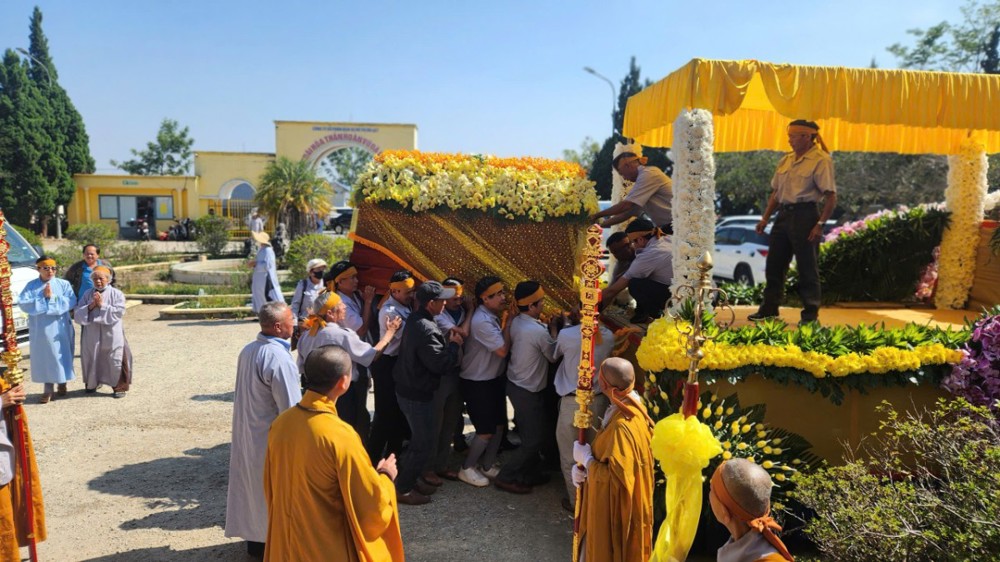 Trong tiếng trống Bát-nhã trầm hùng hòa cùng tiếng niệm Phật của đại chúng, môn đồ pháp quyến thành kính cung thỉnh kim quan cố Ni trưởng thượng giá, từ từ hướng về Đài hỏa táng Du Sinh để cử hành lễ trà tỳ.