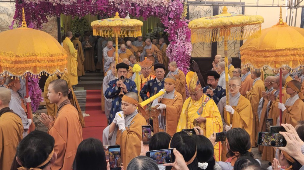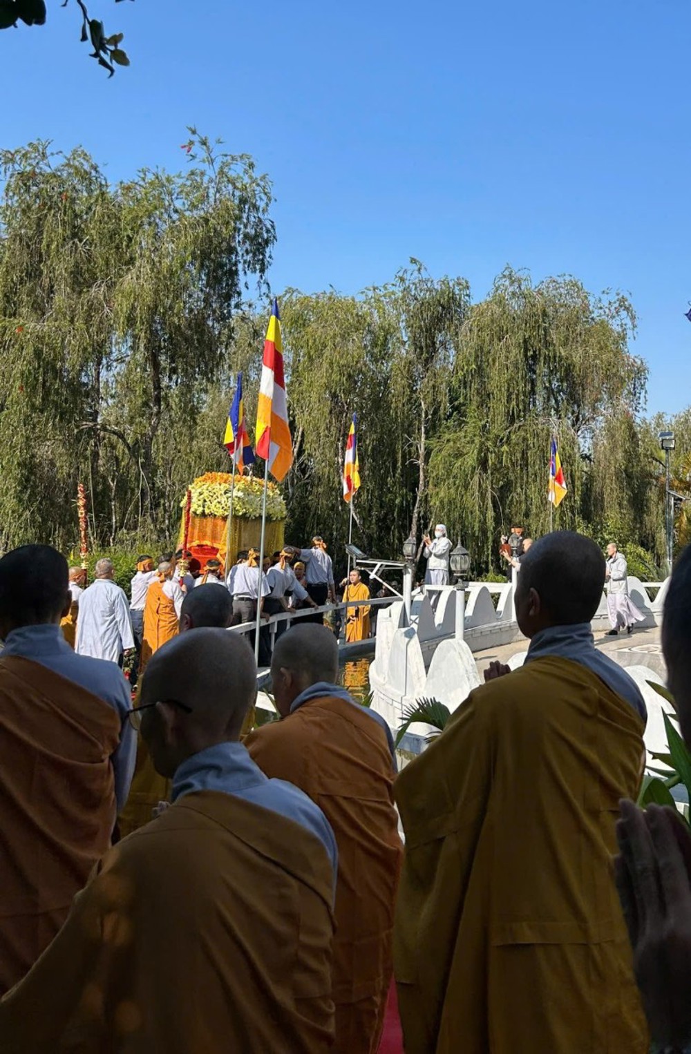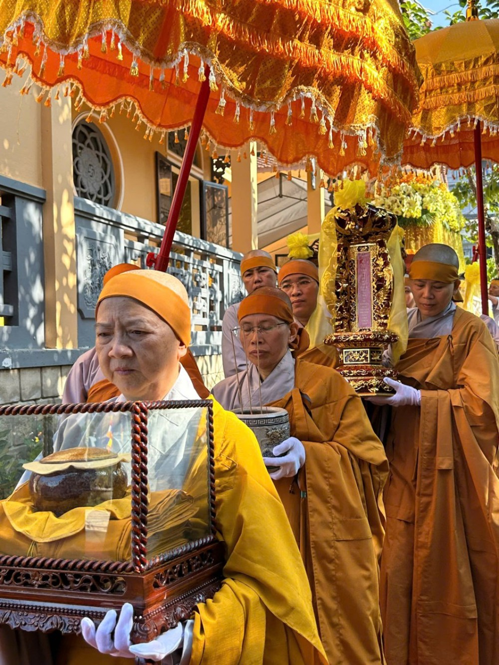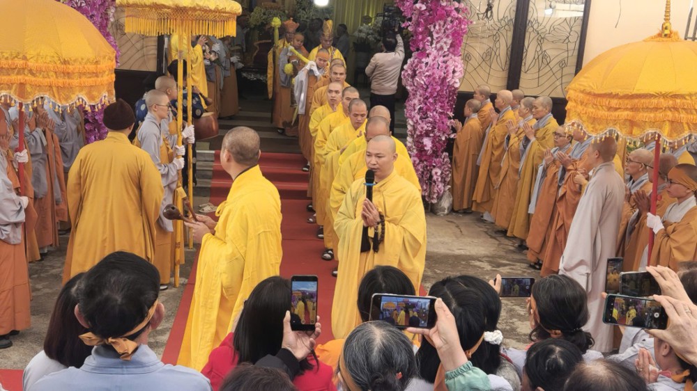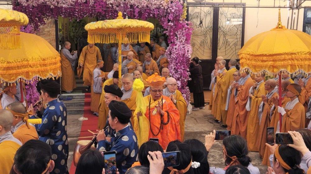 Trong tiếng trống Bát-nhã trầm hùng hòa cùng tiếng niệm Phật của đại chúng, môn đồ pháp quyến thành kính cung thỉnh kim quan cố Ni trưởng thượng giá, từ từ hướng về Đài hỏa táng Du Sinh để cử hành lễ trà tỳ.