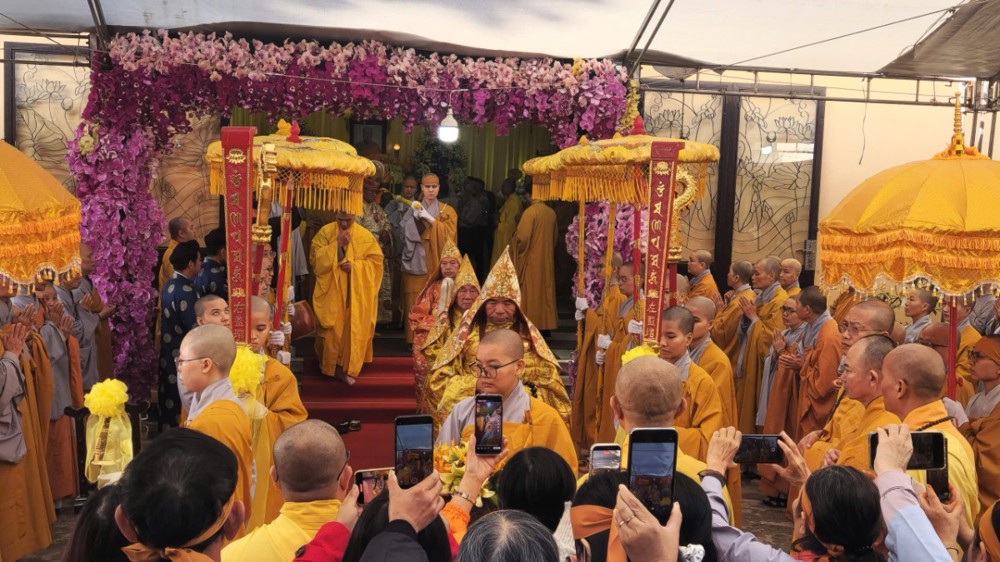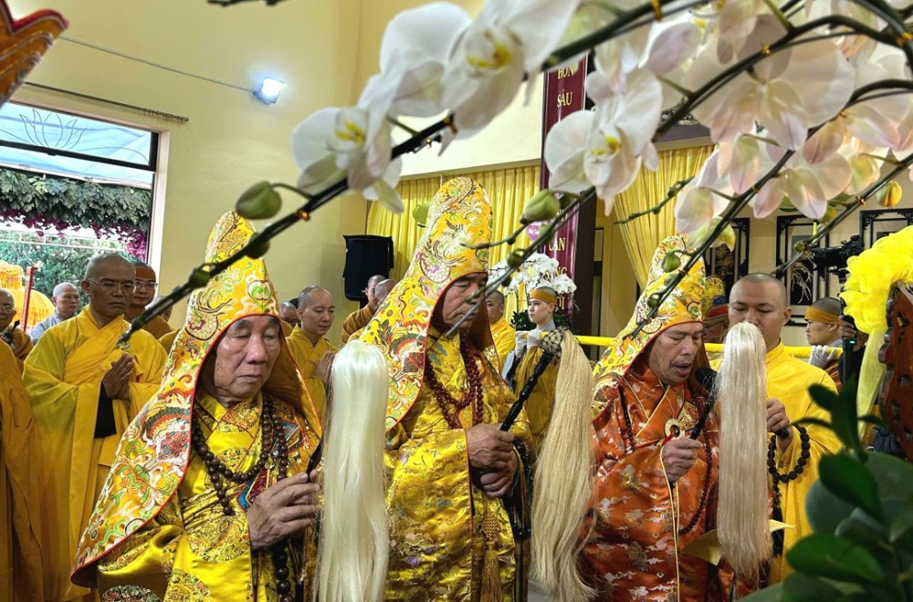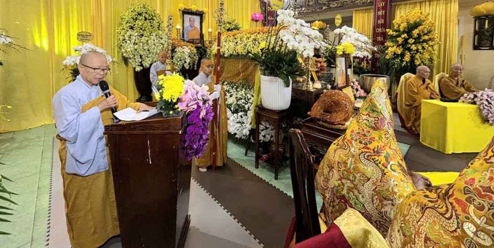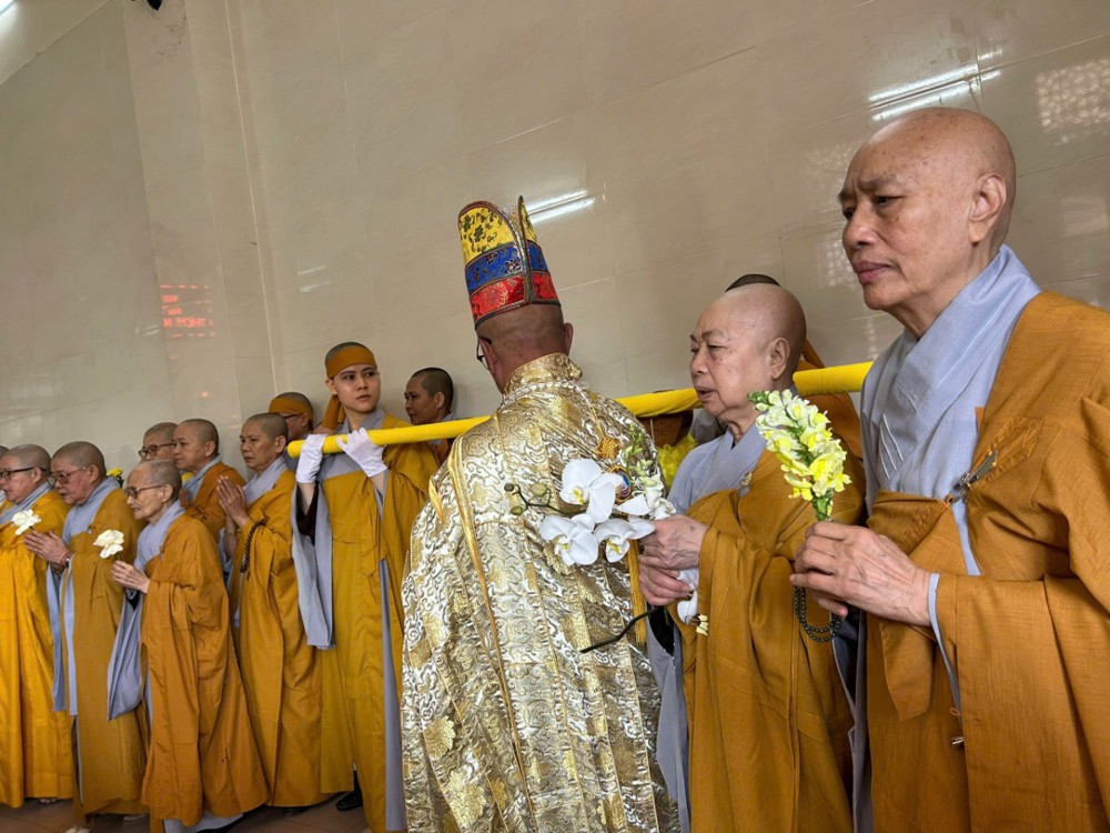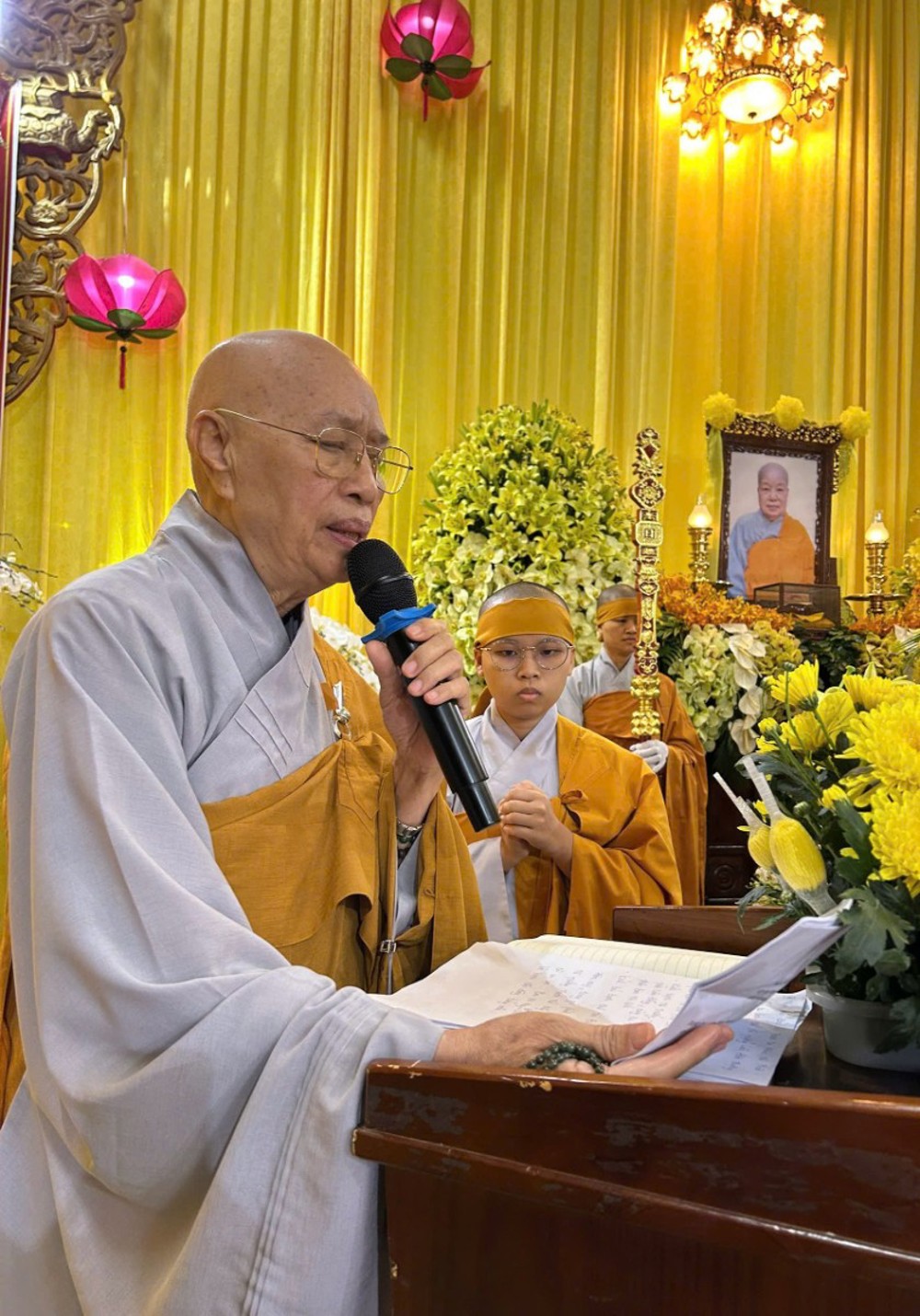 Sau khi chư Tôn giáo phẩm thắp nén tâm hương tiễn biệt, Hòa thượng Sám chủ đã cử hành lễ phất trần, cung tuyên pháp ngữ, gia trì pháp sự.