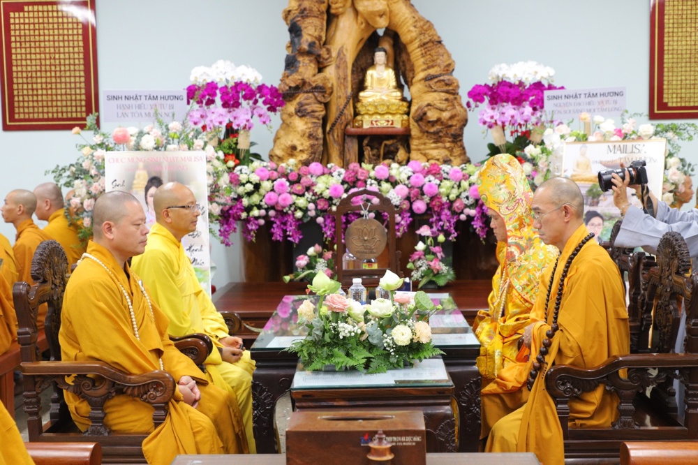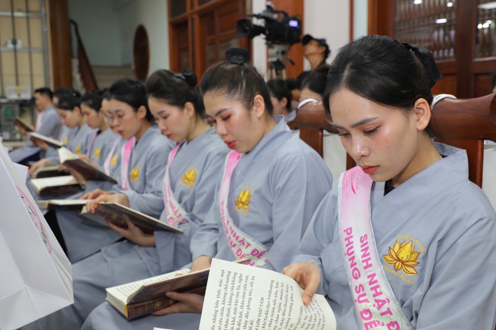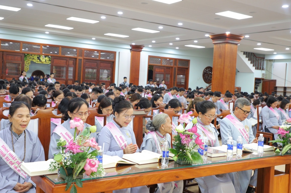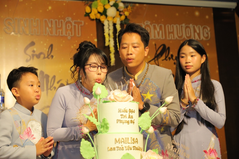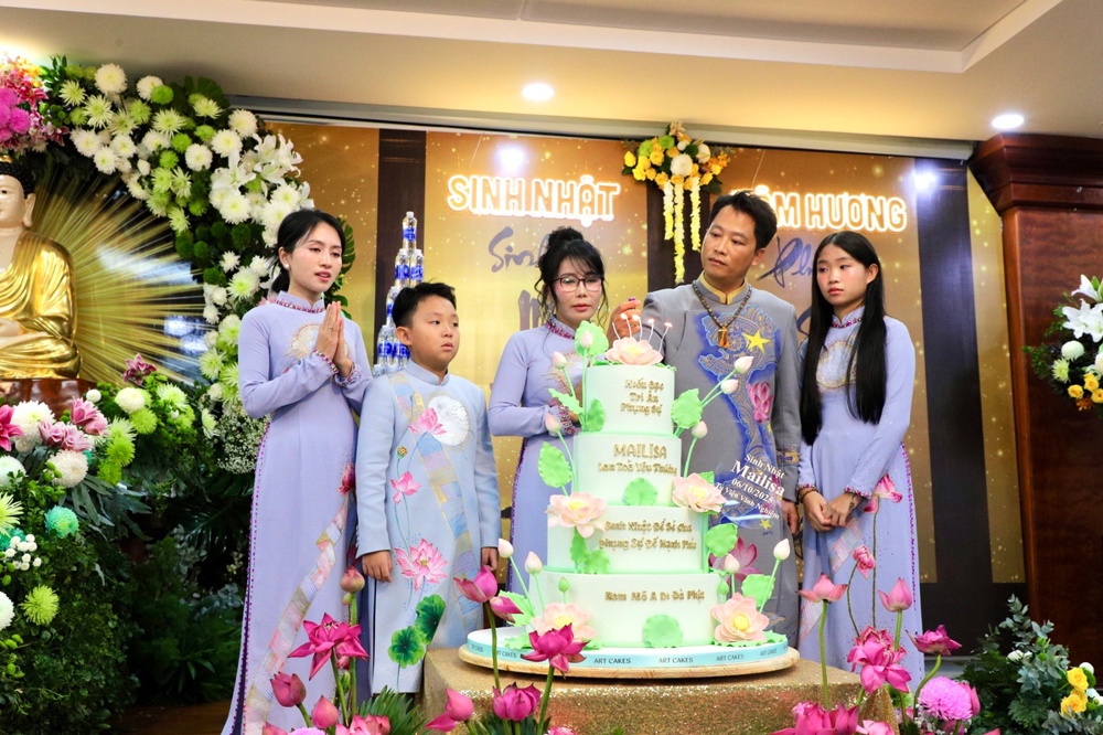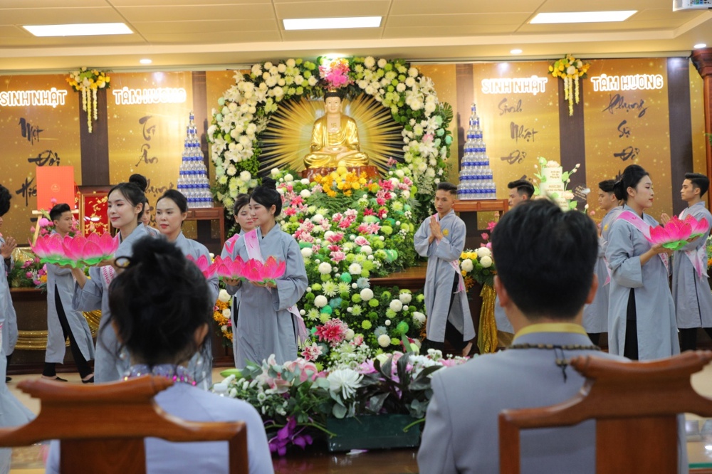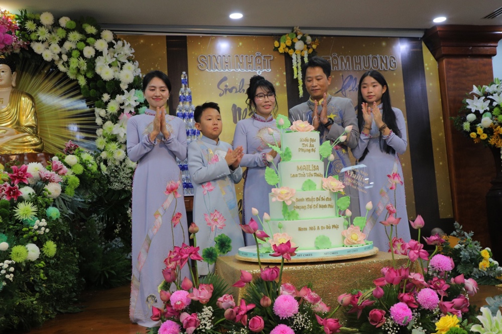 Tại buổi lễ toàn thể Hội chúng cùng chứng kiến nghi thức thổi nến, cắt bánh sinh nhật, mừng Ngày tiếp nối của phật tử Tâm Hương - Phan Thị Mai trong khoảnh khắc thiêng liêng và đầy ý nghĩa.