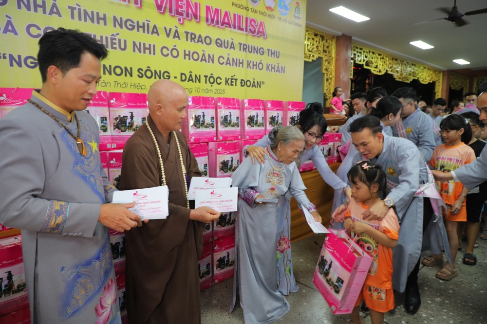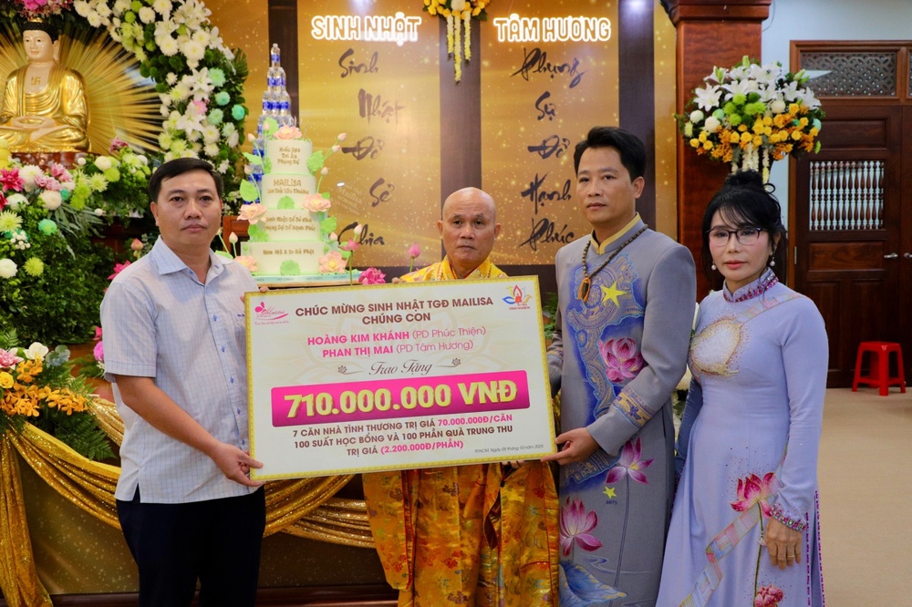 Hành trình thiện nguyện của gia đình Mai - Khánh và Mailisa luôn kiên định với tinh thần hộ trì Tam Bảo, phụng sự chúng sinh, tại buổi lễ Đại gia đình Phật tử Tâm Hương - Phúc Thiện cùng tập thể Mailisa phát tâm ủng hộ xây dựng 16 căn nhà tình thương với tổng trị giá 1 tỷ 120 triệu đồng bao gồm 7 căn tại Quận 12, TP HCM, 3 căn tại thành phố Thanh Hóa, 3 căn tại thành phố Vinh Nghệ An, 3 căn tại thành phố Hà Tĩnh.