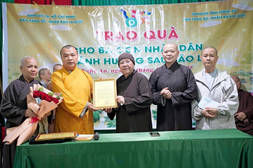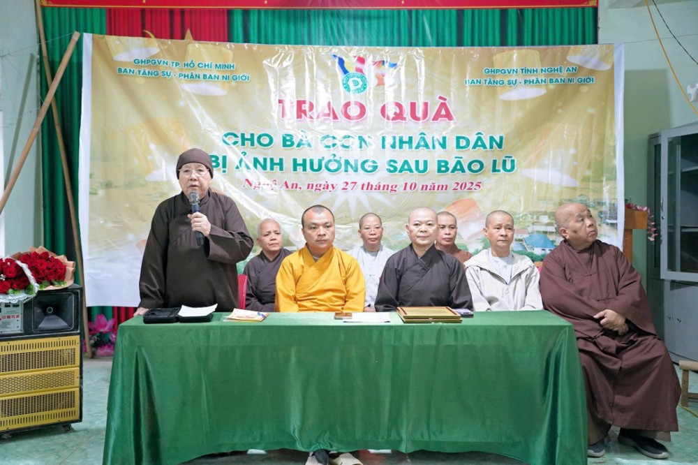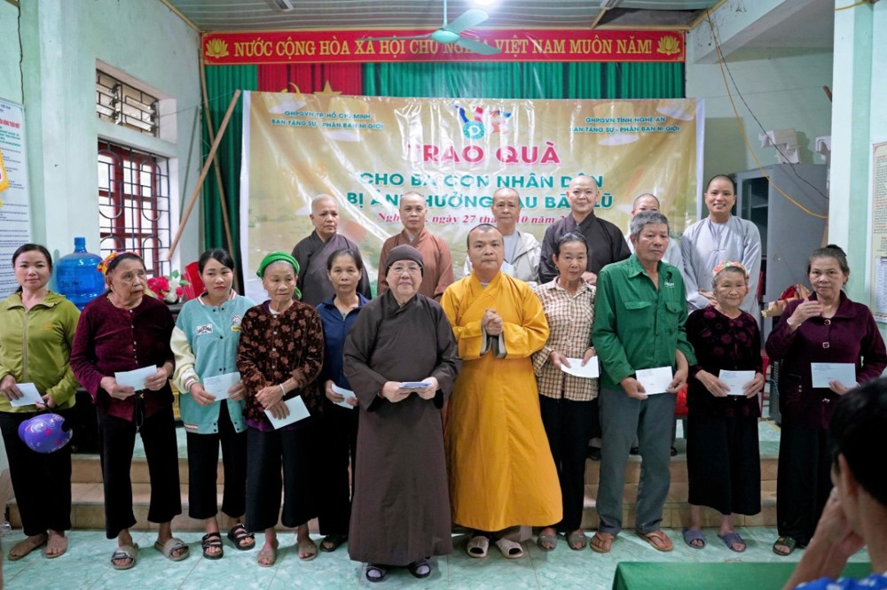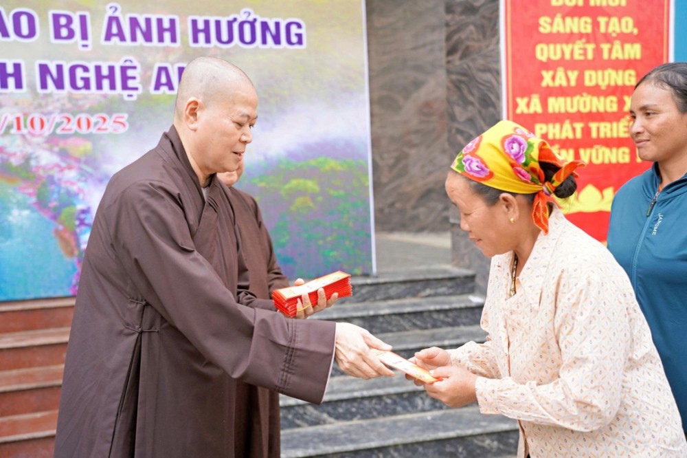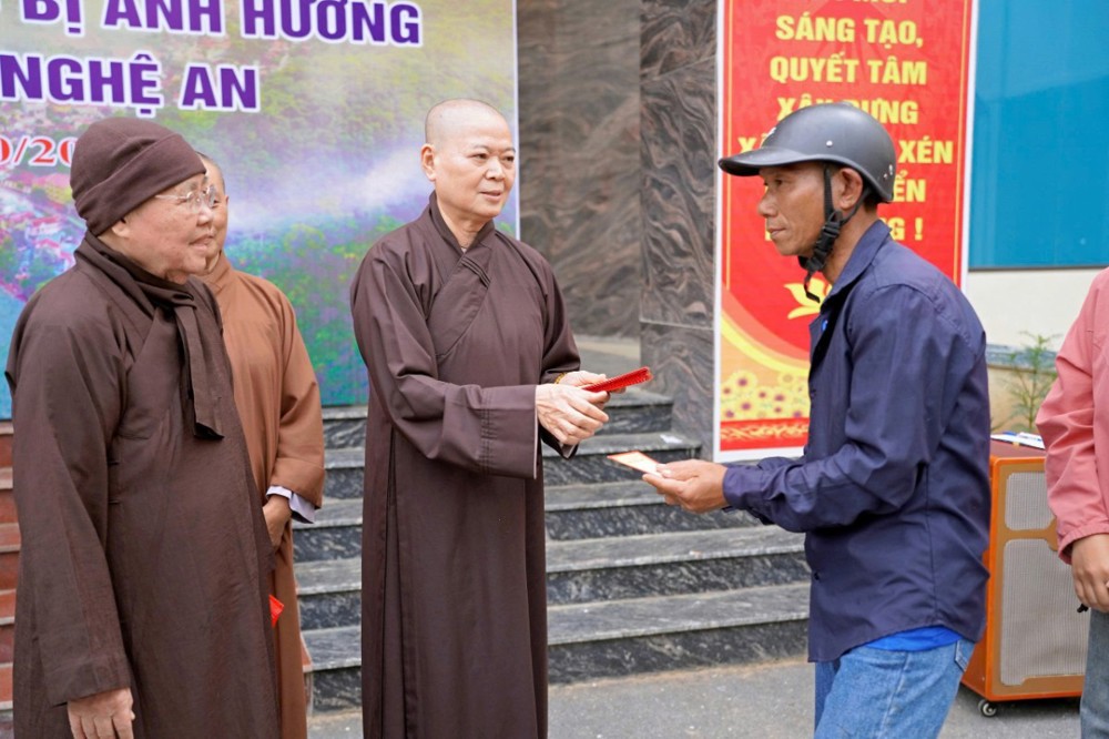 Tại buổi trao quà, Ni trưởng Thích Nữ Từ Nhẫn đã ân cần thăm hỏi, động viên bà con cố gắng vượt qua những mất mát, sớm ổn định cuộc sống và khôi phục sản xuất. Ni trưởng cũng gửi lời tri ân đến Ban Trị sự GHPGVN tỉnh Nghệ An và chính quyền địa phương đã tạo điều kiện thuận lợi để đoàn có thể trực tiếp đến thăm hỏi và trao tận tay những phần quà nghĩa tình đến người dân.