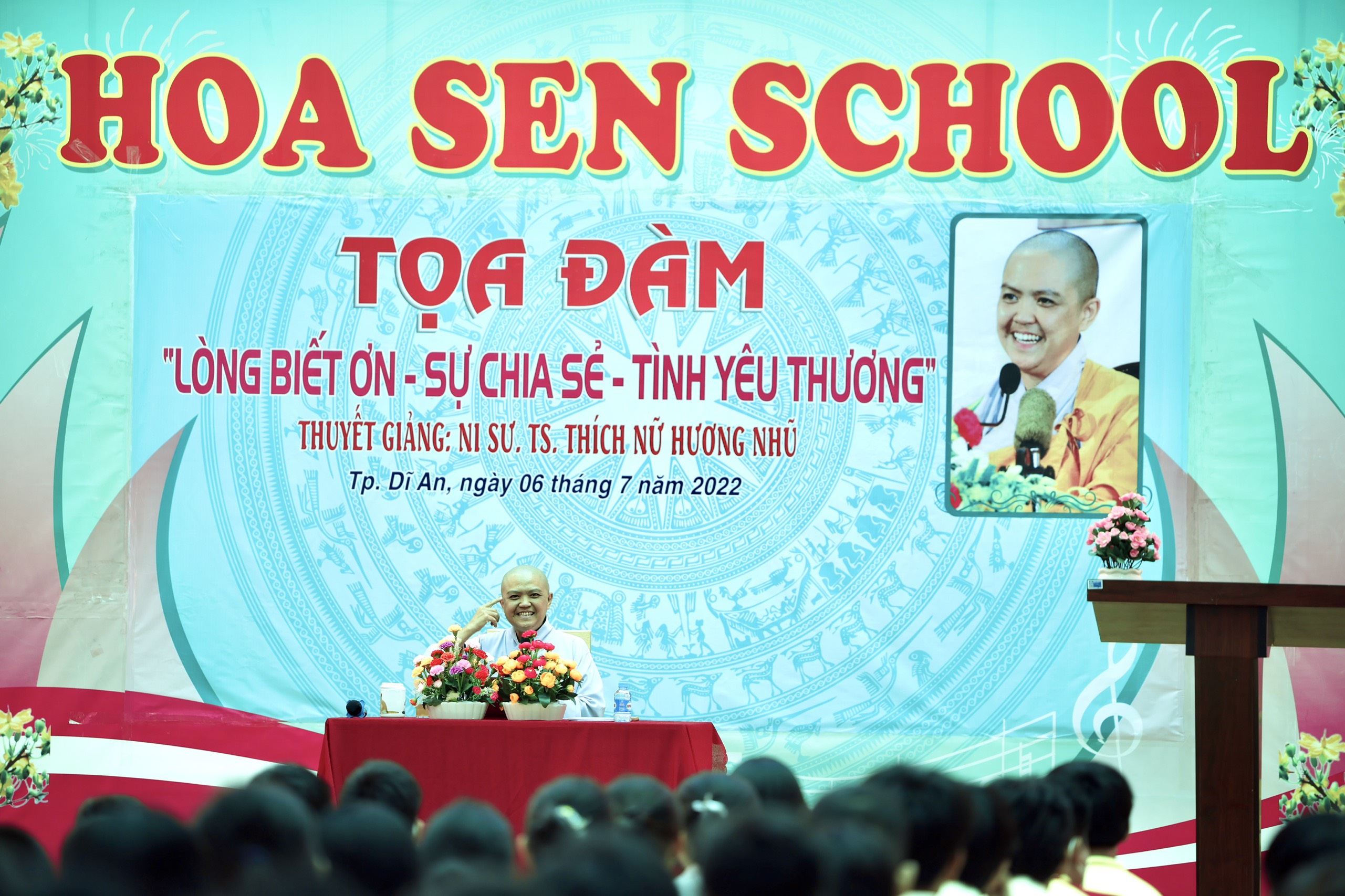 PSO - Theo lời thỉnh mời của Ban lãnh đạo Hội đồng trường Tiểu học và THCS Hoa Sen tại thành phố Dĩ An, tỉnh Bình Dương, Ni sư Thích nữ Hương Nhũ - trụ trì chùa Thiên Quang đã đến chia sẻ thời pháp thoại với chủ đề: “Lòng biết ơn - Sự thông cảm - Tình yêu thương” trong chương trình ngoại khoá mùa hè. Pháp thoại đã có sự tham dự của Ban Giám hiệu, toàn thể giáo viên và trên 700 học sinh trường Hoa Sen.