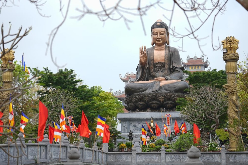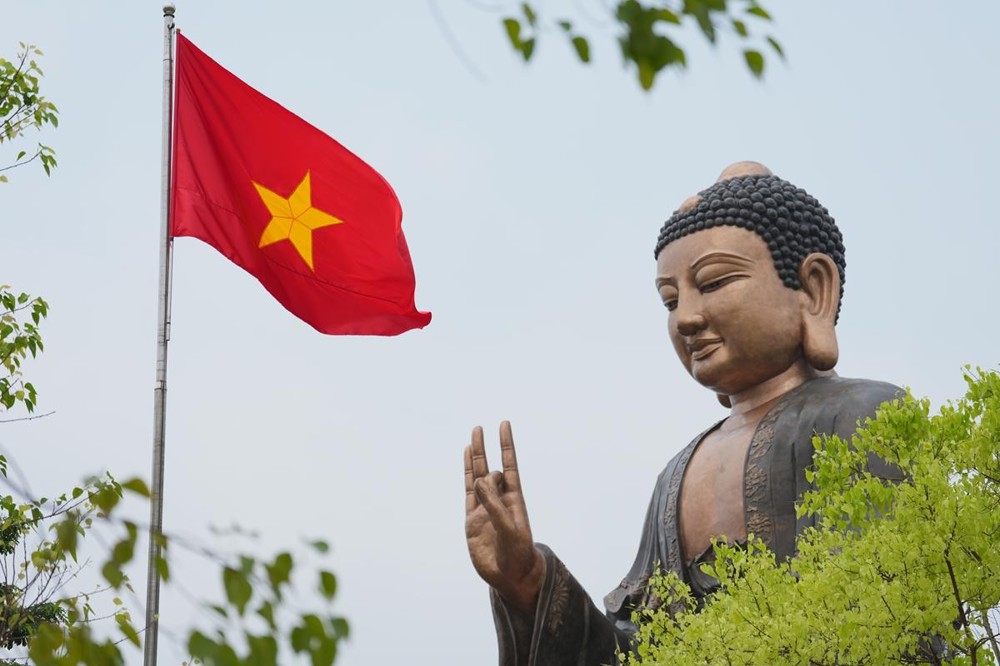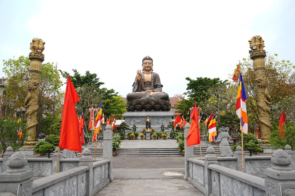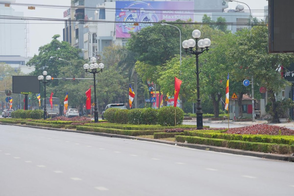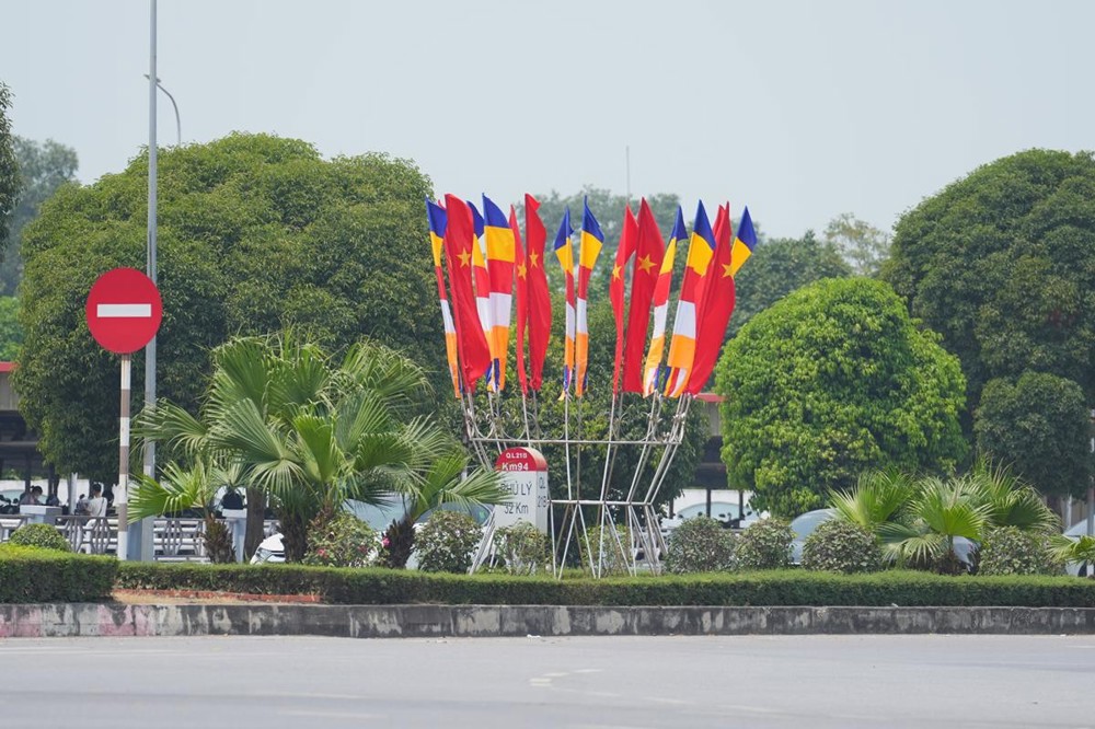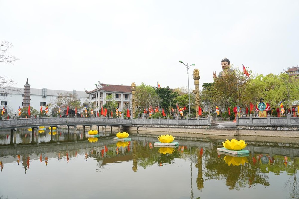Trên các tuyến đường dẫn về Thiền viện, những băng rôn biểu ngữ, hình ảnh cờ Phật giáo năm sắc xen lẫn cờ đỏ sao vàng tung bay trong gió tạo nên một bức tranh vừa thiêng liêng nhưng cũng thật rực rỡ. Mỗi lá cờ không chỉ là biểu tượng của niềm tin, mà còn là lời nhắc nhở về sự hòa hợp giữa đạo và đời, giữa lý tưởng giác ngộ và tinh thần phụng sự quê hương, đất nước.