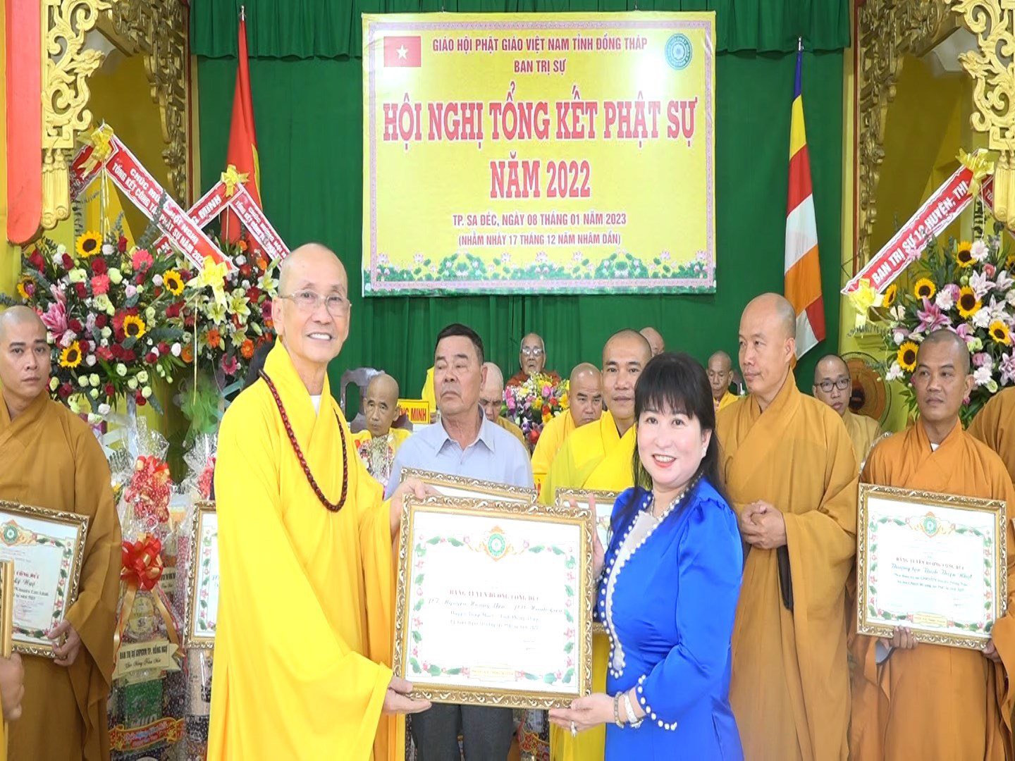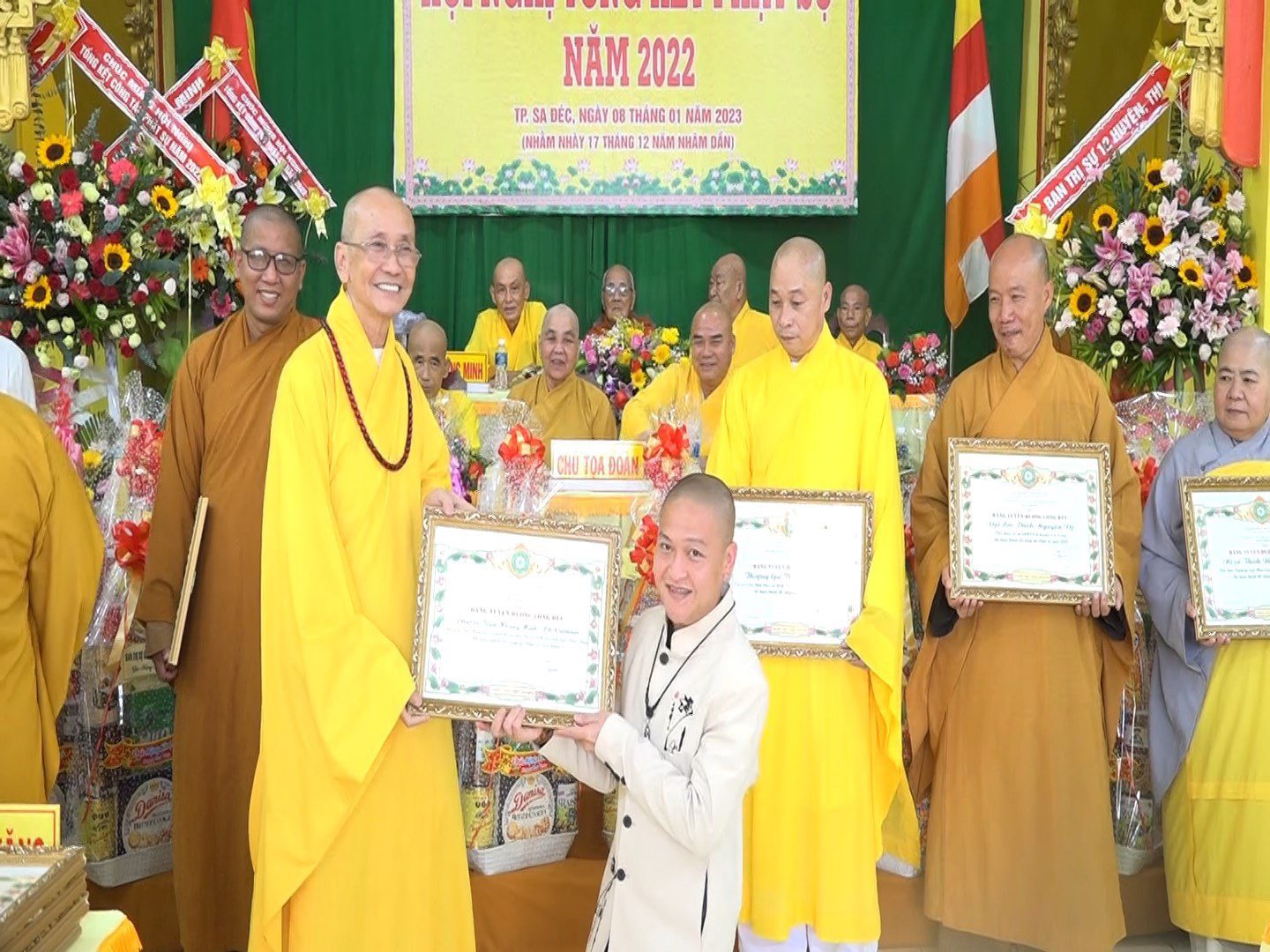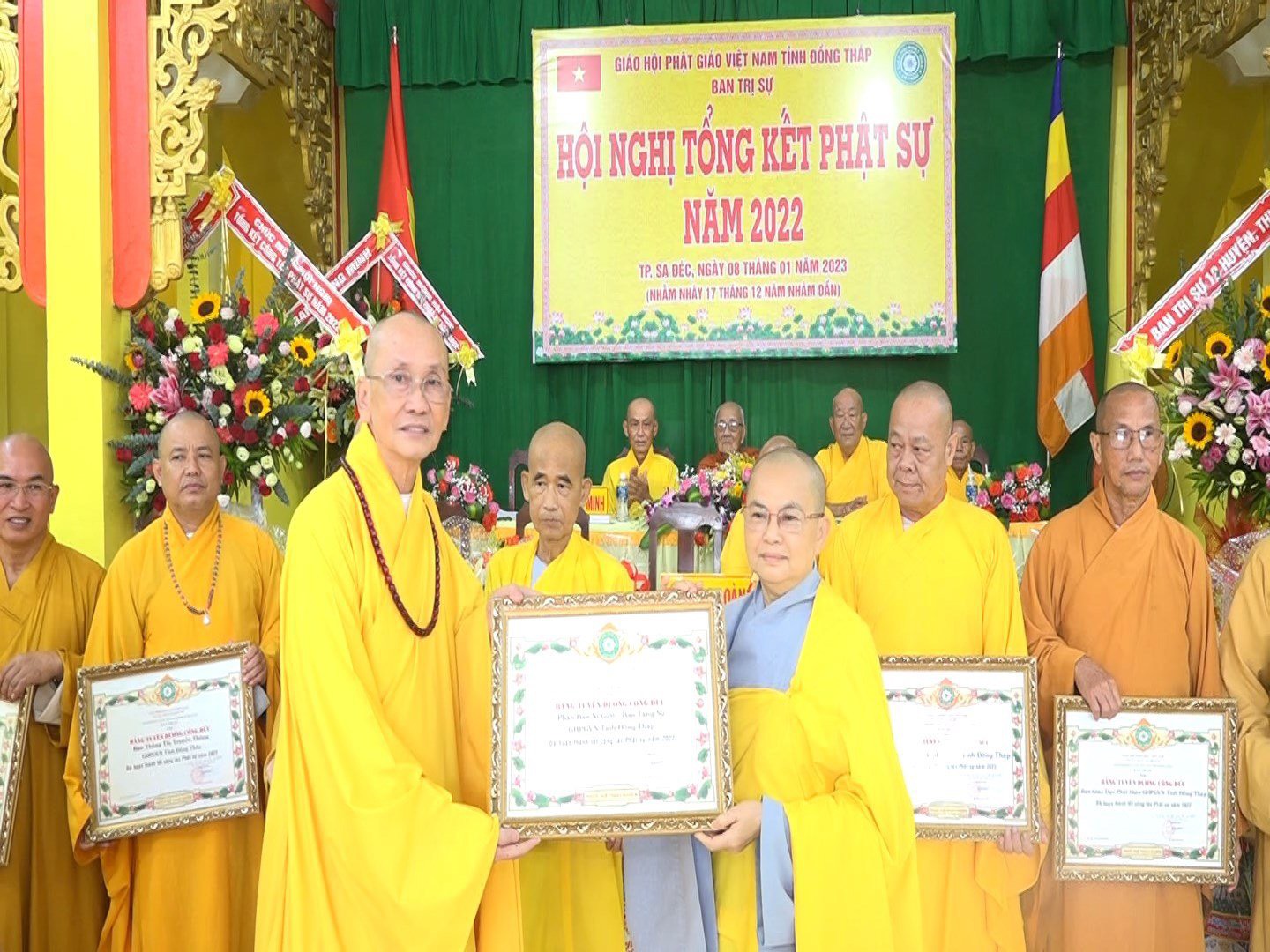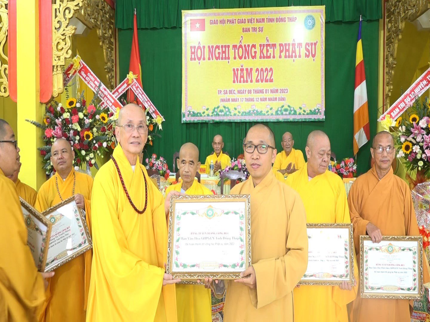 Dịp này, Ban Trị sự GHPGVN tỉnh Đồng Tháp đã tặng bằng công đức cho tập thể 11 ban ngành, Ban Trị sự cấp huyện và cá nhân có thành tích đóng góp tích cực trong công tác Phật sự trong năm 2022.