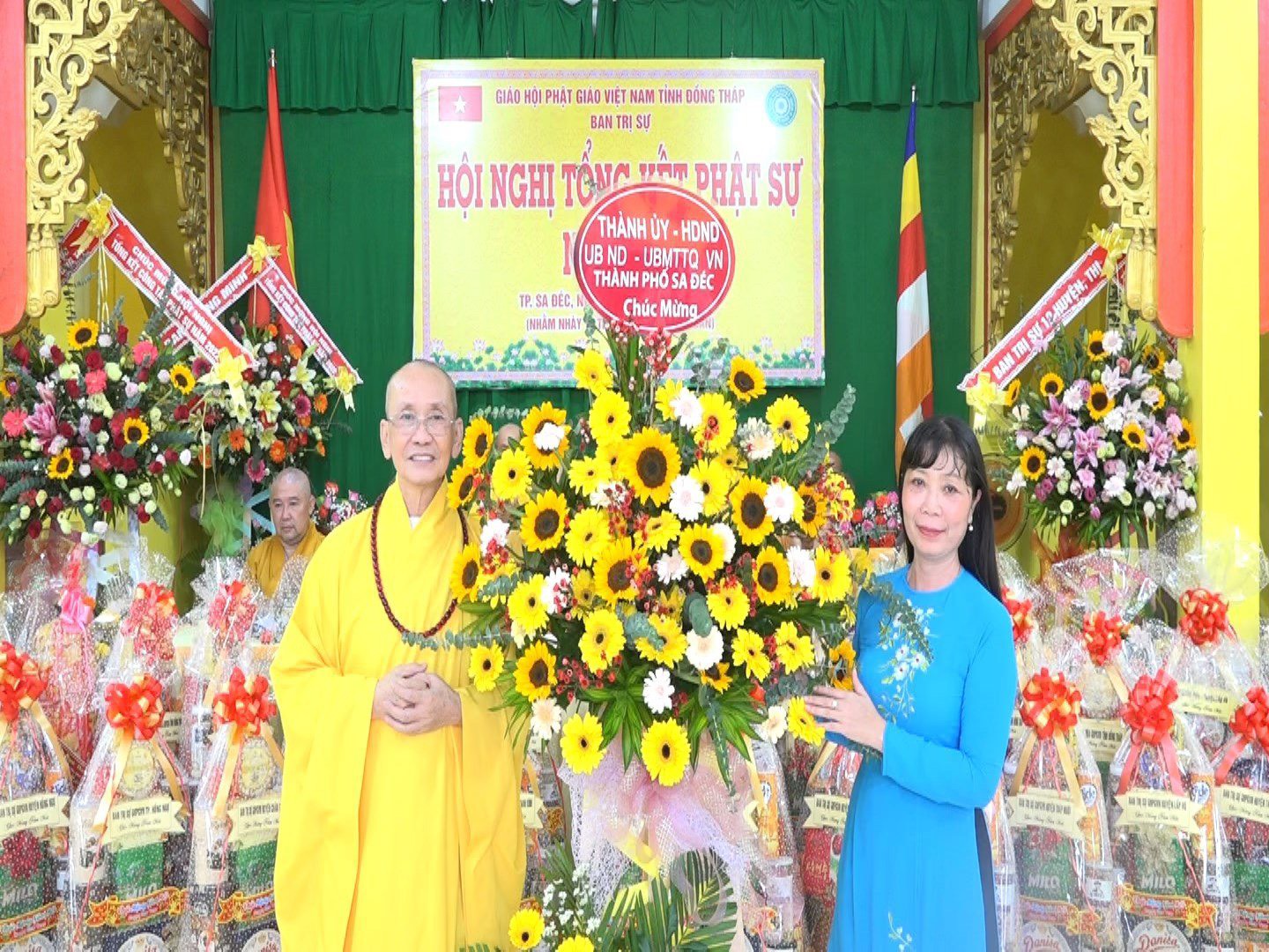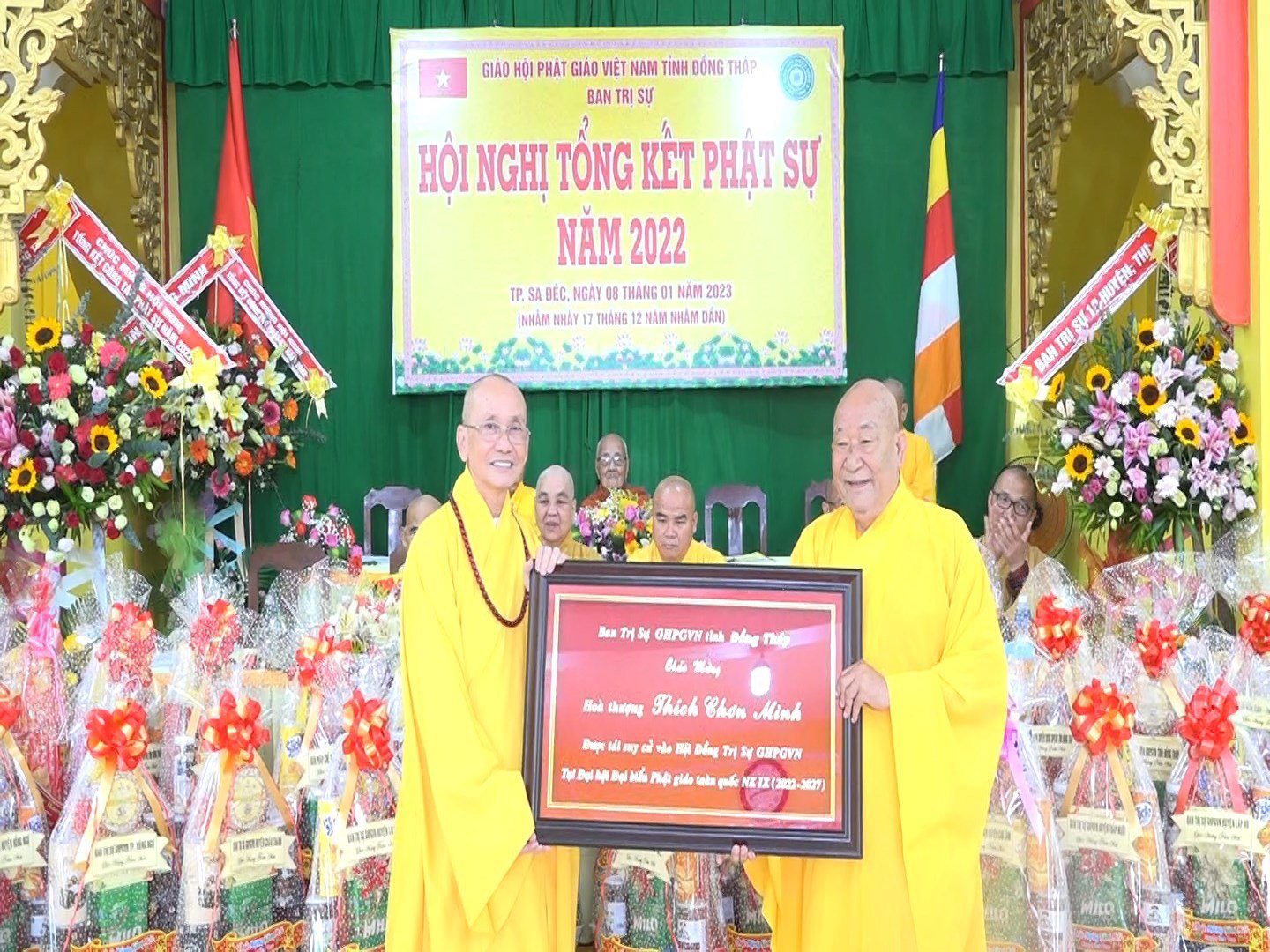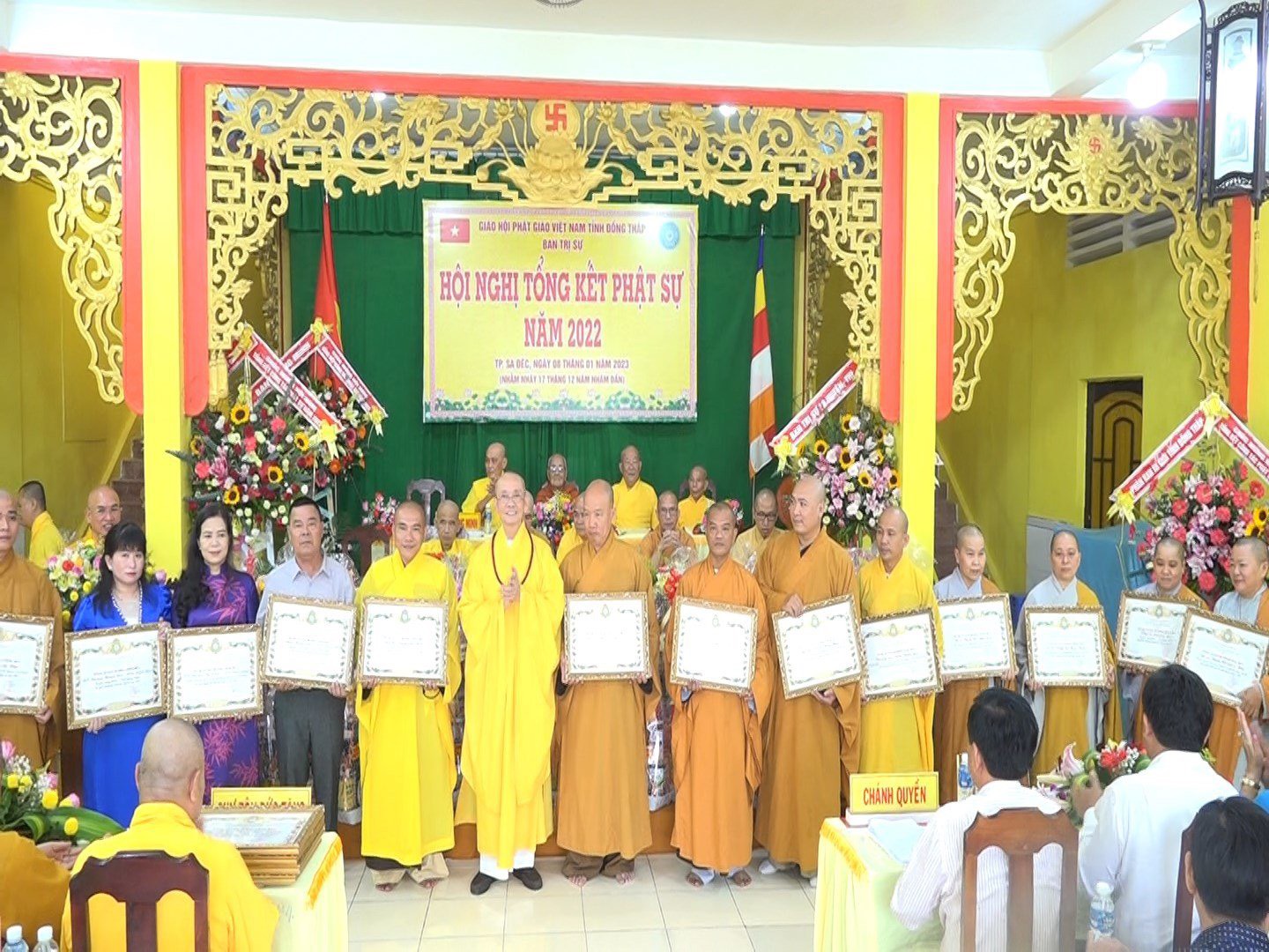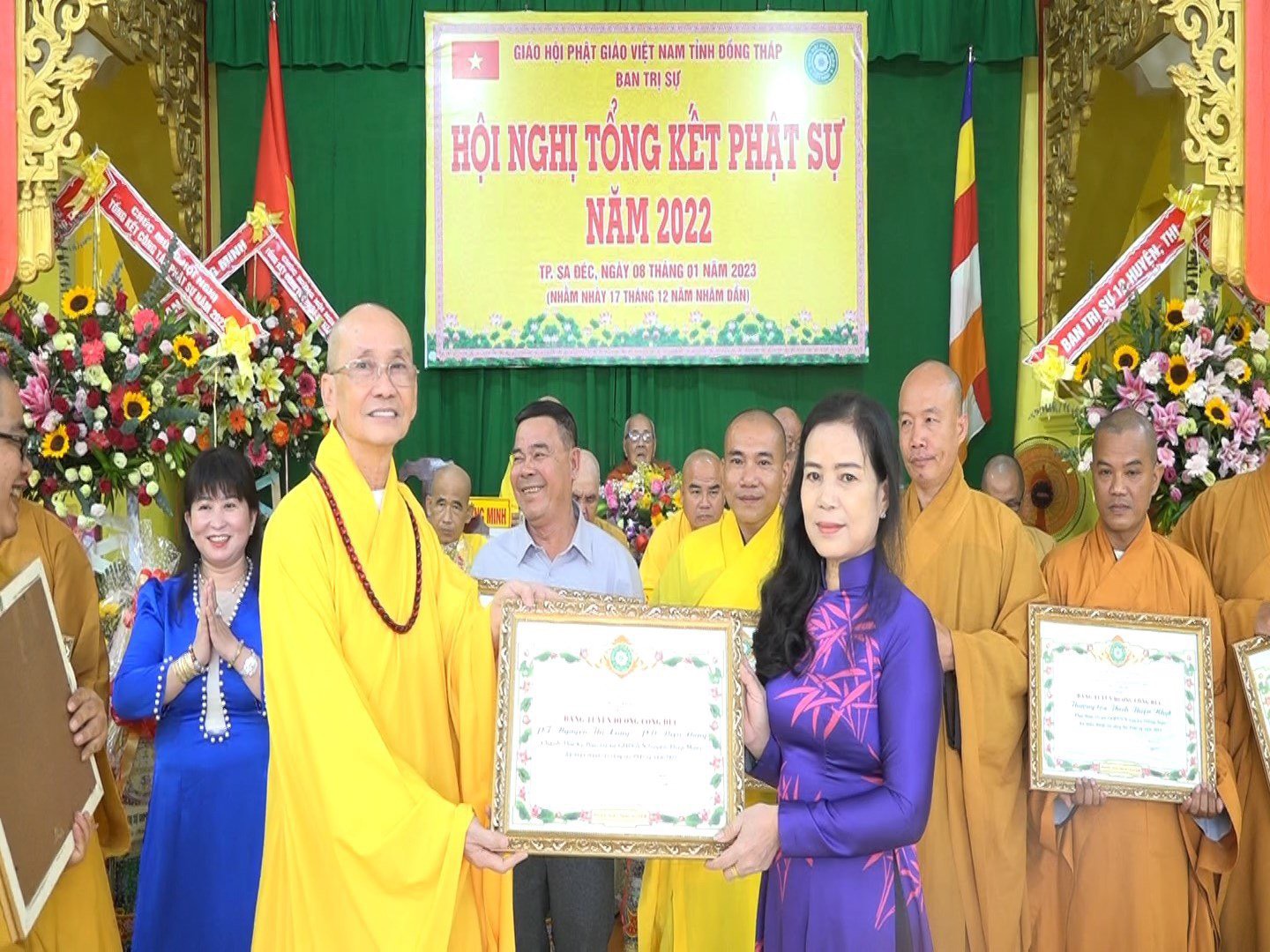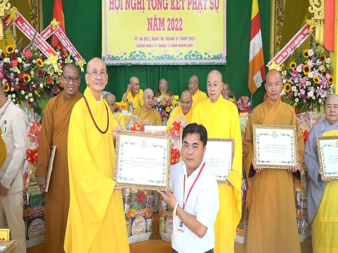 Dịp này, Ban Trị sự GHPGVN tỉnh Đồng Tháp đã tặng bằng công đức cho tập thể 11 ban ngành, Ban Trị sự cấp huyện và cá nhân có thành tích đóng góp tích cực trong công tác Phật sự trong năm 2022.