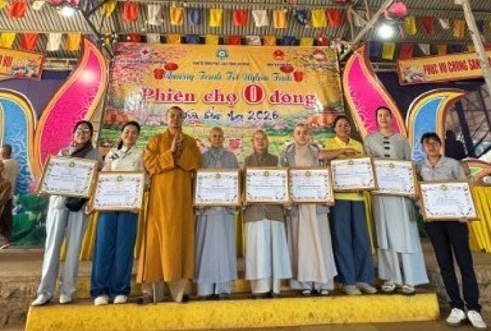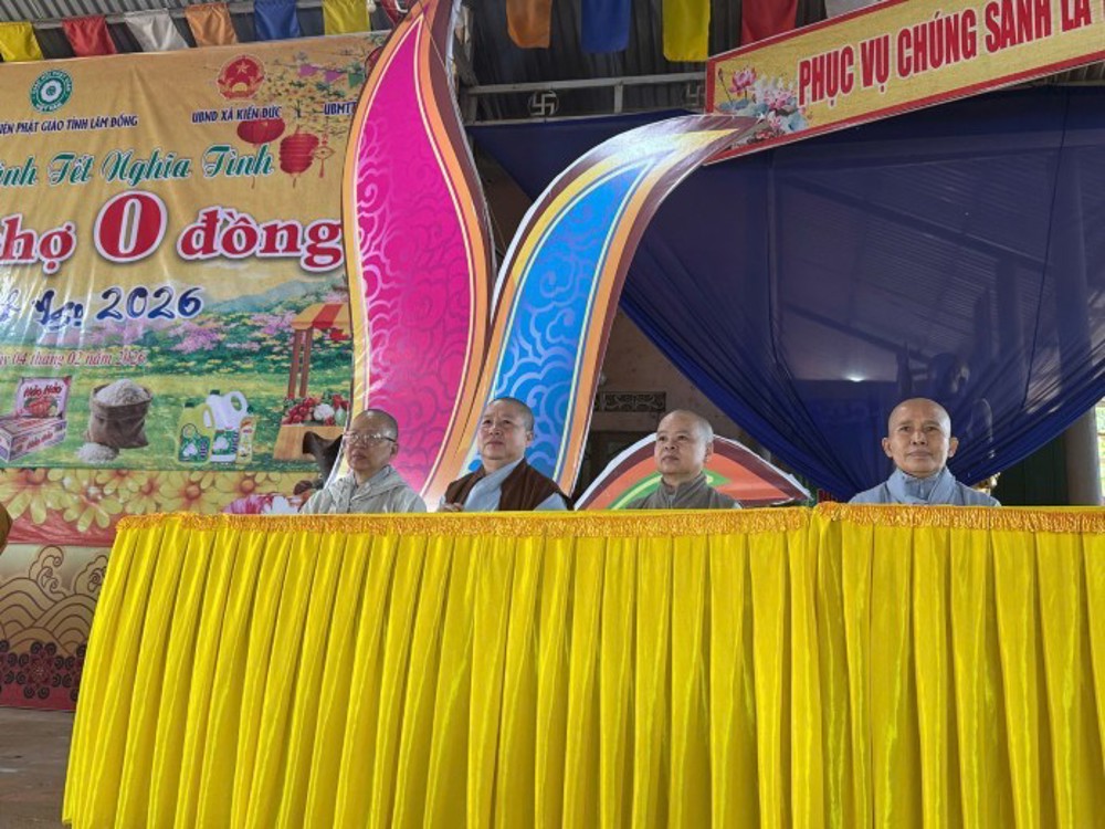 PSO - Trong không khí hân hoan của những ngày cuối năm, khi mùa Xuân mới đang về trên khắp nẻo đường quê hương, sáng ngày 04/02/2026 (nhằm ngày 17 tháng Chạp năm Ất Tỵ), tại chùa Hoa Khai (xã Kiến Đức, tỉnh Lâm Đồng), Ban Trị sự GHPGVN tỉnh Lâm Đồng và Ban Từ thiện Phật giáo tỉnh đã phối hợp cùng chính quyền địa phương long trọng tổ chức chương trình “Phiên chợ 0 đồng – Xuân Bính Ngọ 2026”.