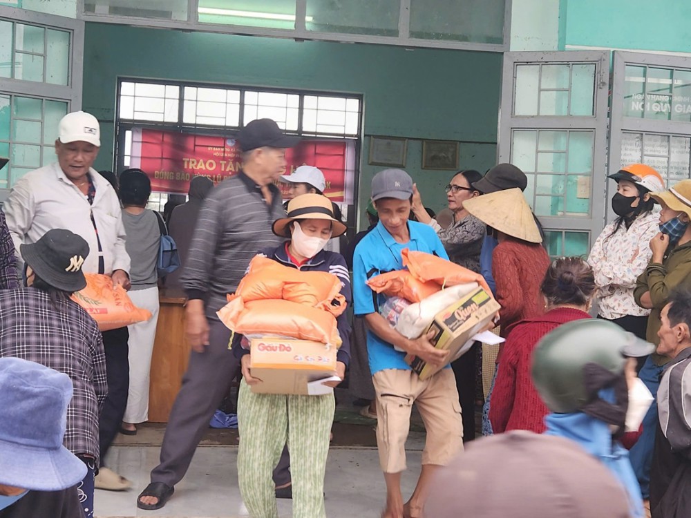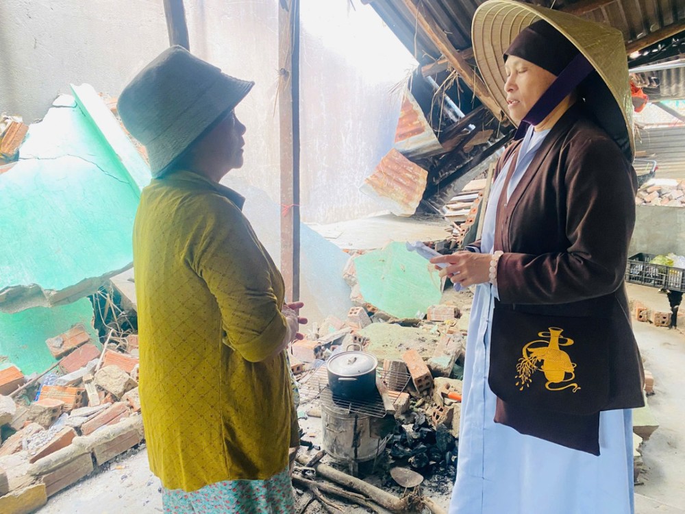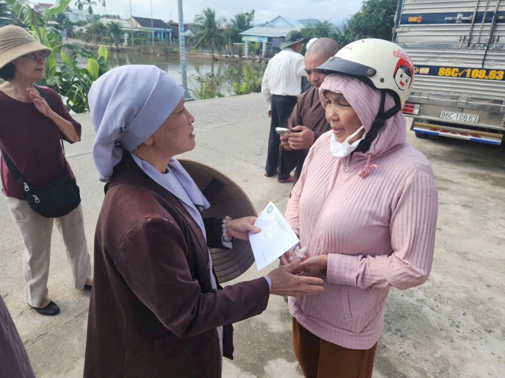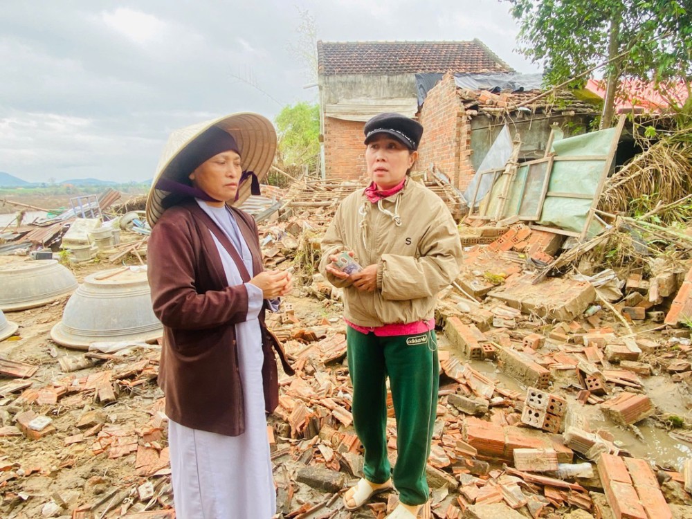 Trên những con đường còn dấu ấn của trận đại hồng thủy, nhiều ngôi nhà bị sụp đỗ hoàn toàn, cảnh tượng tiêu điều, sự hiện diện của đoàn đã mang đến làn gió ấm từ bi và nghĩa đồng bào lá lành đùm lá rách, giúp dho thôn xóm thêm phần ấm áp, hân hoan. Bên cạnh việc trao quà, đoàn còn tặng thêm các gia đình có người mất hoặc nhà cửa sập… mỗi hộ 2 triệu đồng, nhằm hỗ trợ đồng bào sớm khắc phục.