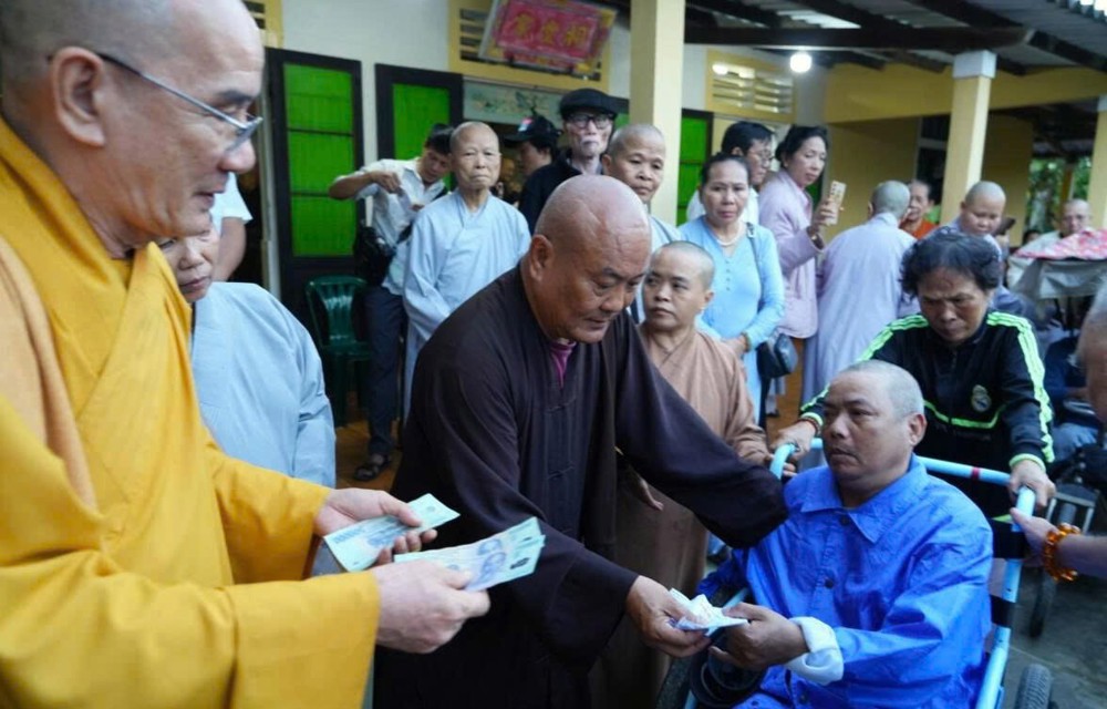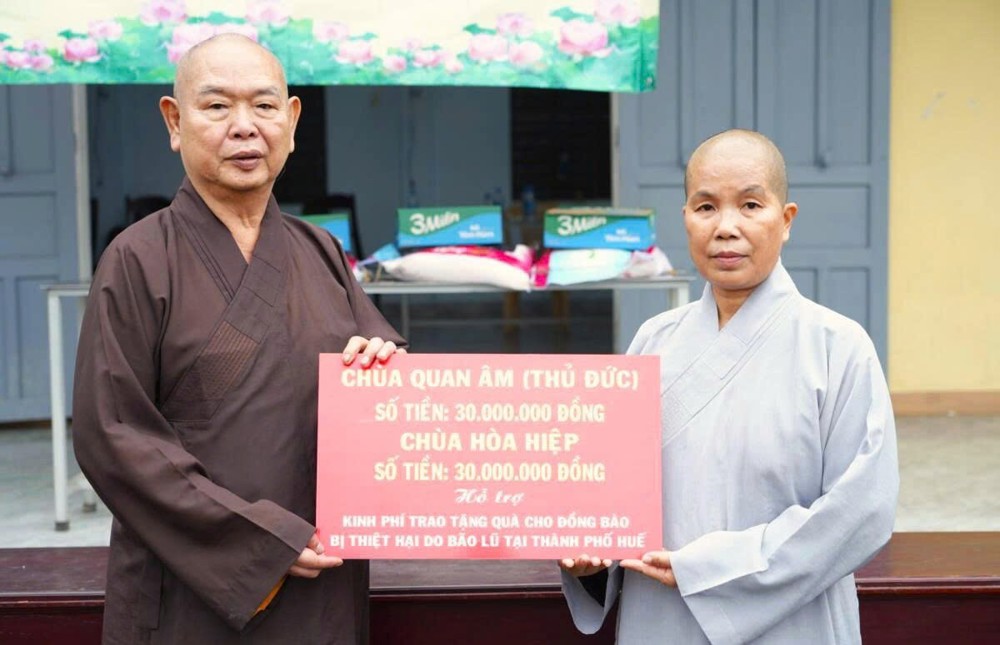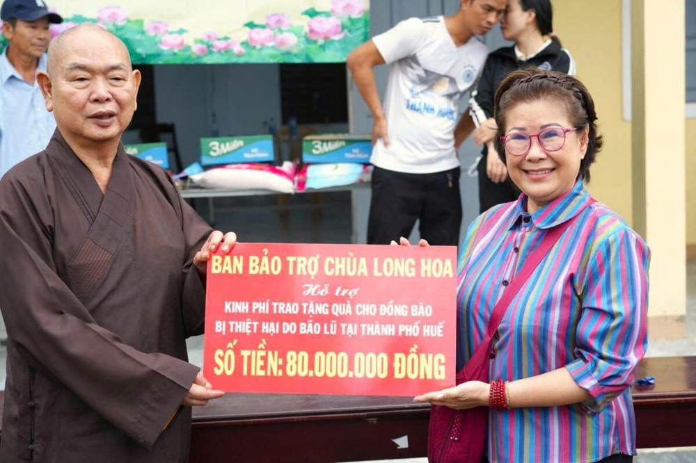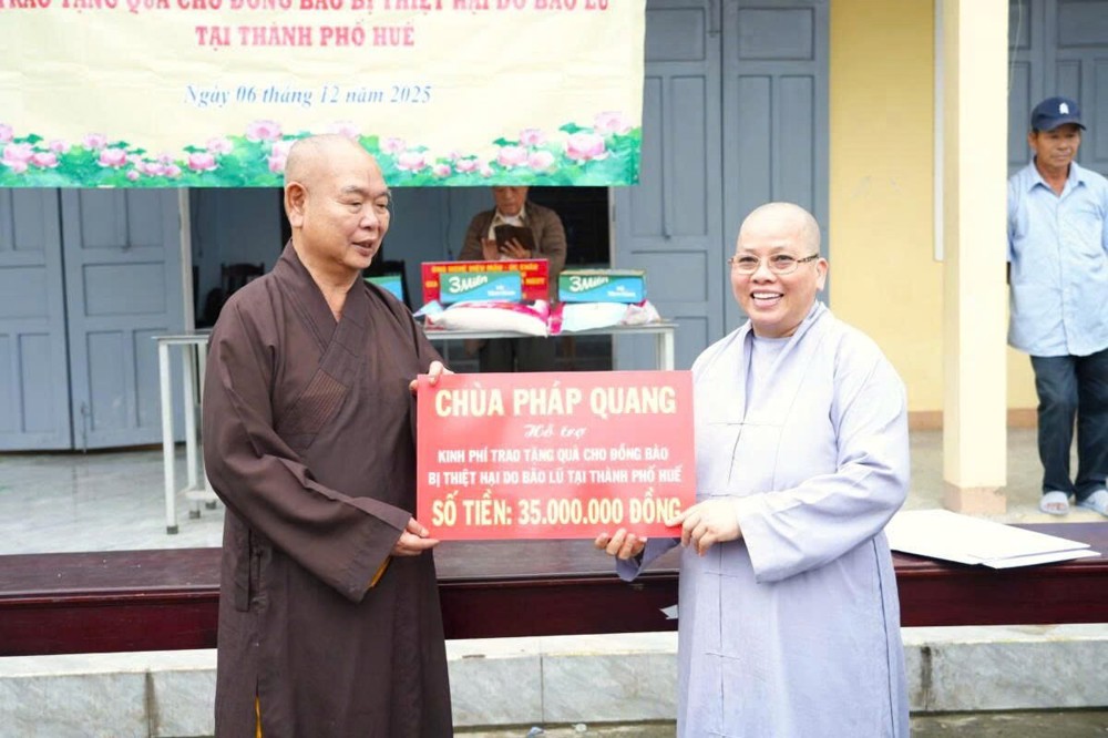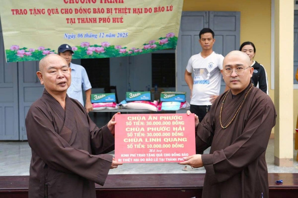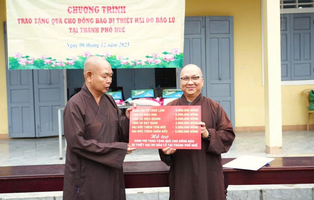 Sau đó, đại diện đoàn Hòa thượng Thích Chơn Tịnh, Trụ trì chùa Thường Quang, tiếp tục trao quà và bàn giao 2 căn nhà tình thương tại tỉnh Quảng Trị. Tổng giá trị quà tặng hỗ trợ tại TP. Huế và Quảng Trị hơn 2 tỷ đồng.
