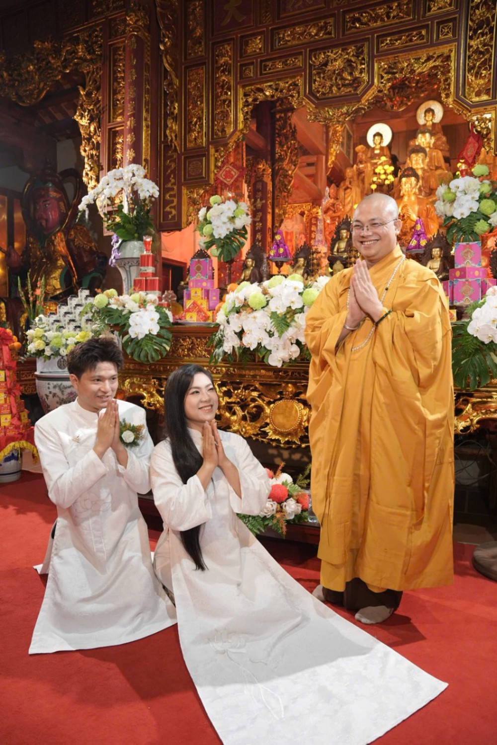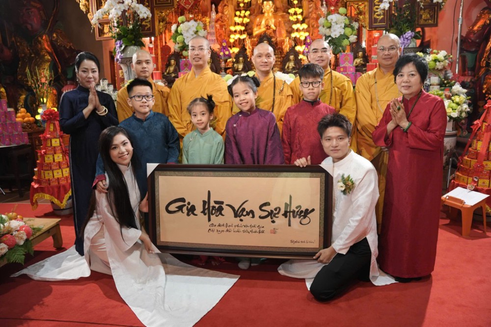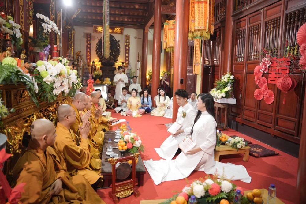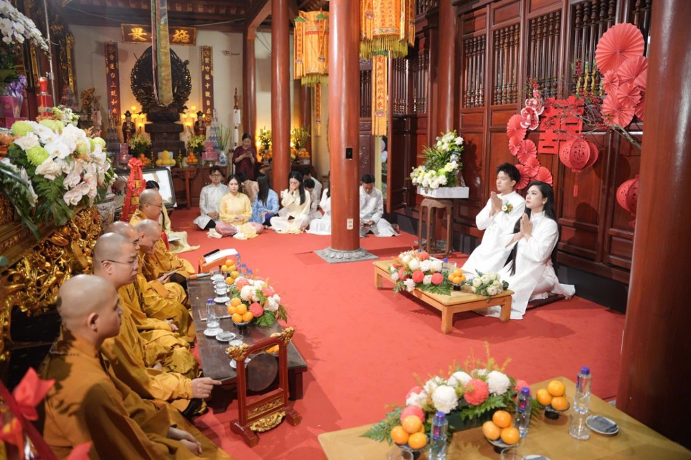 Cuối buổi lễ, Đại đức trụ trì cùng chư Tôn đức chứng minh và toàn thể đại chúng đã cử hành nghi thức chúc phúc, cầu nguyện cho đôi bạn trẻ “trăm năm tình viên mãn, bạc đầu nghĩa phu thê”.