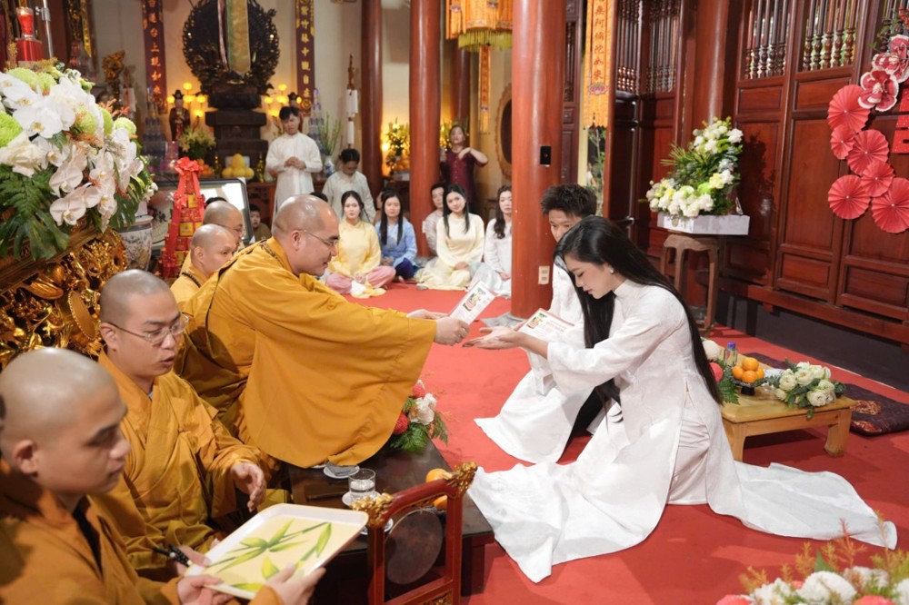 Trước khi chính thức cử hành nghi lễ Hằng Thuận, đôi bạn trẻ đã được chư Tăng tác pháp Quy y Tam Bảo và trao truyền Ngũ giới, lấy đó làm kim chỉ nam cho đời sống hôn nhân và tu tập. Tại buổi lễ, Đại đức Thích Giác Hợp đã truyền trao Tam Quy, Ngũ giới và ban thời pháp thoại ngắn, chia sẻ những lời khuyên thiết thực giúp đôi tân lang, tân nương nhận thức sâu sắc hơn về trách nhiệm trong đời sống gia đình, sống đúng theo lời Phật dạy, giữ gìn năm giới của người Phật tử tại gia, xây dựng gia đình trên nền tảng đạo đức Phật giáo.