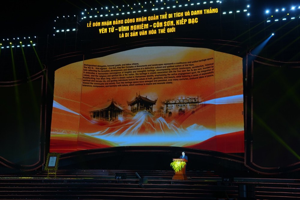 Tối ngày 20/12/2025, tại Quảng trường Minh Tâm (Khu di tích và danh thắng Yên Tử, Quảng Ninh) đã diễn ra lễ đón nhận bằng UNESCO ghi danh quần thể di tích và danh thắng Yên Tử - Vĩnh Nghiêm - Côn Sơn, Kiếp Bạc là Di sản văn hóa thế giới. Đây là một không gian văn hóa, lịch sử, tâm linh gắn với thiền phái Phật giáo Trúc Lâm do Phật hoàng Trần Nhân Tông sáng lập, mang tinh thần nhập thế sâu sắc, dung hợp Phật giáo với văn hóa dân tộc.