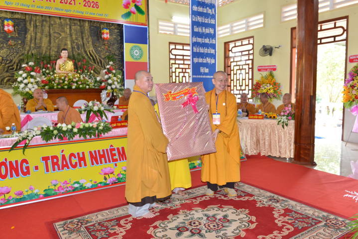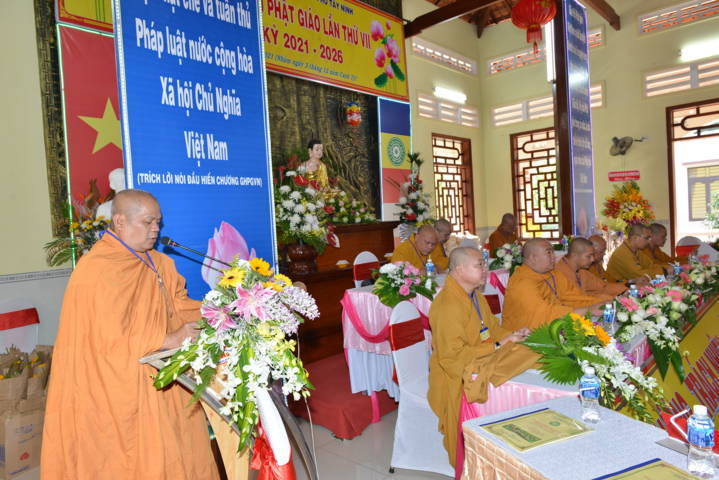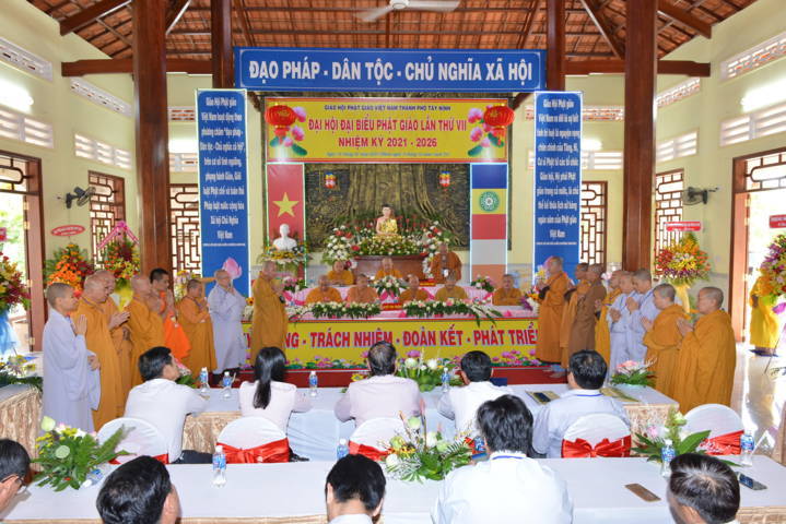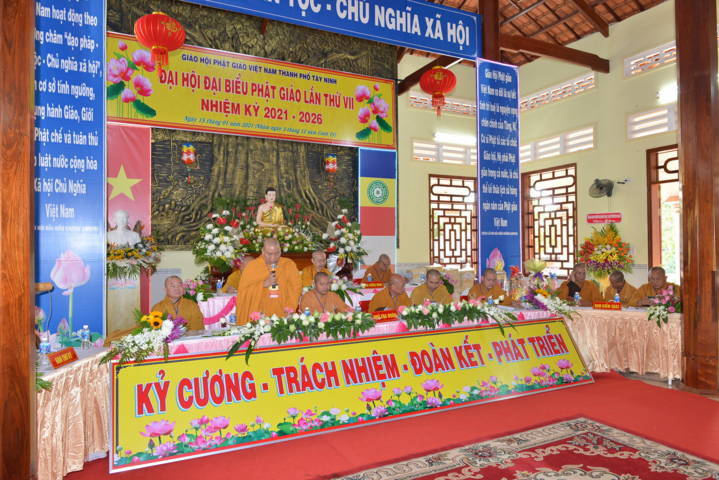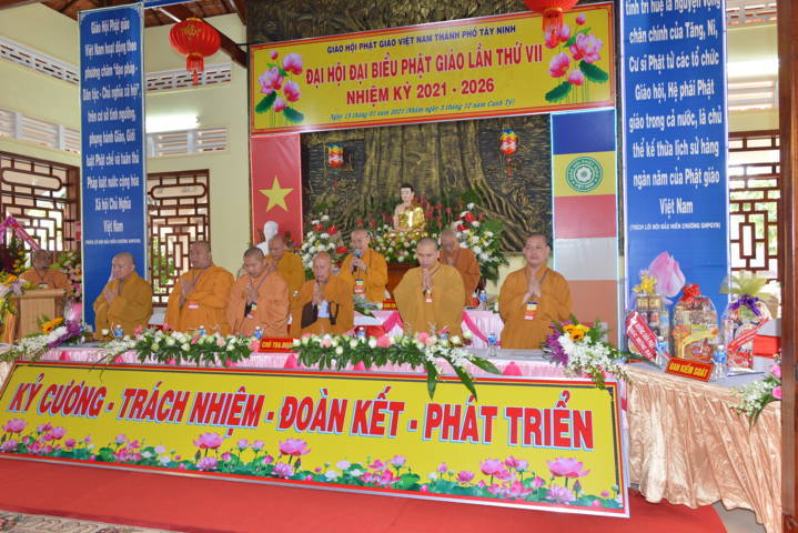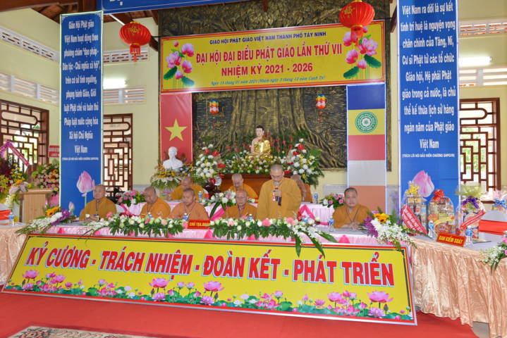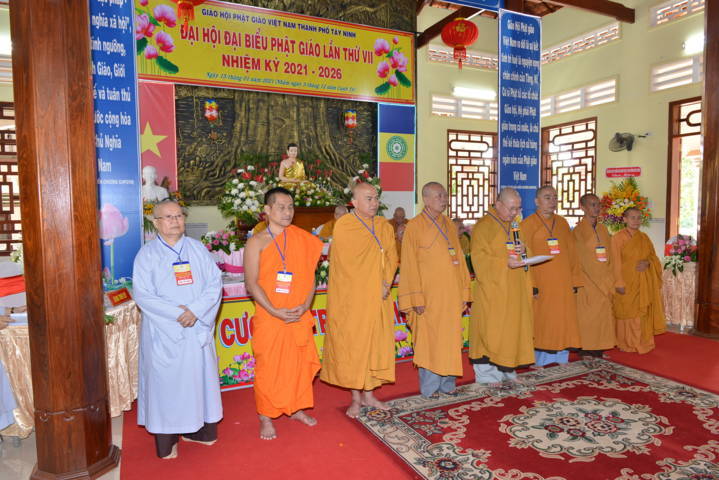 Thay lời Hòa thượng Trưởng BTS GHPGVN TP. Tây Ninh nhiệm kỳ 2016 - 2021 cùng toàn BTS, ĐĐ. Thích Nghiêm Lâm tuyên bố mãn nhiệm kỳ và giới thiệu danh sách chư Tôn đức Tăng Ni tham gia BTS GHPGVN TP. Tây Ninh, nhiệm kỳ 2021 - 2026 gồm 16 vị.