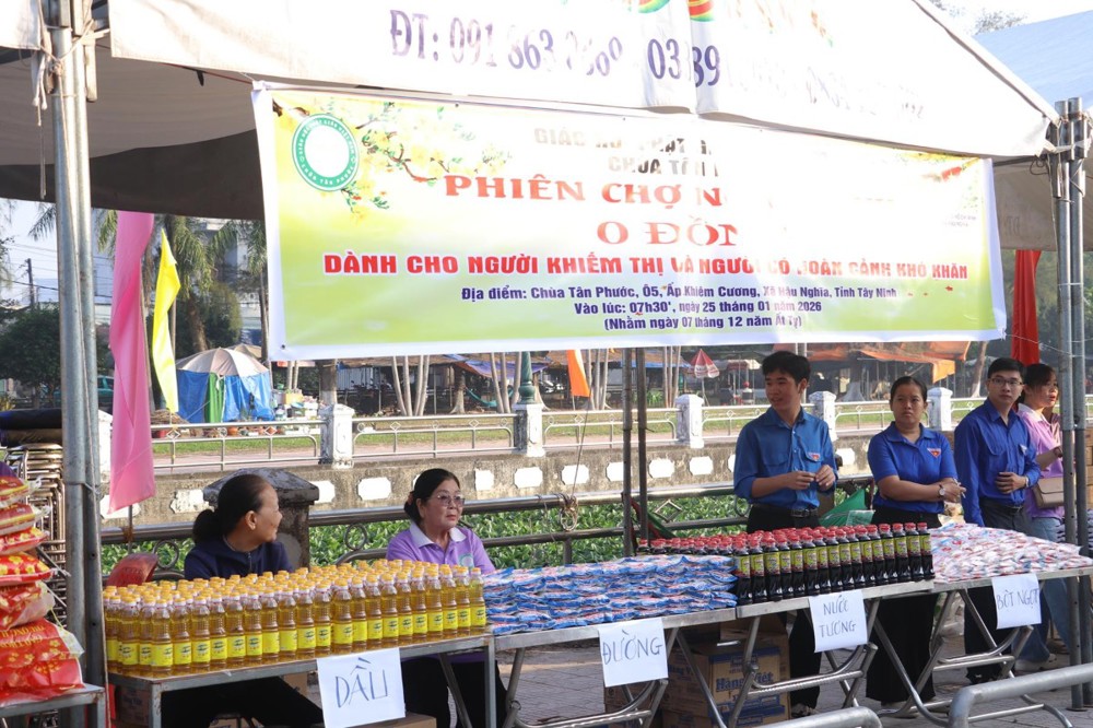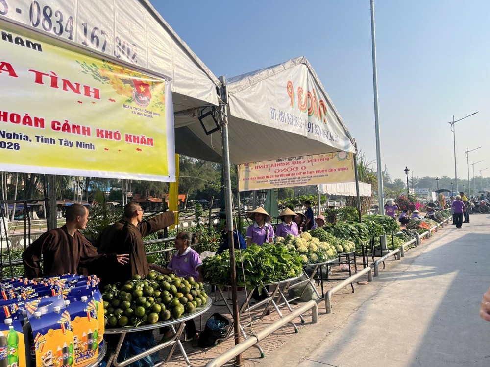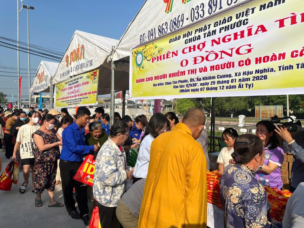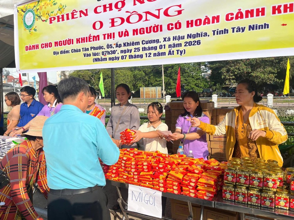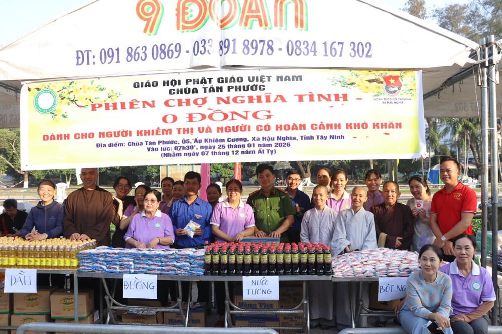 PSO - Sáng ngày 25/01/2026 (nhằm ngày 07/12 năm Ất Tỵ), tại chùa Tân Phước, ấp Khiêm Cương, xã Hậu Nghĩa, tỉnh Tây Ninh, Sư cô Thích Nữ Trung Hiếu – Trụ trì chùa Tân Phước, cùng đạo tràng Phật tử đã kết nối các mạnh thường quân, nhà tài trợ tổ chức Phiên chợ Nghĩa tình 0 đồng lần thứ 5, nhân dịp chào đón năm mới 2026 (Bính Ngọ). Được biết, phiên chợ do chùa Tân Phước phối hợp với Đoàn Thanh niên xã Hậu Nghĩa tổ chức.