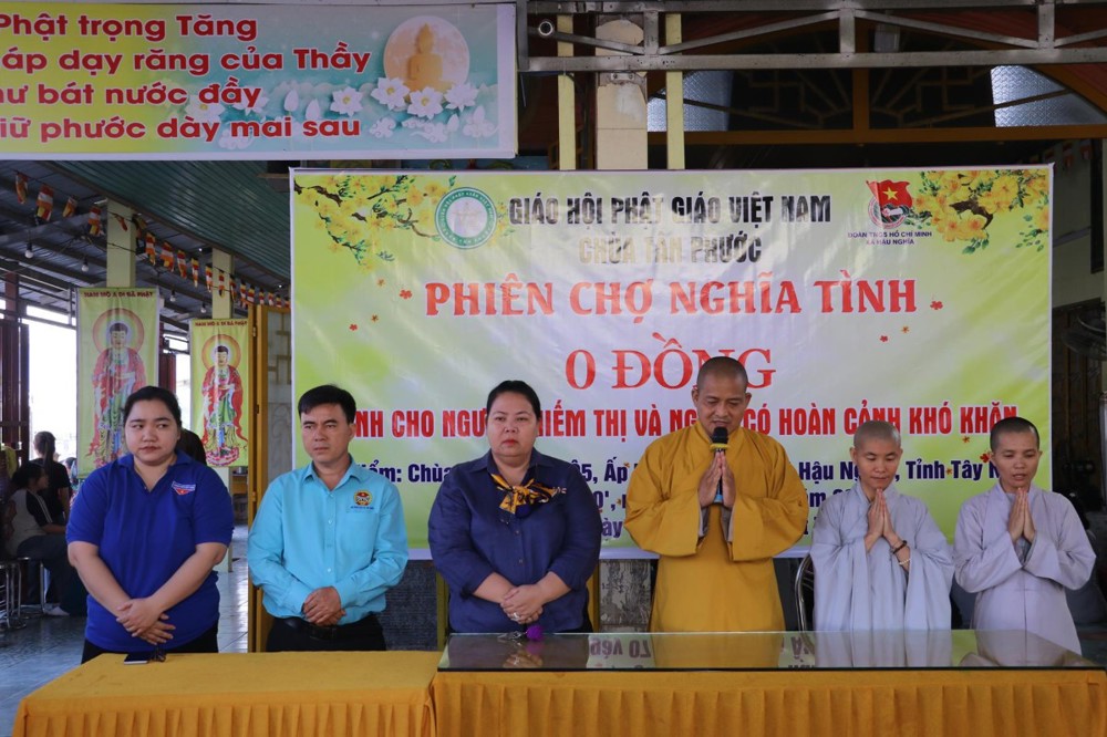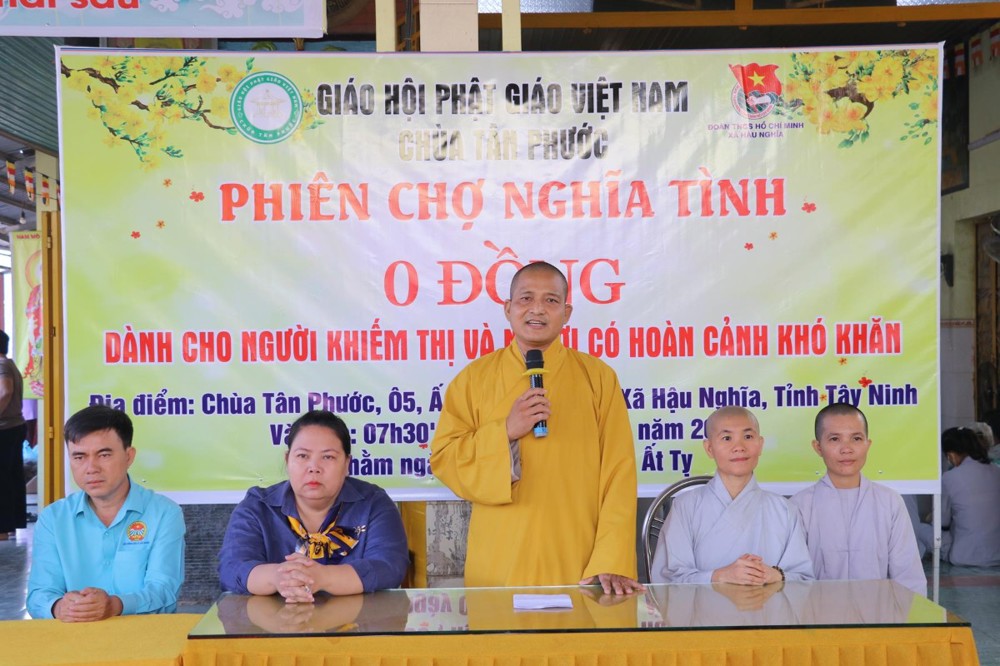 Phát biểu tại lễ khai mạc, TT. Thích Lệ Duyên đã tán thán công đức của Sư cô Trụ trì, đạo tràng Phật tử và các mạnh thường quân đã chung tay tổ chức Phiên chợ Nghĩa tình đầy ý nghĩa. Thượng tọa cho biết, đây là hoạt động thiết thực được duy trì định kỳ hằng năm tại chùa Tân Phước, thể hiện tinh thần từ bi, sẻ chia của người con Phật đối với cộng đồng. Dịp này, Thượng tọa cũng kính chuyển lời chúc tốt đẹp của Hòa thượng Thích Minh Thiện – Ủy viên Hội đồng Trị sự, Phó Trưởng ban Hoằng pháp Trung ương, Cố vấn – Chứng minh Ban Trị sự GHPGVN tỉnh Tây Ninh đến toàn thể đại chúng và các cấp lãnh đạo hiện diện.