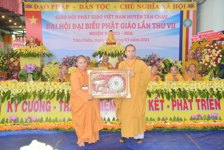 ĐĐ. Thích Thiện Trí (Minh Trực) – Tân trưởng BTS GHPGVN huyện Tân Châu cùng toàn thể thành viên BTS nhiệm kỳ mới 2021 - 2026 đã tuyên thệ nhận nhiệm vụ. Tân BTS GHPGVN huyện Tân Châu đã đón nhận nhiều lẵng hoa, phần quà chúc mừng của các BTS tỉnh/huyện/thị xã/thành phố.