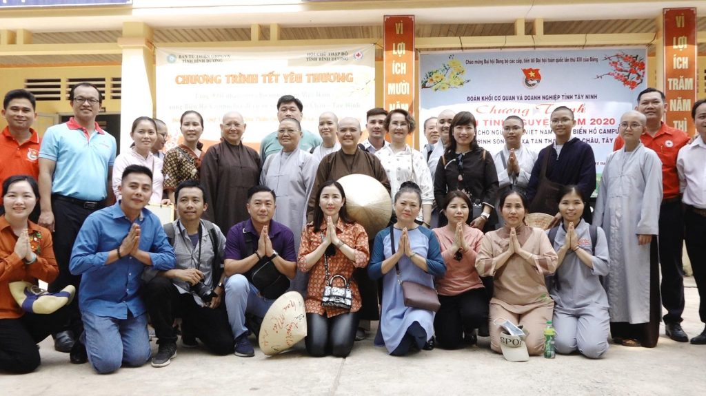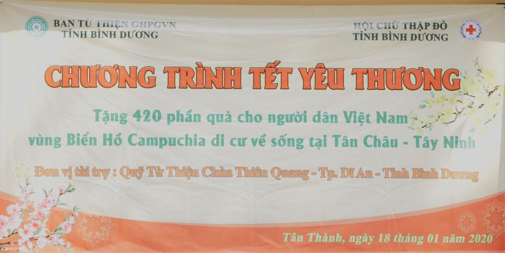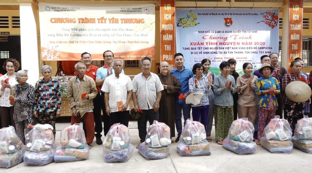 PSO - Sáng ngày 18/1/2020 (nhằm ngày 24/12 năm Kỷ Hợi), hội từ thiện chùa Thiên Quang kết hợp với Quỹ Từ thiện Hội chữ Thập Đỏ tỉnh Bình Dương và Ban Từ thiện Xã hội GHPGVN tỉnh Bình Dương đã đến xã Tân Thành, huyện Tân Châu, tỉnh Tây Ninh cùng Đoàn, Khối cơ quan và doanh nghiệp tỉnh Tây Ninh trao quà cho bà con có hoàn cảnh khó khăn, chủ yếu là đồng bào người Việt Nam tại Biển Hồ Campuchia di cư về Tây Ninh nhân dịp xuân về.