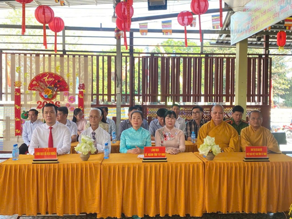 Quang lâm chứng minh và tham dự buổi lễ có Thượng tọa Thích Nhuận Thành – Trưởng ban Kinh tế – Tài chính GHPGVN tỉnh Tây Ninh, cùng chư Tôn đức Tăng Ni. Về phía lãnh đạo chính quyền có bà Huỳnh Thị Thu Năm – Tỉnh ủy viên, Phó Trưởng ban Tuyên giáo và Dân vận Tỉnh ủy; bà Trương Thị Phương Thảo – Giám đốc Sở Dân tộc và Tôn giáo; ông Trương Tấn Sơn – Bí thư Đảng ủy xã Hậu Nghĩa, cùng đại diện các ban, ngành và đông đảo bà con nhân dân địa phương.