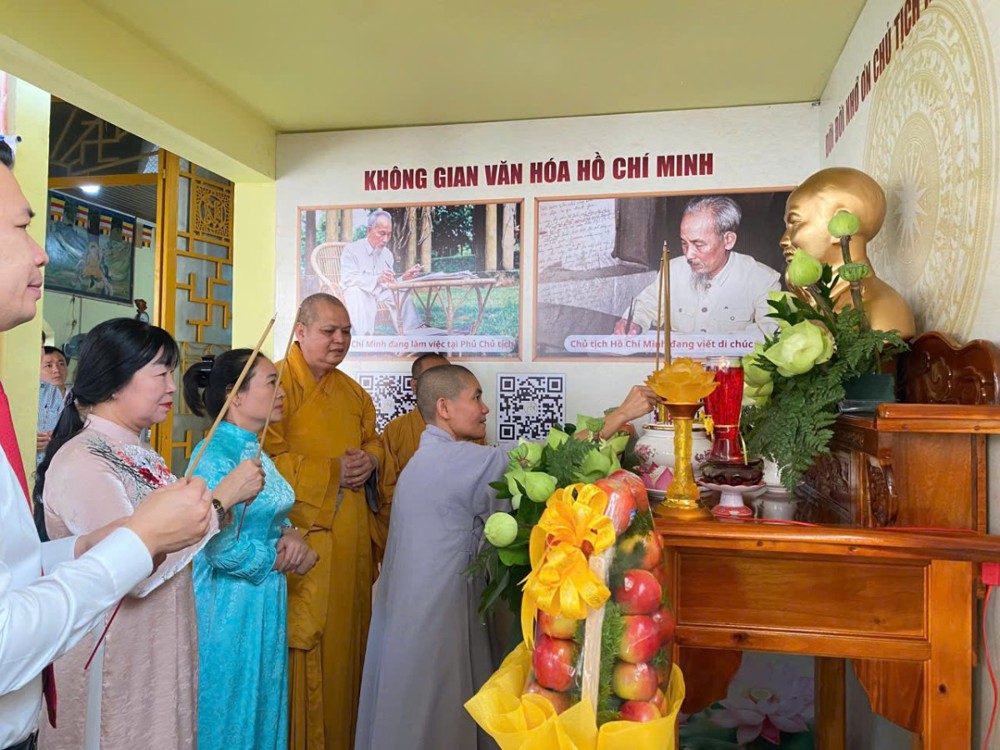 Khu vực thờ Bác Hồ được bài trí trang nghiêm, ấm cúng, là nơi để Tăng Ni, Phật tử và nhân dân thể hiện lòng tôn kính, tri ân vị Cha già của dân tộc.