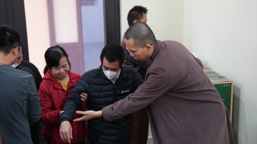 Thấu hiểu và sẻ chia với những nỗi niềm ấy, với tinh thần từ bi cứu khổ, tại điểm trao quà đầu tiên - chùa Văn Môn, xã Thư Vũ (tỉnh Hưng Yên), đoàn đã gửi tặng 200 phần quà hỗ trợ người dân gặp hoàn cảnh khó khăn, những bệnh nhân đang điều trị tại Bệnh viện Da liễu Văn Môn. Được biết, chùa Văn Môn được xây dựng từ năm 1997 tại làng cộng đồng Văn Môn (xã Vũ Vân, huyện Vũ Thư, tỉnh Thái Bình cũ) – nơi chữa trị bệnh phong cho bà con nhân dân. Nhờ có Phật giáo, có quý Thầy, các bệnh nhân đã phần nào được xoa dịu các nỗi đau về thể xác và tinh thần, hiểu thấu về nhân quả. Hiện nay Bệnh viện không còn bệnh nhân lưu trú, nhưng họ vẫn thường xuyên về chùa như một mái nhà tâm linh để nương tựa.