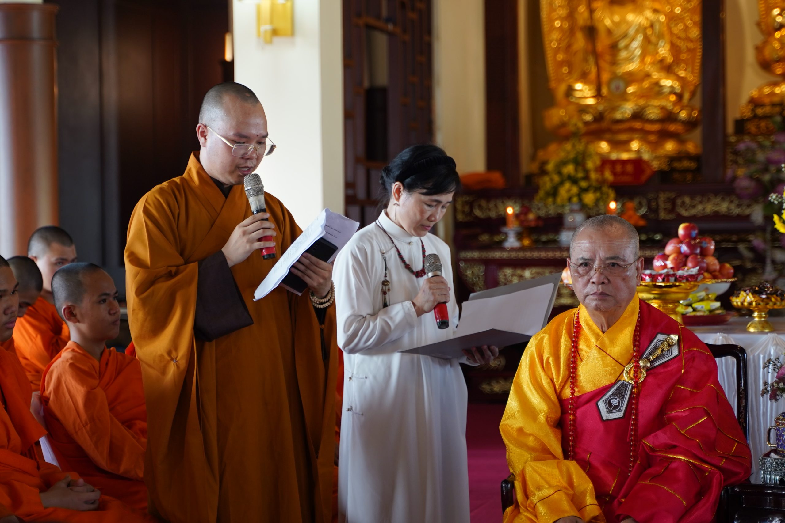 Trước đó, chư Tôn đức đã trang nghiêm cử hành Trai đàn chẩn tế, cầu nguyện Thế giới hoà bình, âm siêu dương thái. Buổi lễ do Hoà thượng Thích Huệ Phước đương vi Sám chủ cử hành Pháp sự cùng chư Tôn đức Ban kinh sư của phái đoàn.