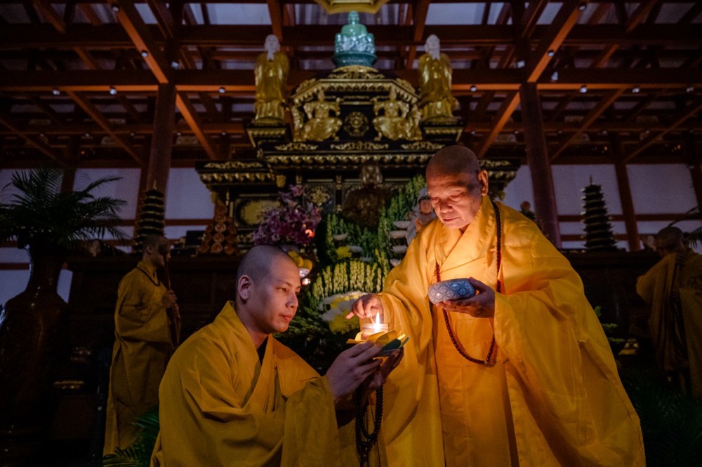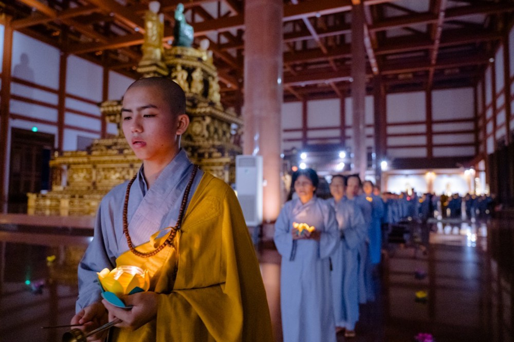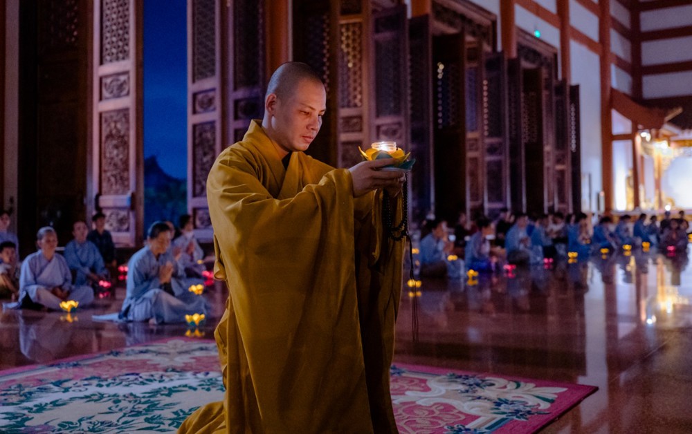 Sau khi dâng hương bạch Phật và tụng kinh cầu nguyện, Trưởng lão Hòa thượng Viện chủ đã thỉnh ngọn lửa từ bi và trí tuệ từ lễ đài để truyền lần lượt cho chư Tăng và đến hàng Phật tử. Ngọn lửa thiêng lan tỏa trong ánh sáng lung linh của hàng trăm ngọn nến, tượng trưng cho tinh thần từ bi cứu khổ, soi sáng tâm thức và niềm tin hướng thiện.