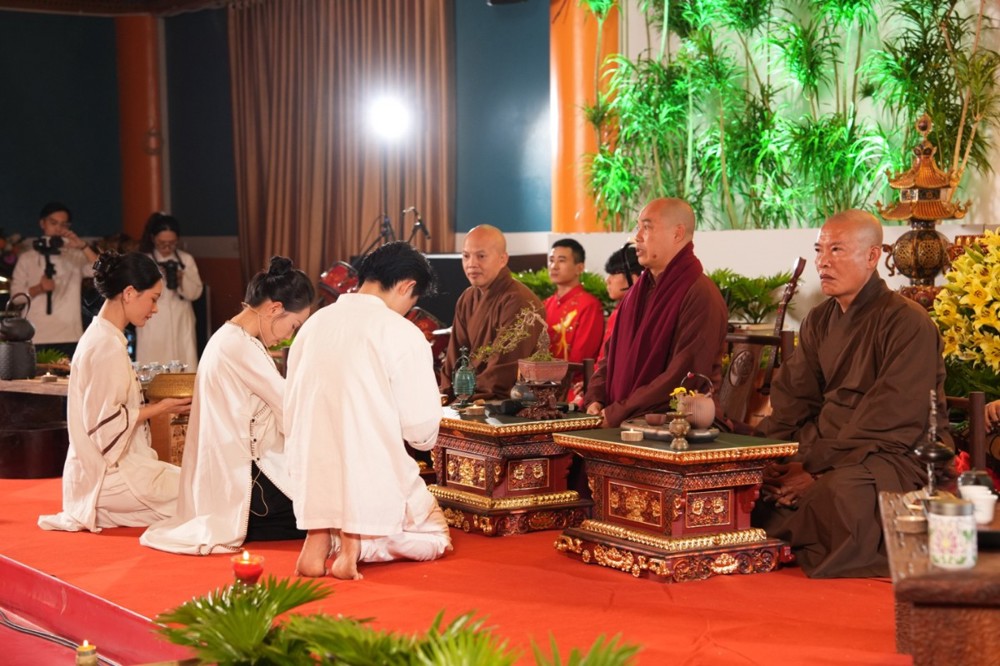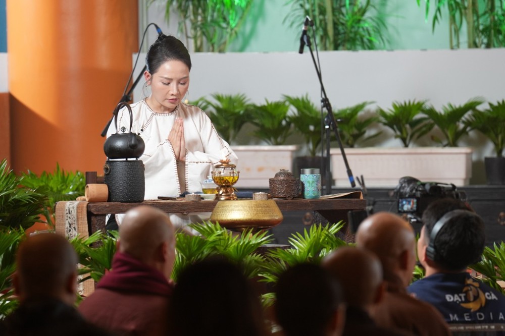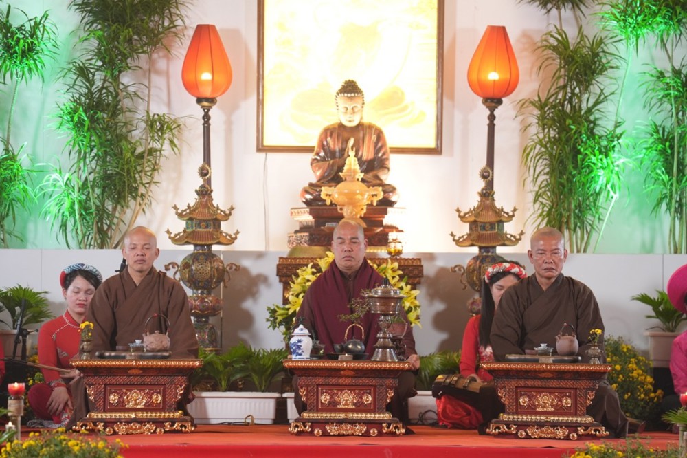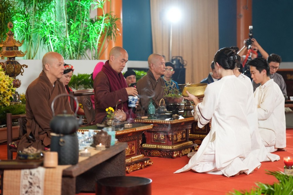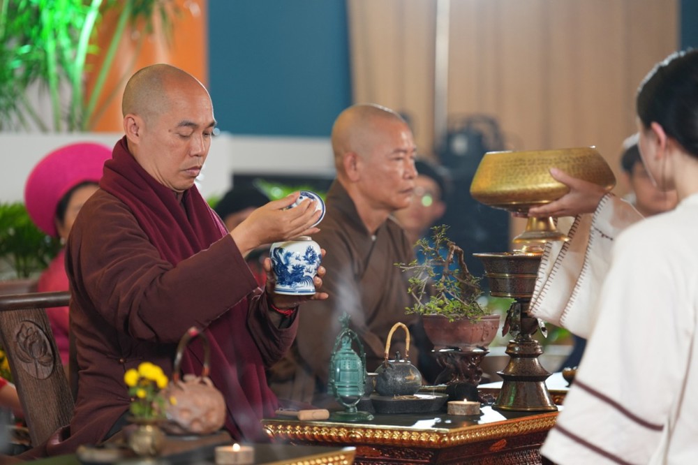Trong giờ phút tĩnh lặng của không gian thiền trà nghi thức thiêng liêng dâng những chén trà đầu tiên lên Ban Tam Bảo đã được thực hiện bởi trà sư Sương Mai mở màn cho buổi thiền trà đầy lắng đọng.