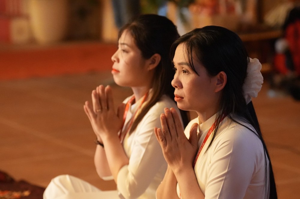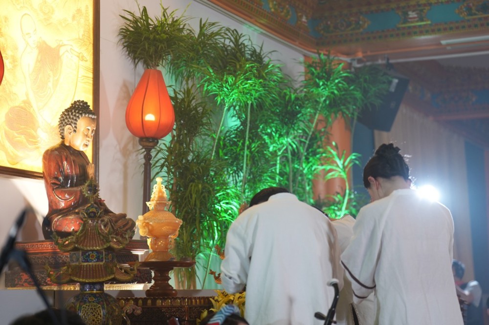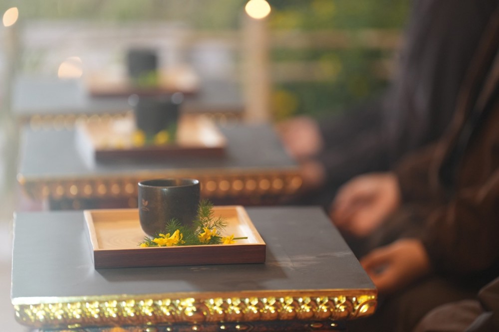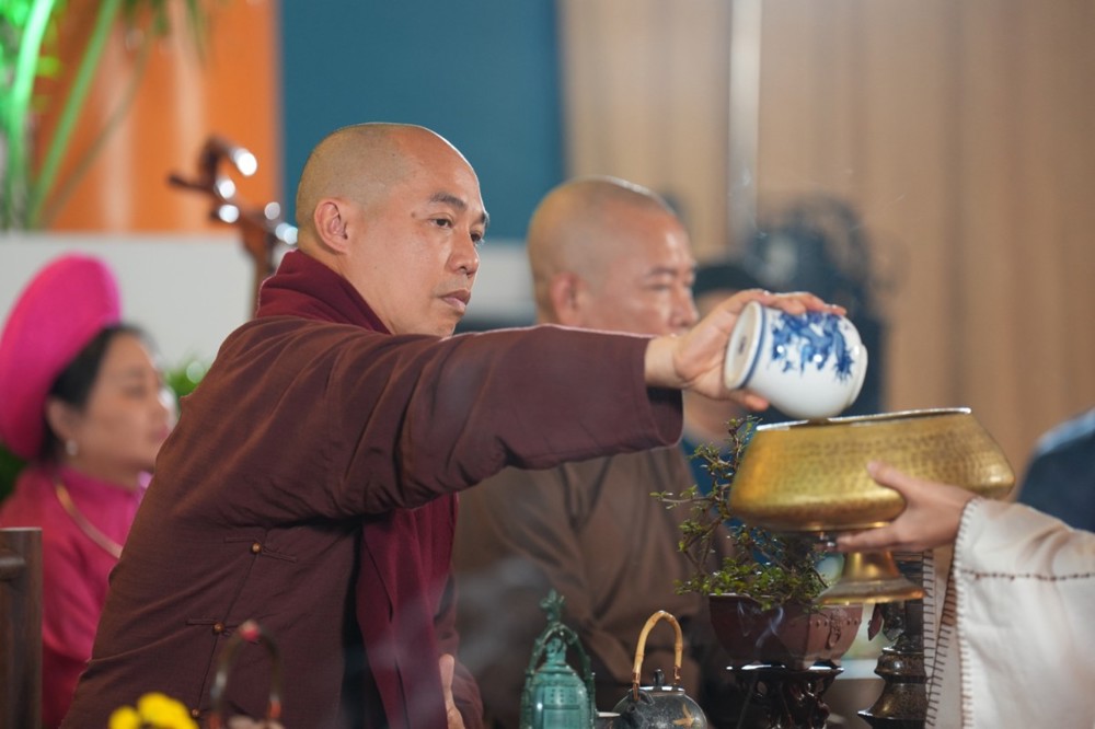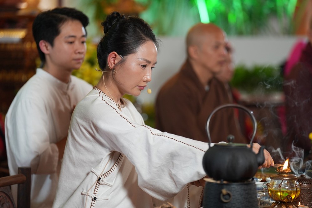 Trong giờ phút tĩnh lặng của không gian thiền trà nghi thức thiêng liêng dâng những chén trà đầu tiên lên Ban Tam Bảo đã được thực hiện bởi trà sư Sương Mai mở màn cho buổi thiền trà đầy lắng đọng.